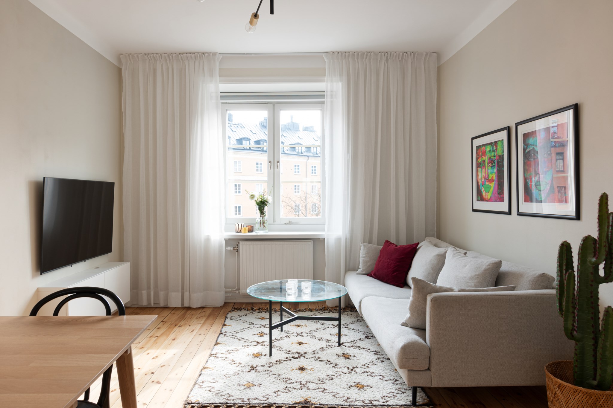 Luftigt vardagsrum med tidlösa ytskikt bestående av ljusa väggar i en beige nyans och ljust trägolv. I vardagsrummet inryms matgrupp, soffa, soffbord, TV-möbel samt annat möblemang efter smak och behov. Här möts du av ett härligt ljusinsläpp via ett stort fönster.
