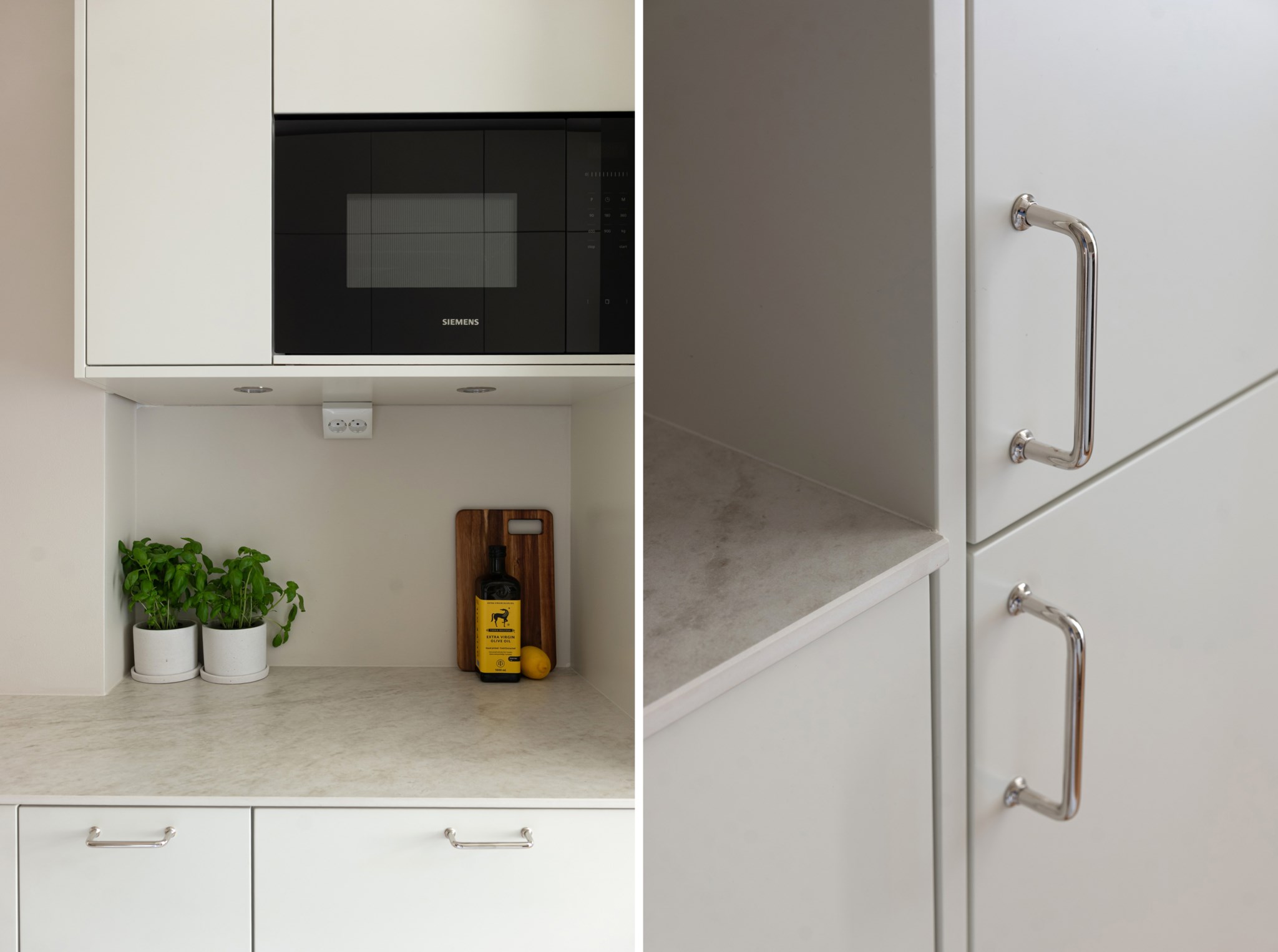 Modernt kök med smakfulla materialval bestående av ljusa köksluckor och ljus bänkskiva. Den maskinella utrustningen består av diskho, spis, ugn, micro, köksfläkt, diskmaskin samt kyl och frys. Tidlösa ytskikt bestående av ljusa väggar i en beige nyans och ljust trägolv.