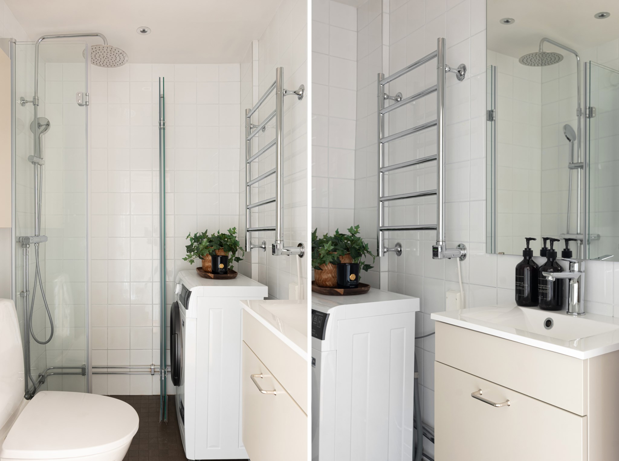 Rymligt badrum med ljust kakel och mörkt klinker. Badrummet är utrustat med WC, handdukstork, handfat ovan kommod, spegel samt dusch med glasväggar. Extra bekvämligheter genom en tvättmaskin.