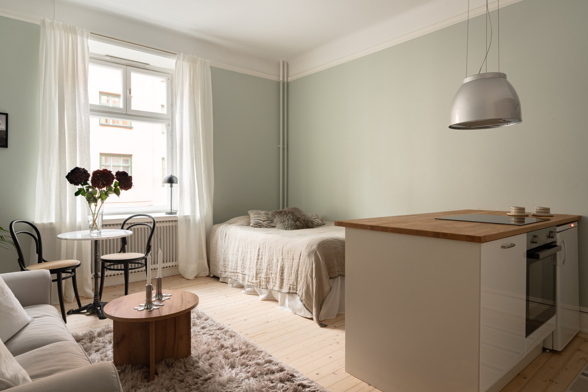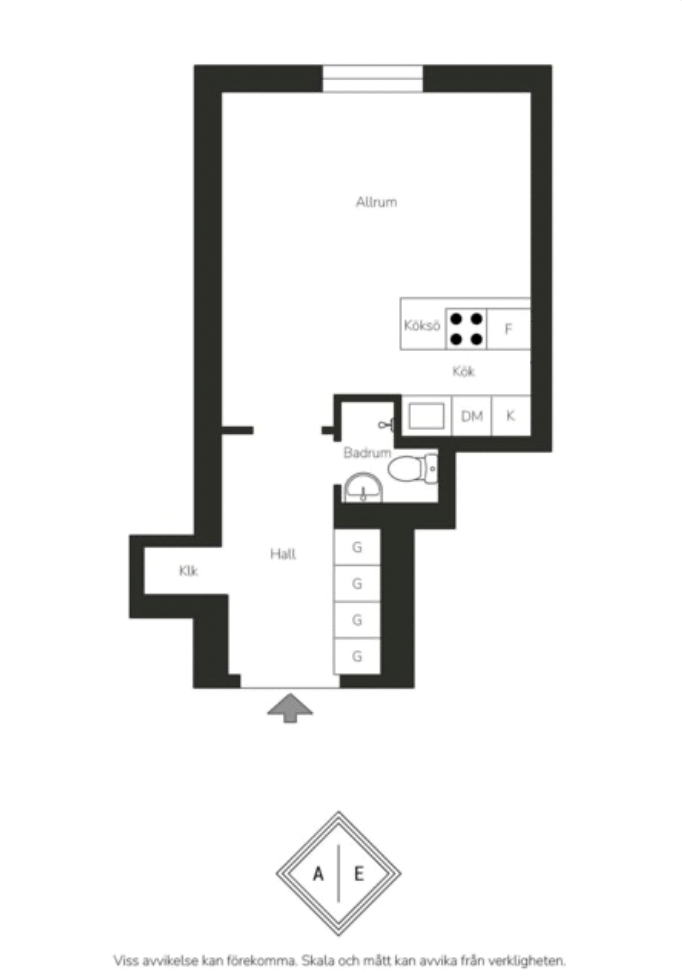 Luftigt och lättmöblerat allrum i öppen planlösning med kök. Här finns gott om plats för säng om 140 cm, soffa, soffbord, mindre matgrupp och annat möblemang efter smak och behov. I allrummet möts du av ett härligt ljusinsläpp via stort fönster. Ytskikten består av ljusa väggar i väl utvald kulör samt ljust, nyslipat trägolv.