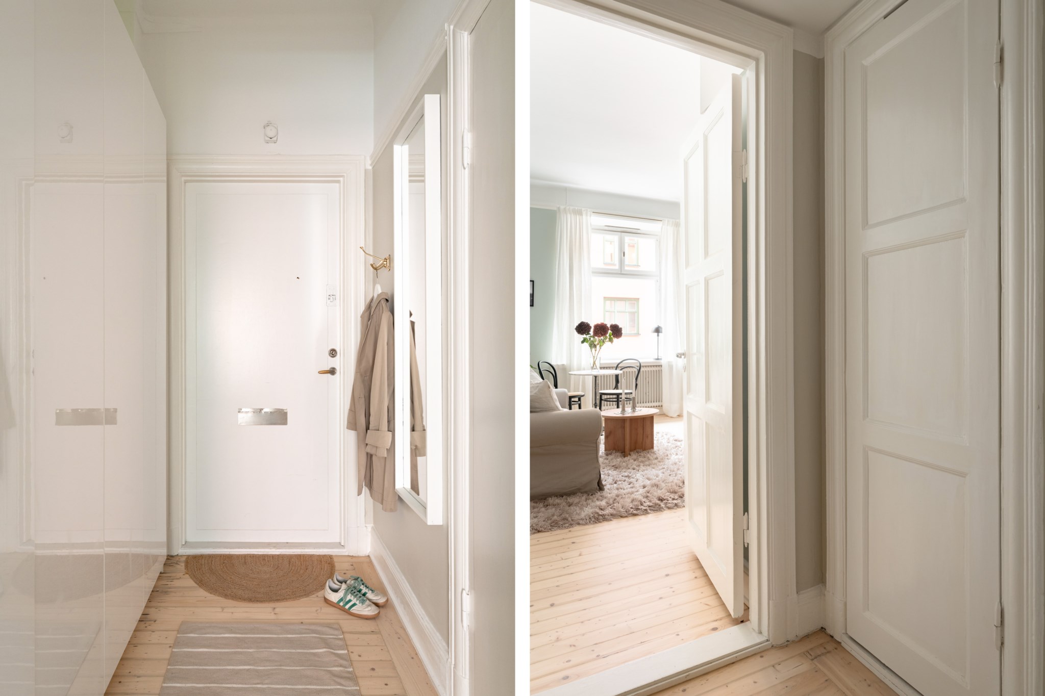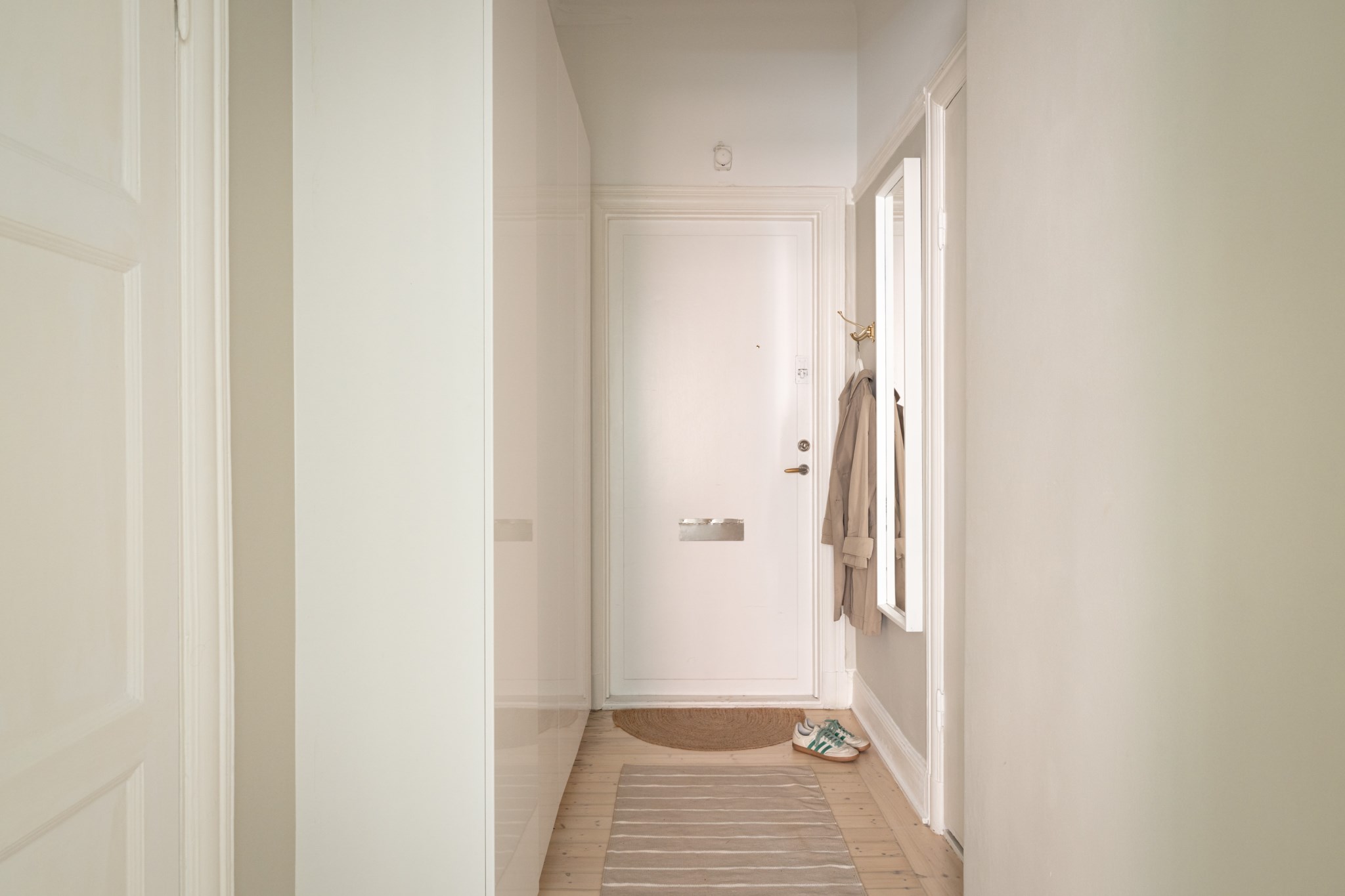 Välkomnande hall med gott om plats för avhängning. Här finns även generöst med förvaringsmöjligheter via garderober och intilliggande klädkammare. Smakfulla ytskikt bestående av väggar i ljusbeige nyans och ljust, välbevarat trägolv.