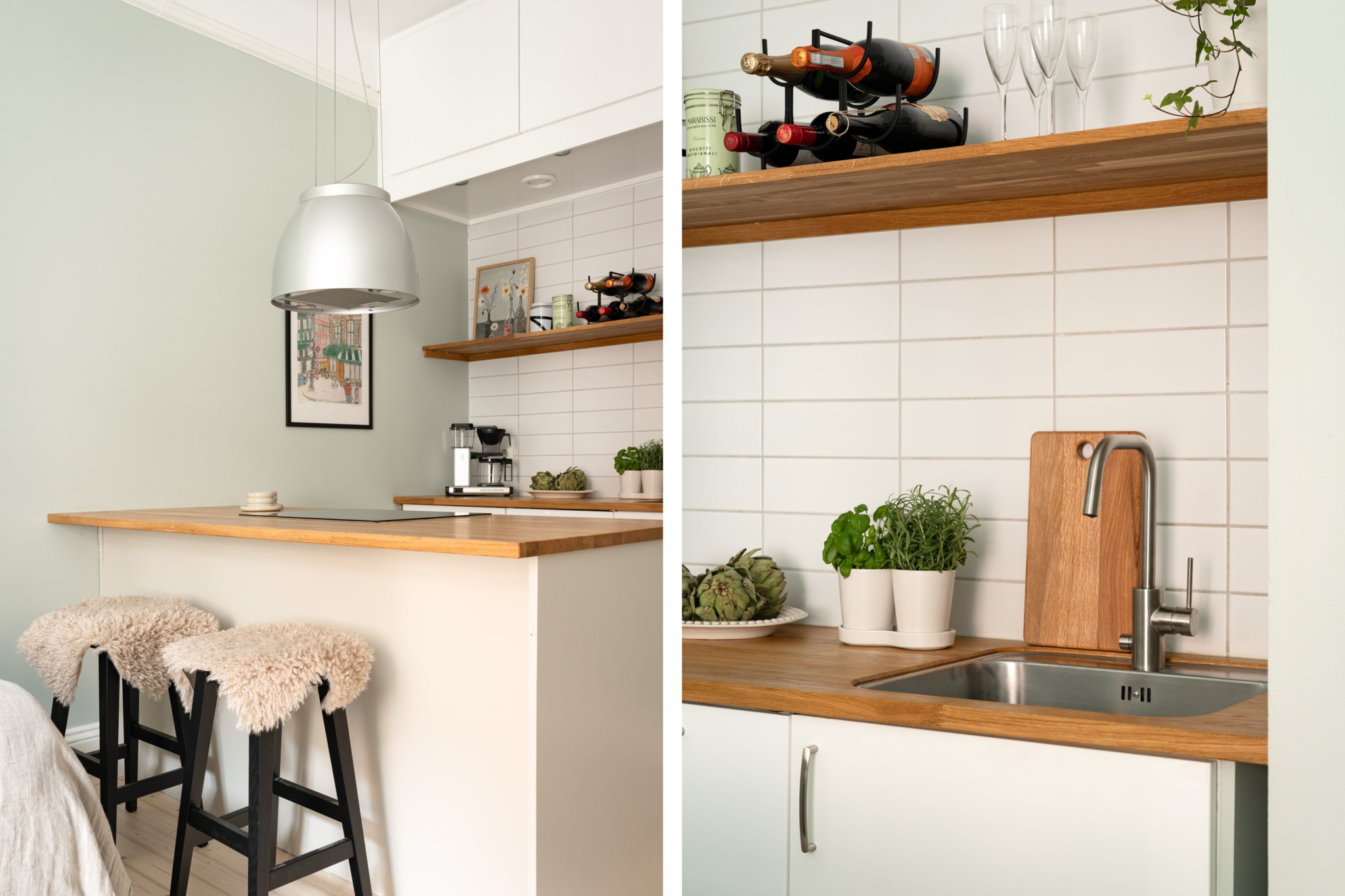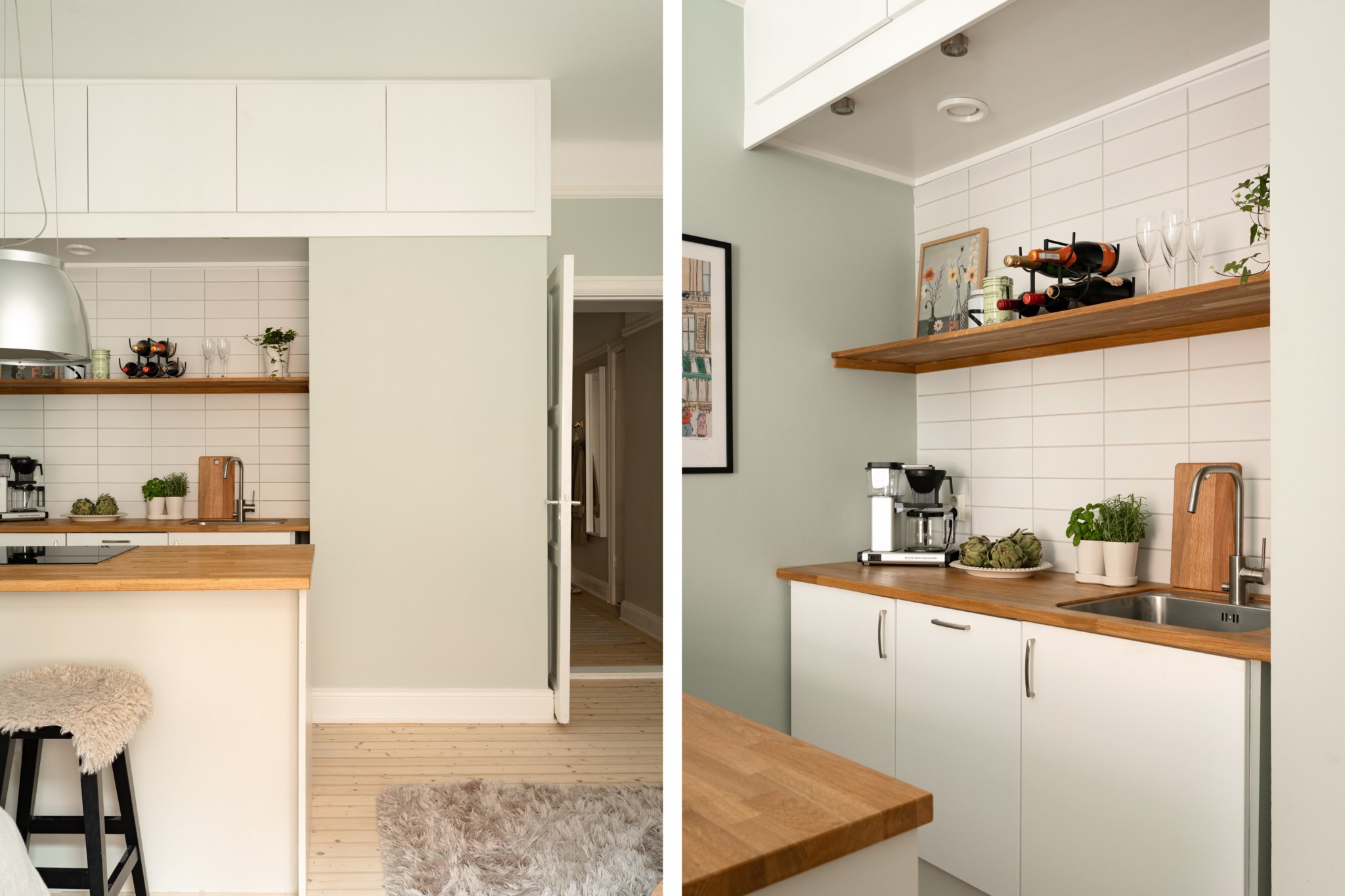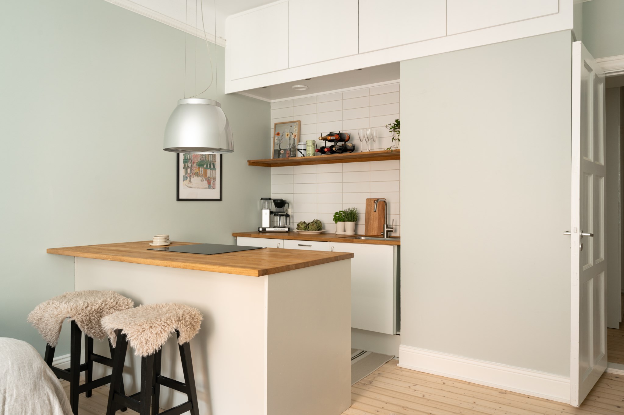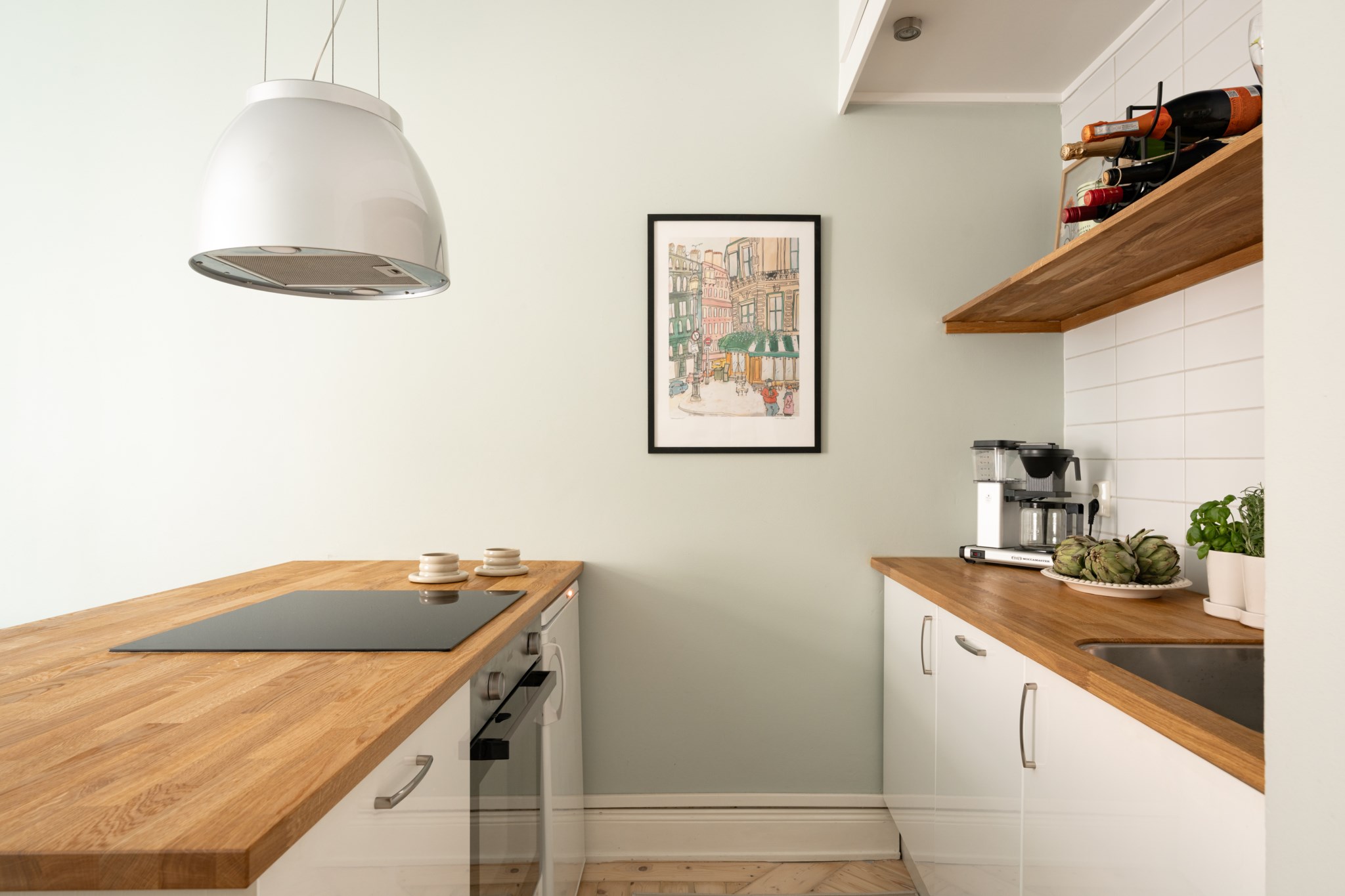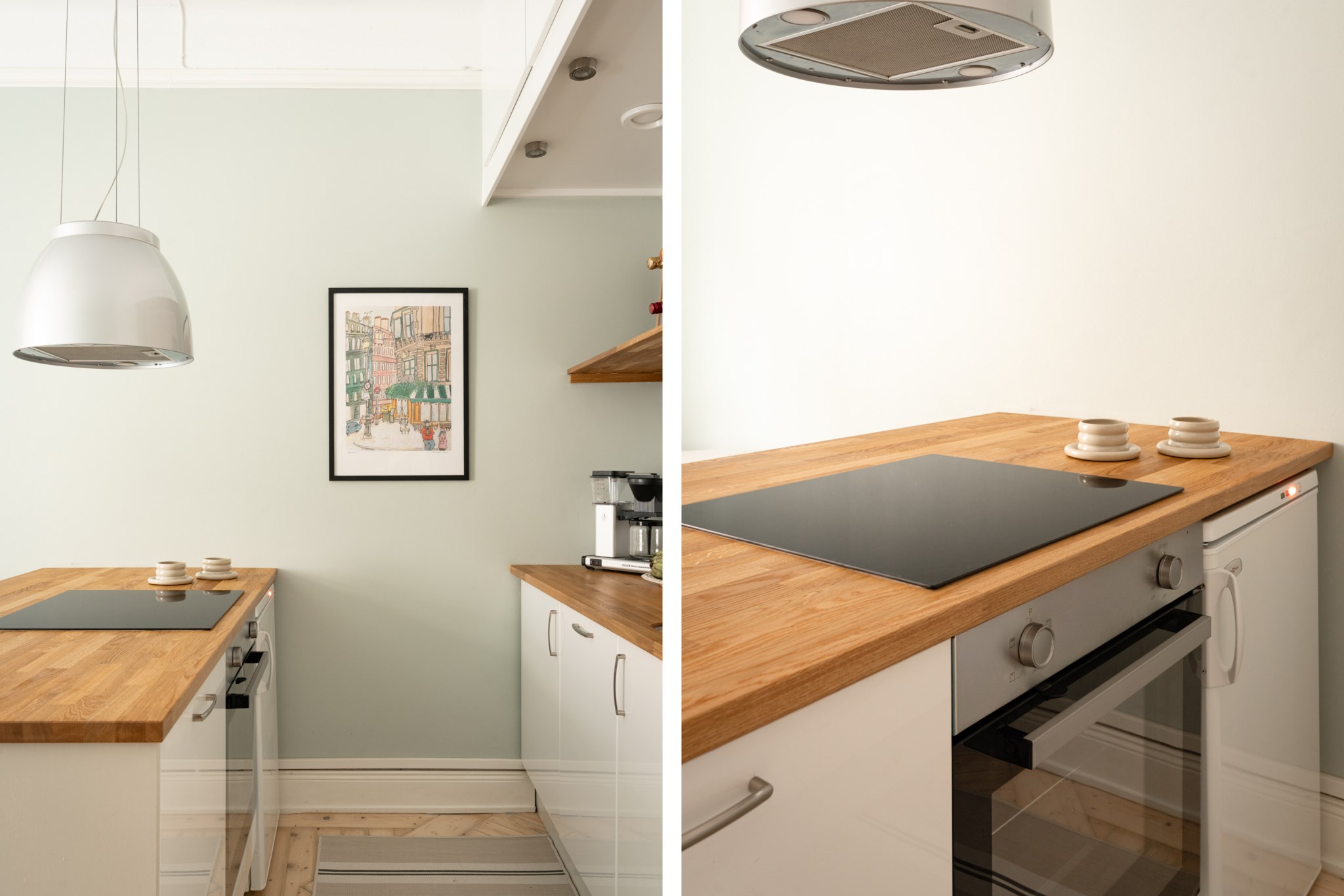 Socialt beläget kök med tidlösa materialval bestående av vita köksluckor och ny bänkskiva i ek. Köket har även en praktisk köksö med plats för barstolar. Den maskinella utrustningen består av spishäll (ny), köksfläkt, ugn (ny), diskmaskin, diskho (ny) samt kyl och frys. Smakfulla ytskikt bestående av ljusa väggar i väl utvald kulör samt ljust, nyslipat trägolv.