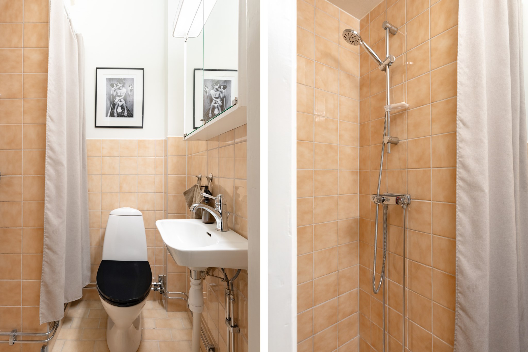 Välplanerat badrum med ljust kakel och klinker. Badrummet är utrustat med WC, handfat och dusch. Förvaring finns via spegelskåp.