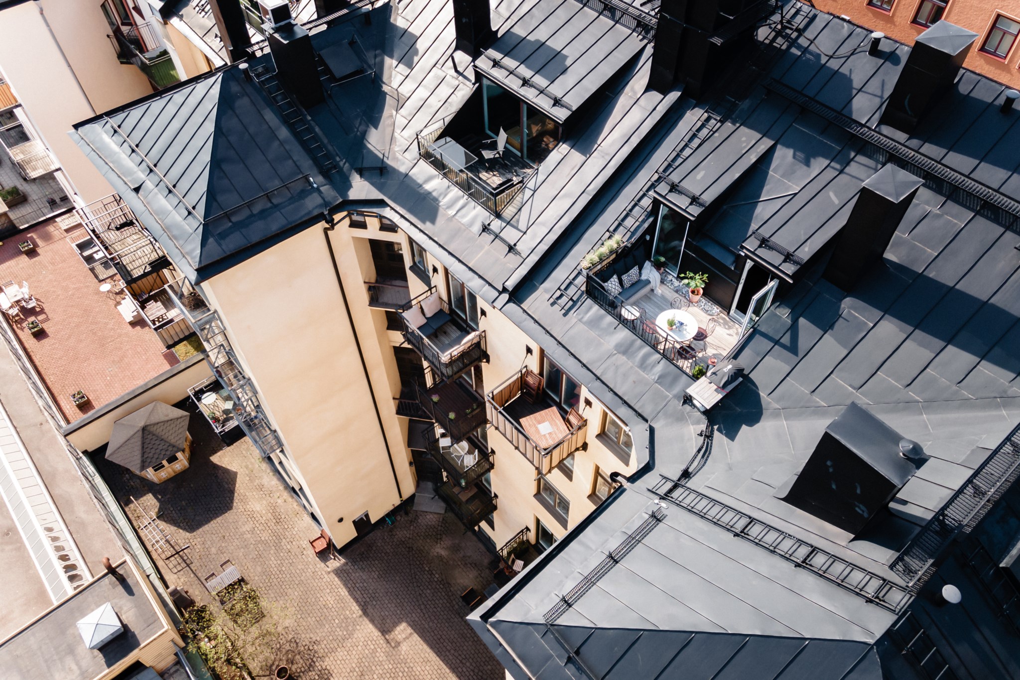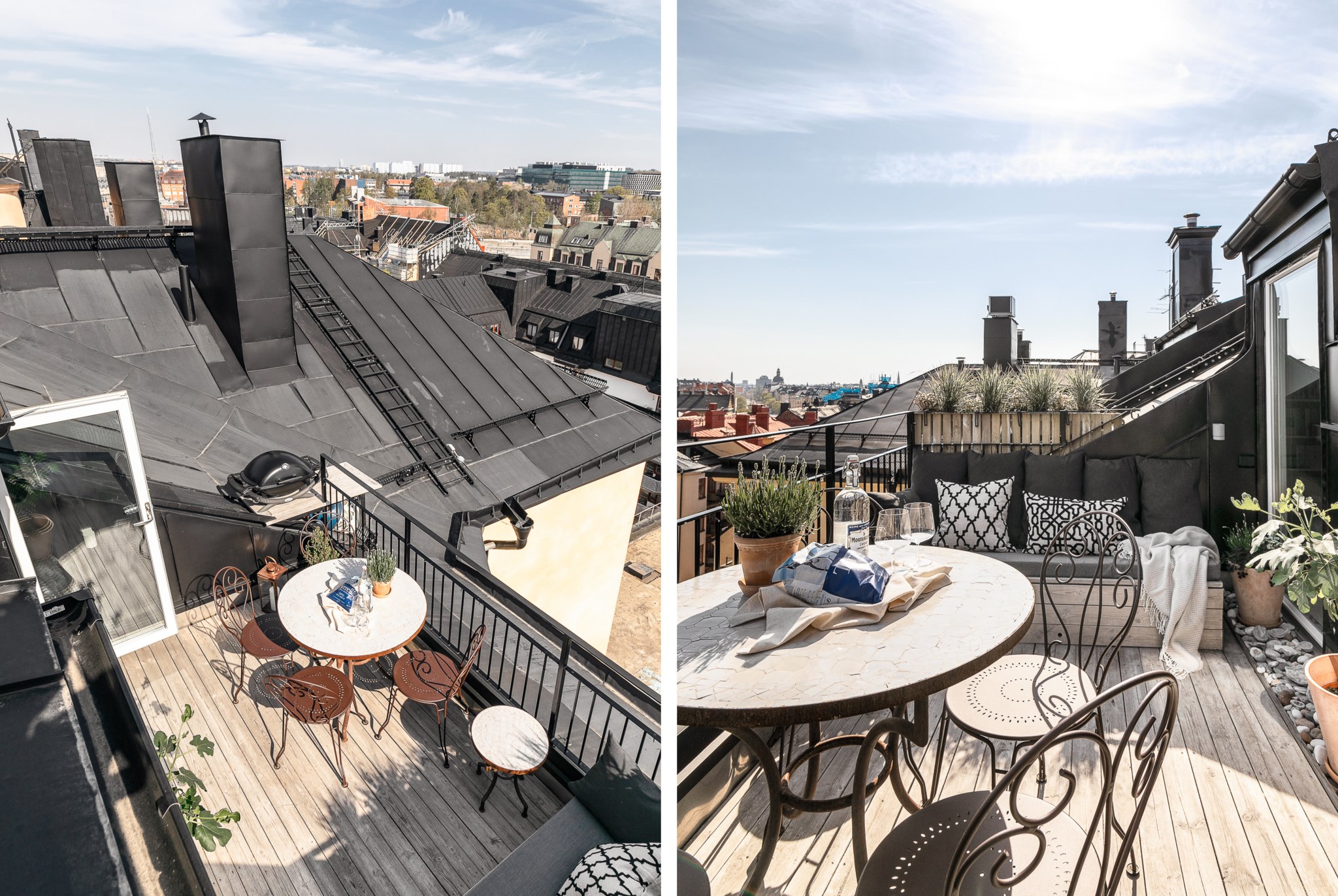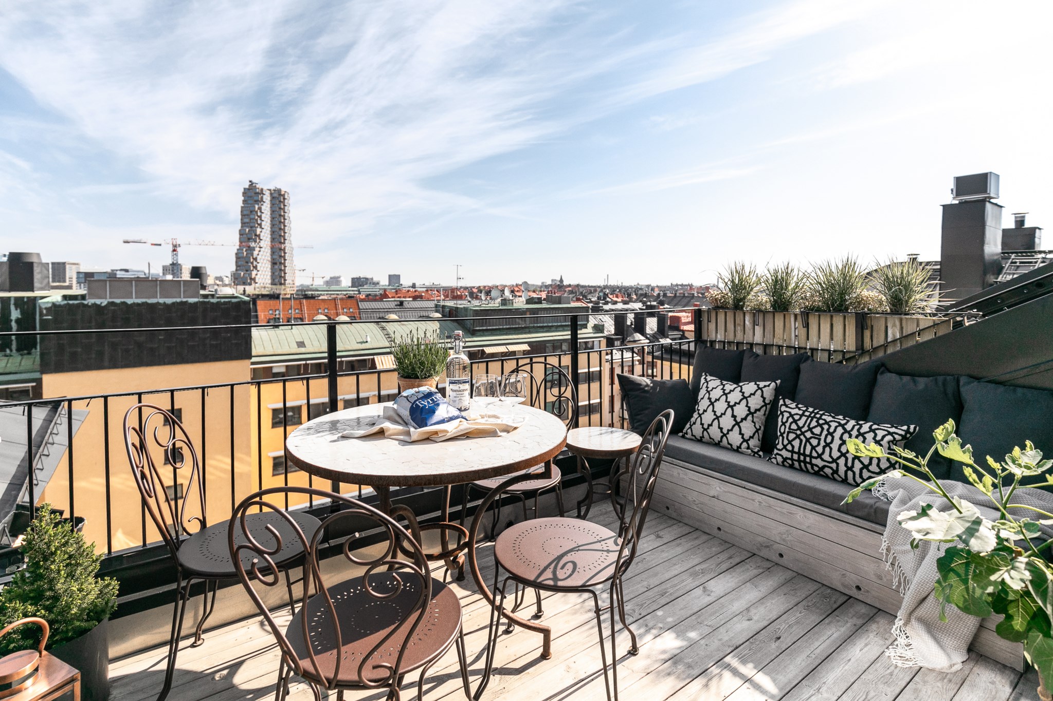 Magisk terrass högst upp i huset med svårslagen vy över himmel och takåsar. Plats för diverse utemöbler samt ett förråd där det finns utrymme för kuddar och diverse utemöbler.