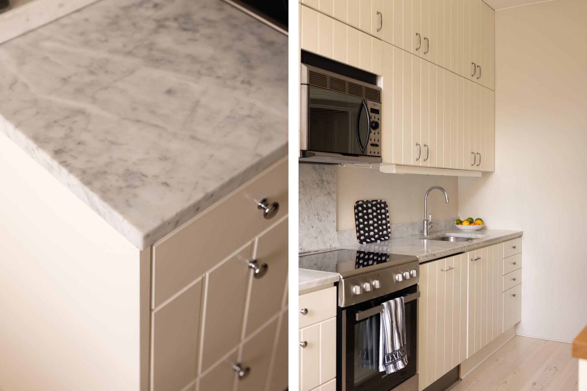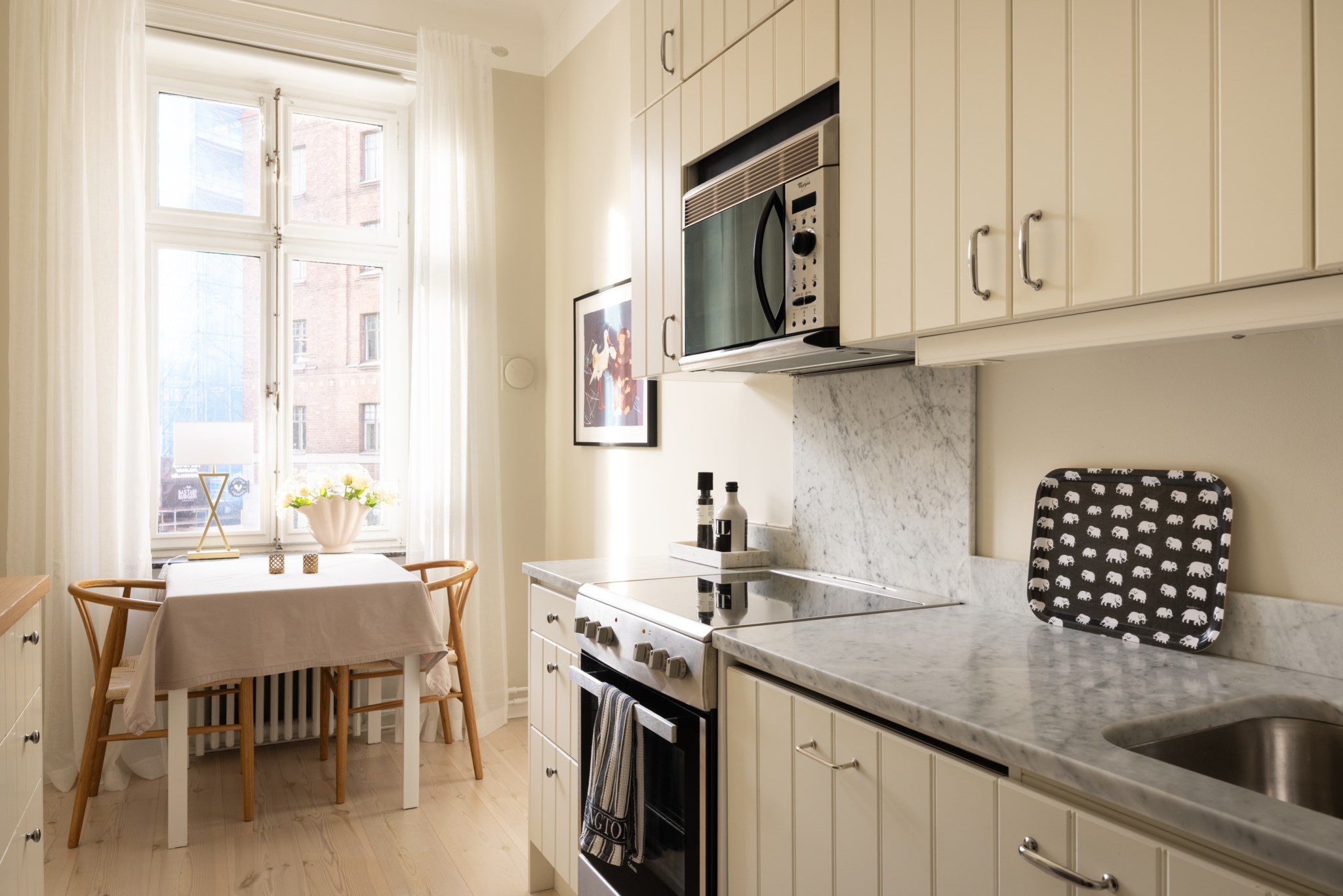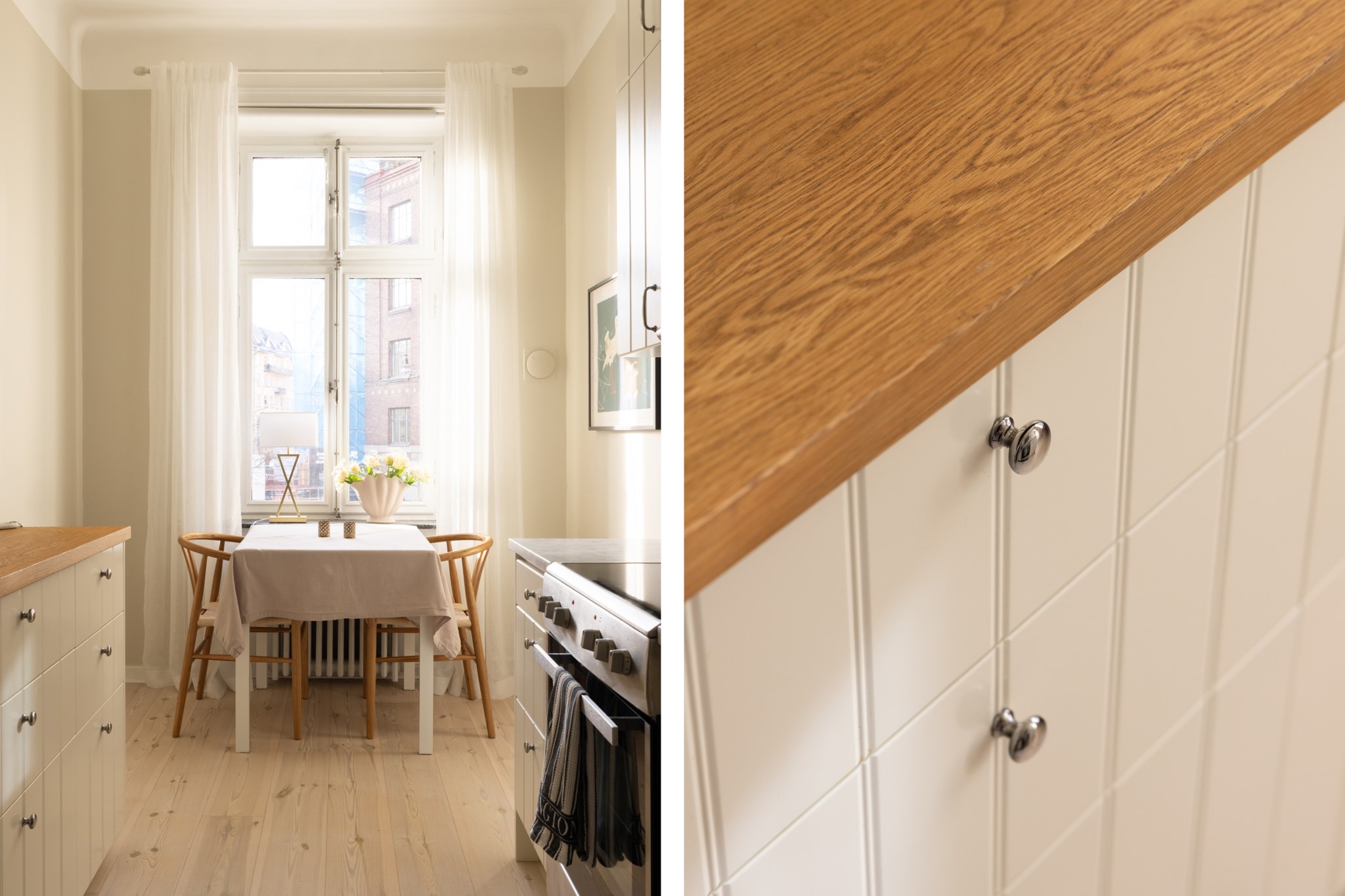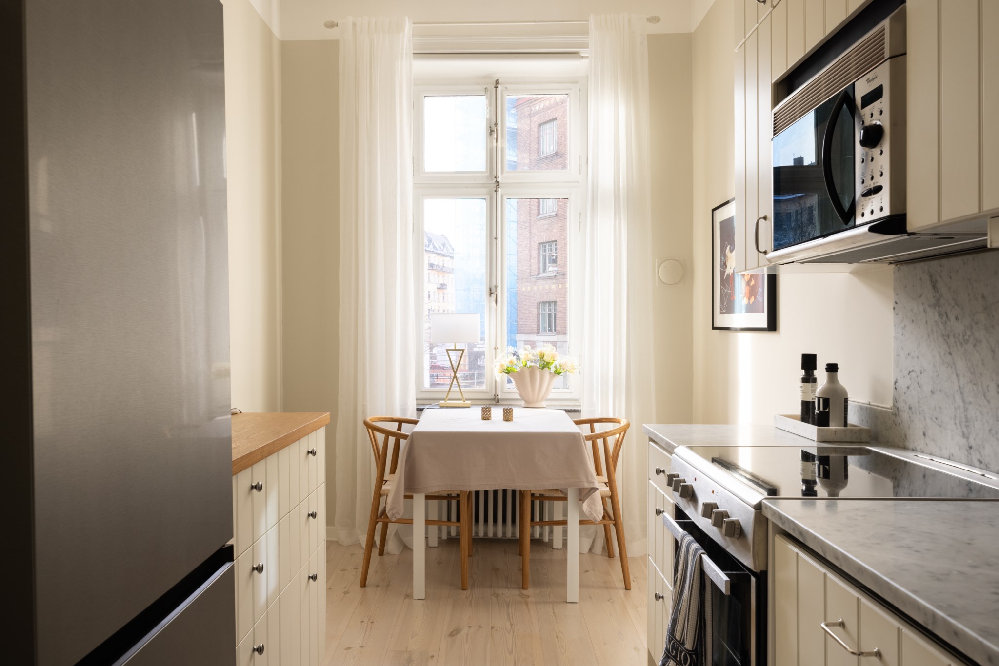 Modernt kök med smakfulla materialval bestående av ljusa köksluckor och ljus bänkskiva i marmor med stänkskydd ovan. Den maskinella utrustningen består av diskho, spis, ugn micro, diskmaskin samt kyl och frys. I köket finns plats för en matgrupp och ett härligt ljusinsläpp tar sig in via ett stort fönster. Tidlösa ytskikt bestående av ljusa väggar och ljust trägolv.