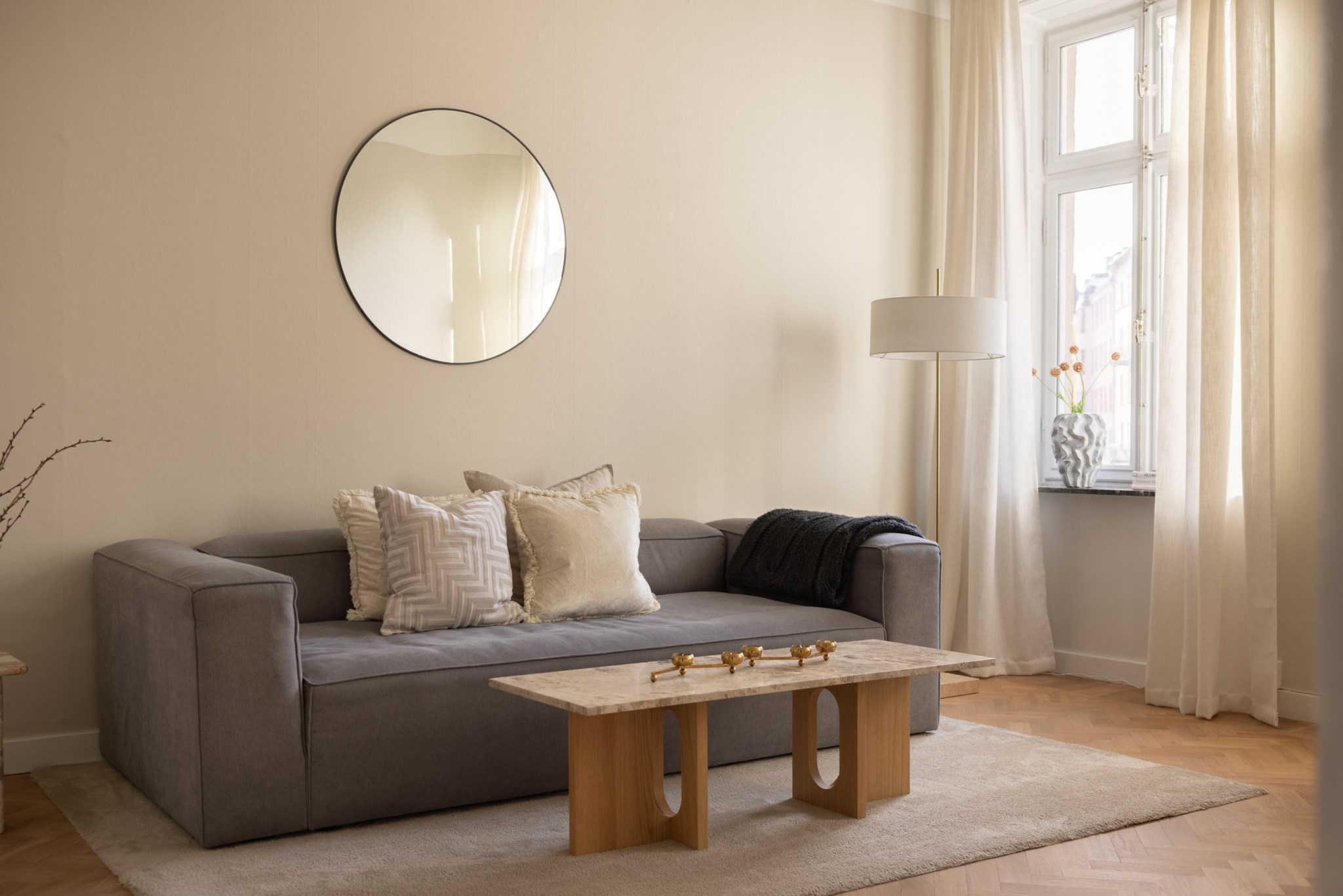 Luftigt vardagsrum med tidlösa ytskikt bestående av ljusa väggar och ljus fiskbensparkett. I vardagsrummet inryms soffa, soffbord, TV-möbel samt annat möblemang efter smak och behov. Här möts du av ett härligt ljusinsläpp via stora fönsterpartier. Taket pryds av vackra stuckaturer.
