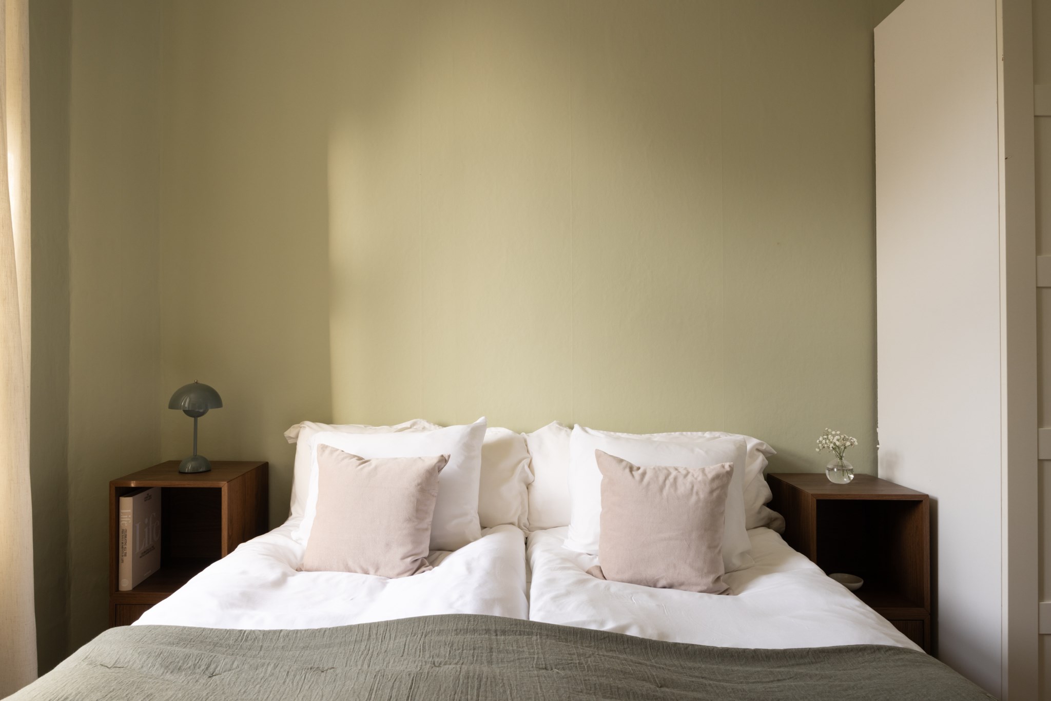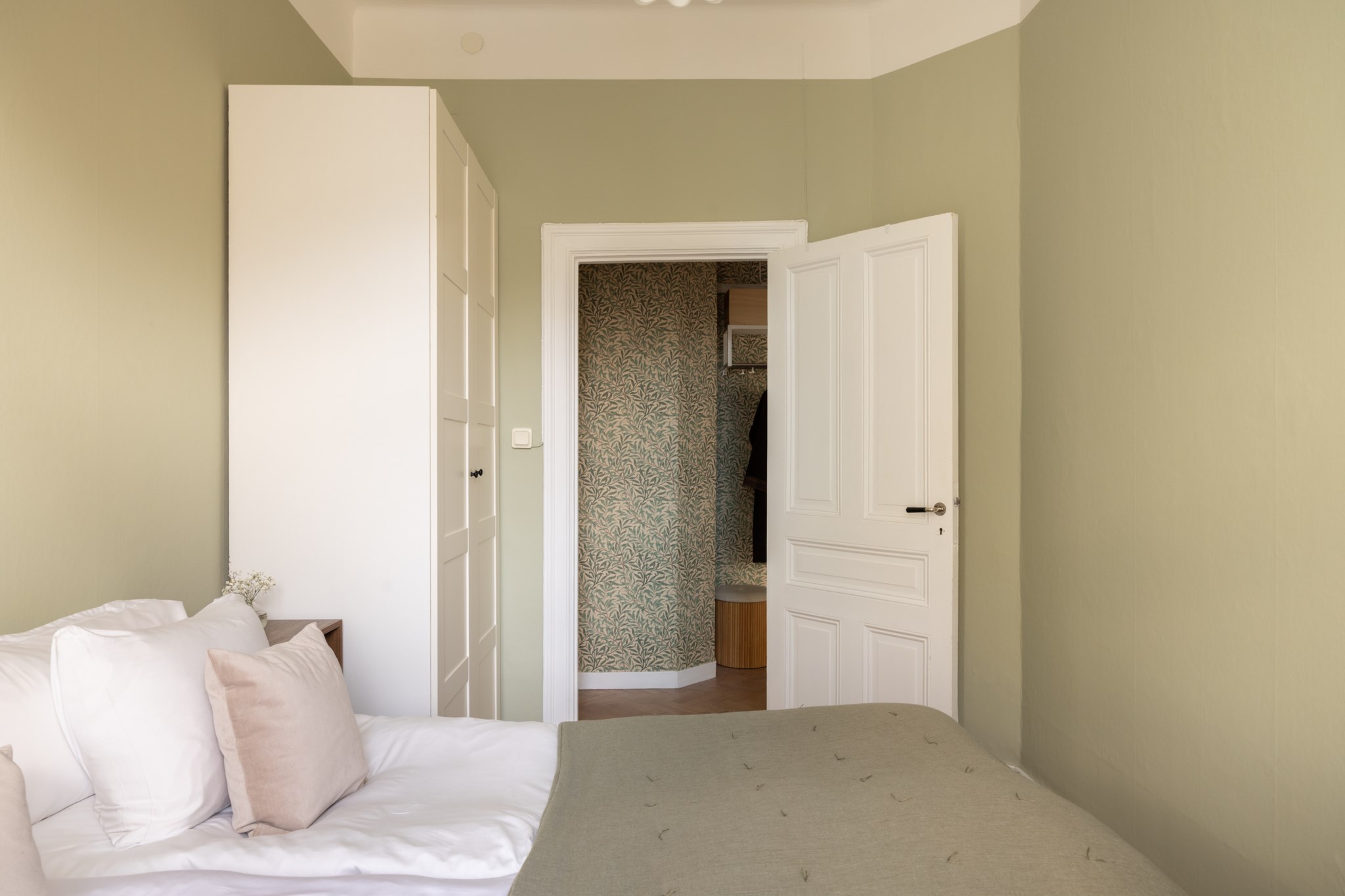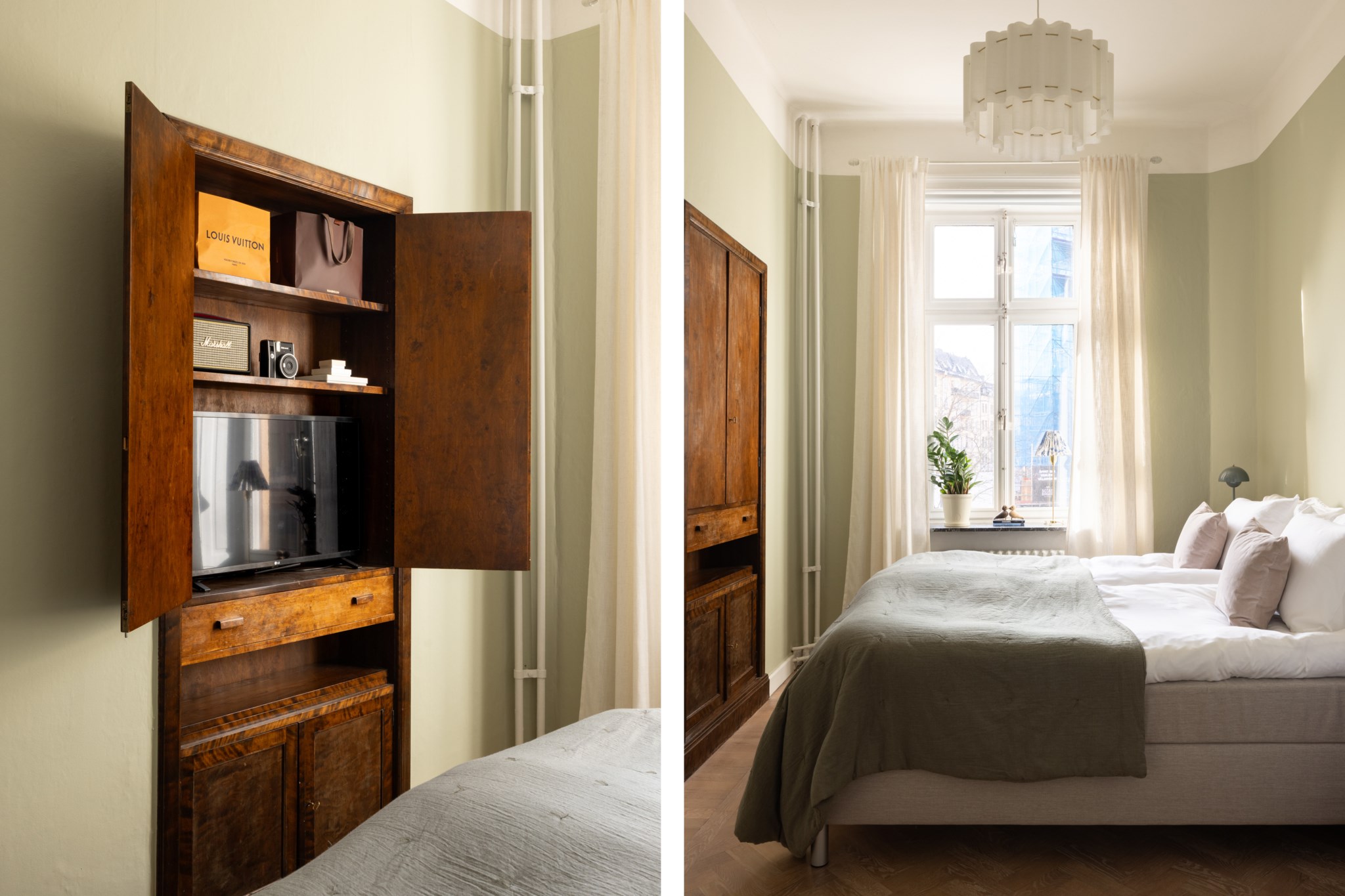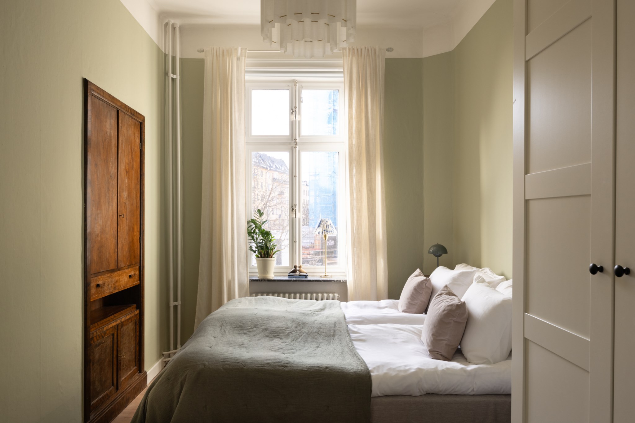 Stort sovrum med plats för dubbelsäng och annat möblemang efter smak och behov. Gott om plats för förvaring via platsbyggda garderober. Ett härligt ljusinsläpp tar sig in via ett stort fönster. Tidlösa ytskikt bestående av ljusa väggar i en grön nyans och ljus fiskbensparkett.