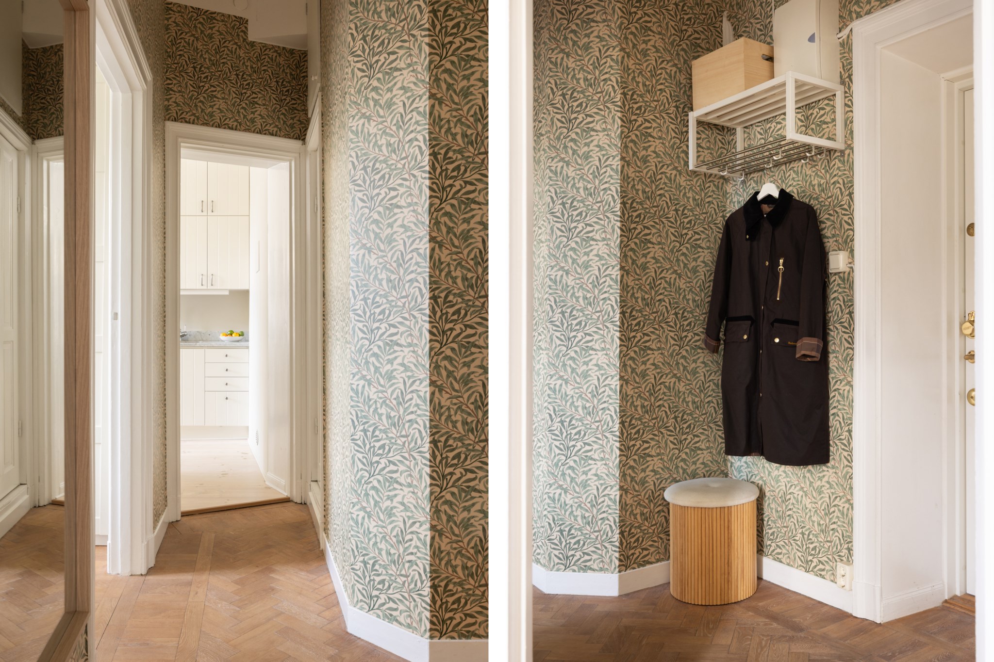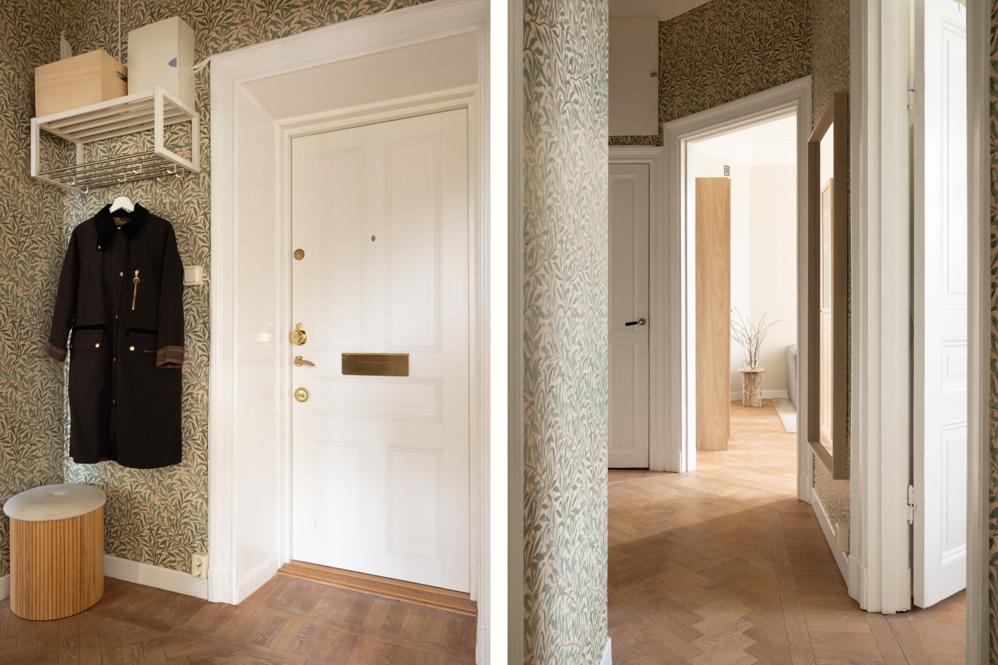 Välkomnande hall med plats för avhängning, skoställ samt mindre avlastningsmöblemang efter smak och behov. Tidlösa ytskikt bestående av ljusa väggar i en grön tapet och ljus fiskbensparkett.