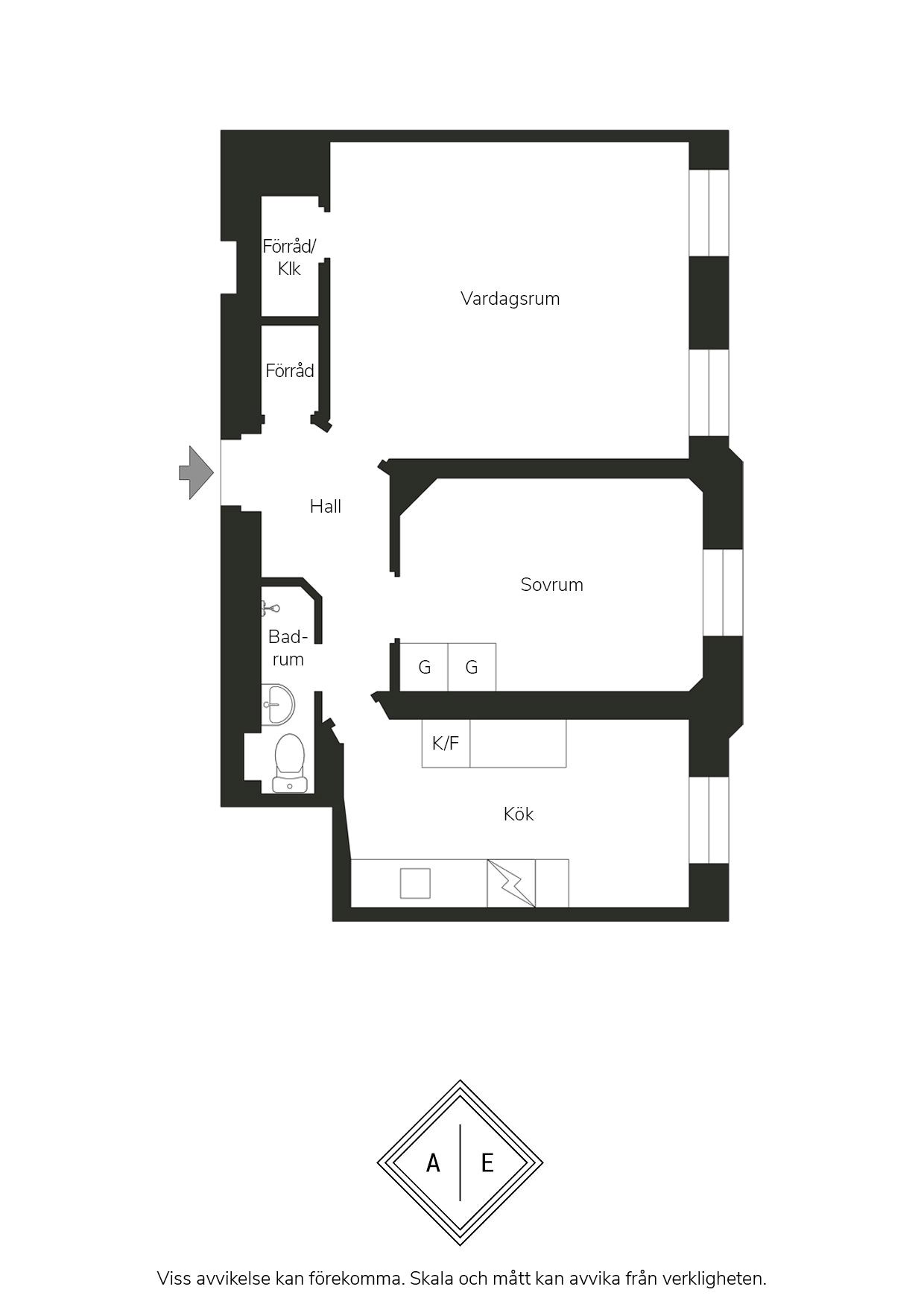 Till lägenheten hör ett vinds och ett källarförråd samt en matkällare.