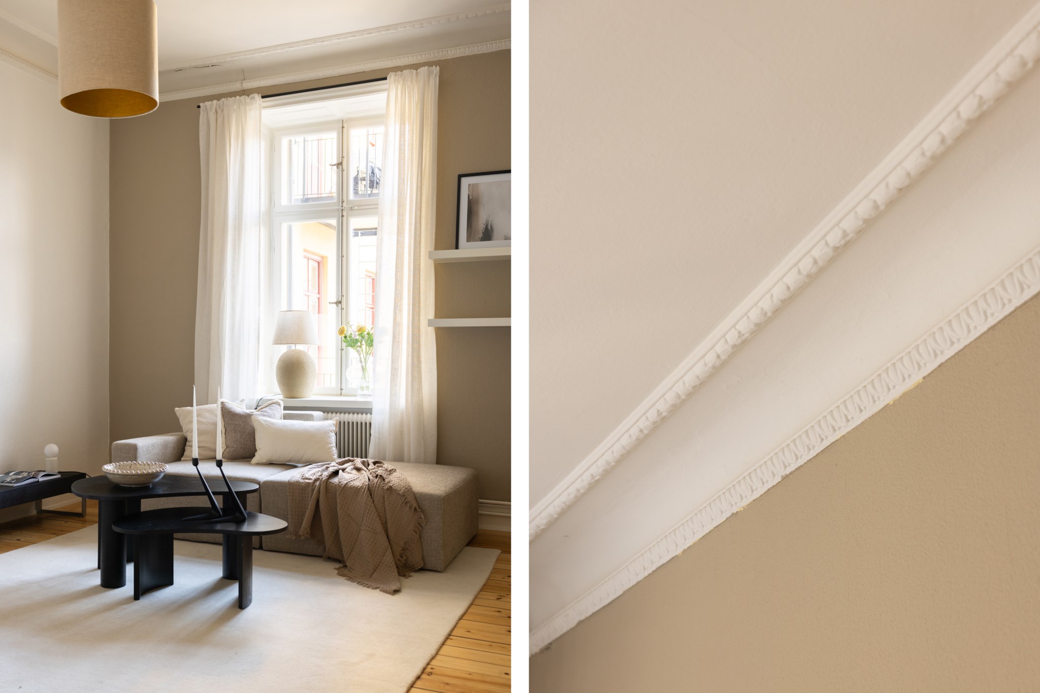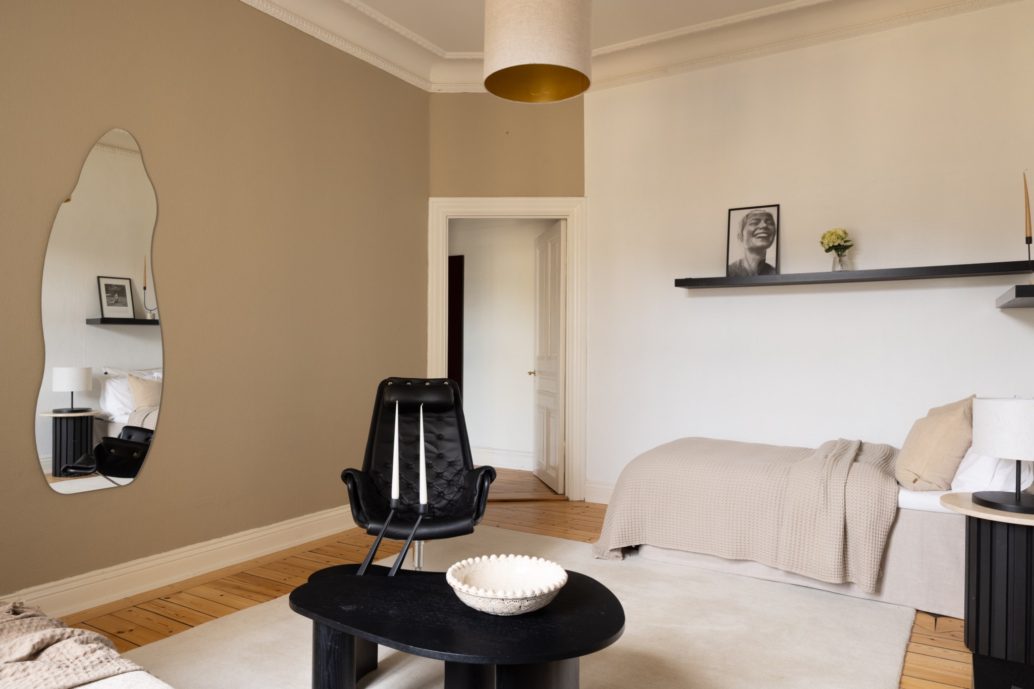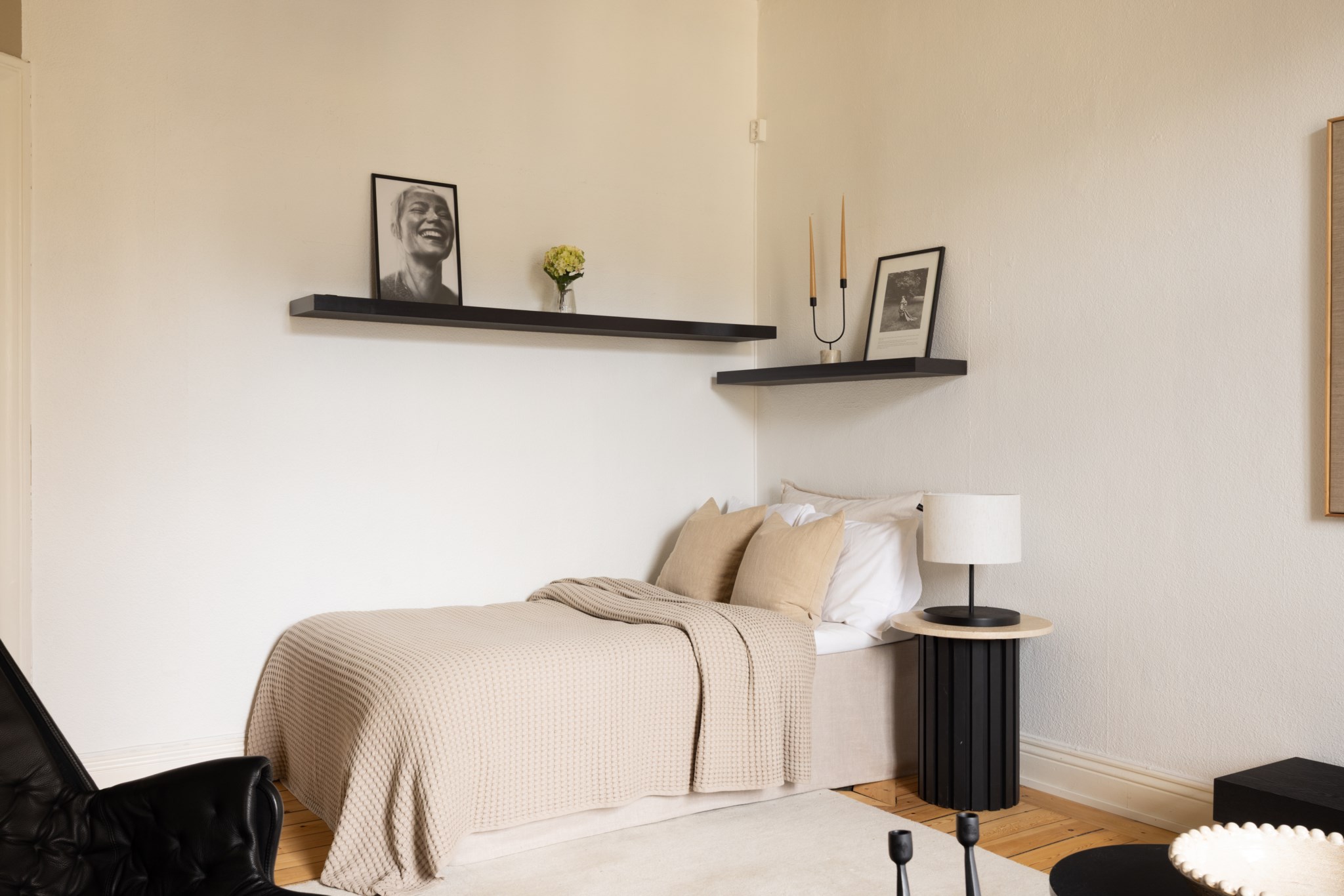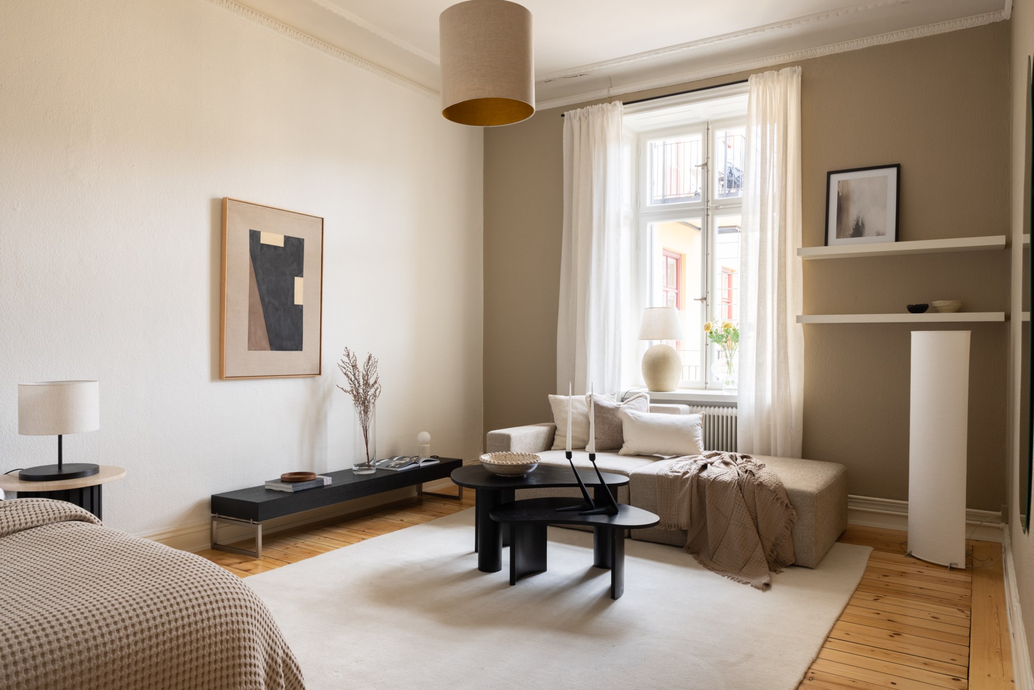Luftigt allrum med smakfulla ytskikt bestående av ljusa väggar och ljust trägolv. Här inryms säng, soffa, soffbord, TV-möbel och annat möblemang efter smak smak och behov. Ett härligt ljusinsläpp tar sig in via fönster och taket pryds av vackra stuckaturer.