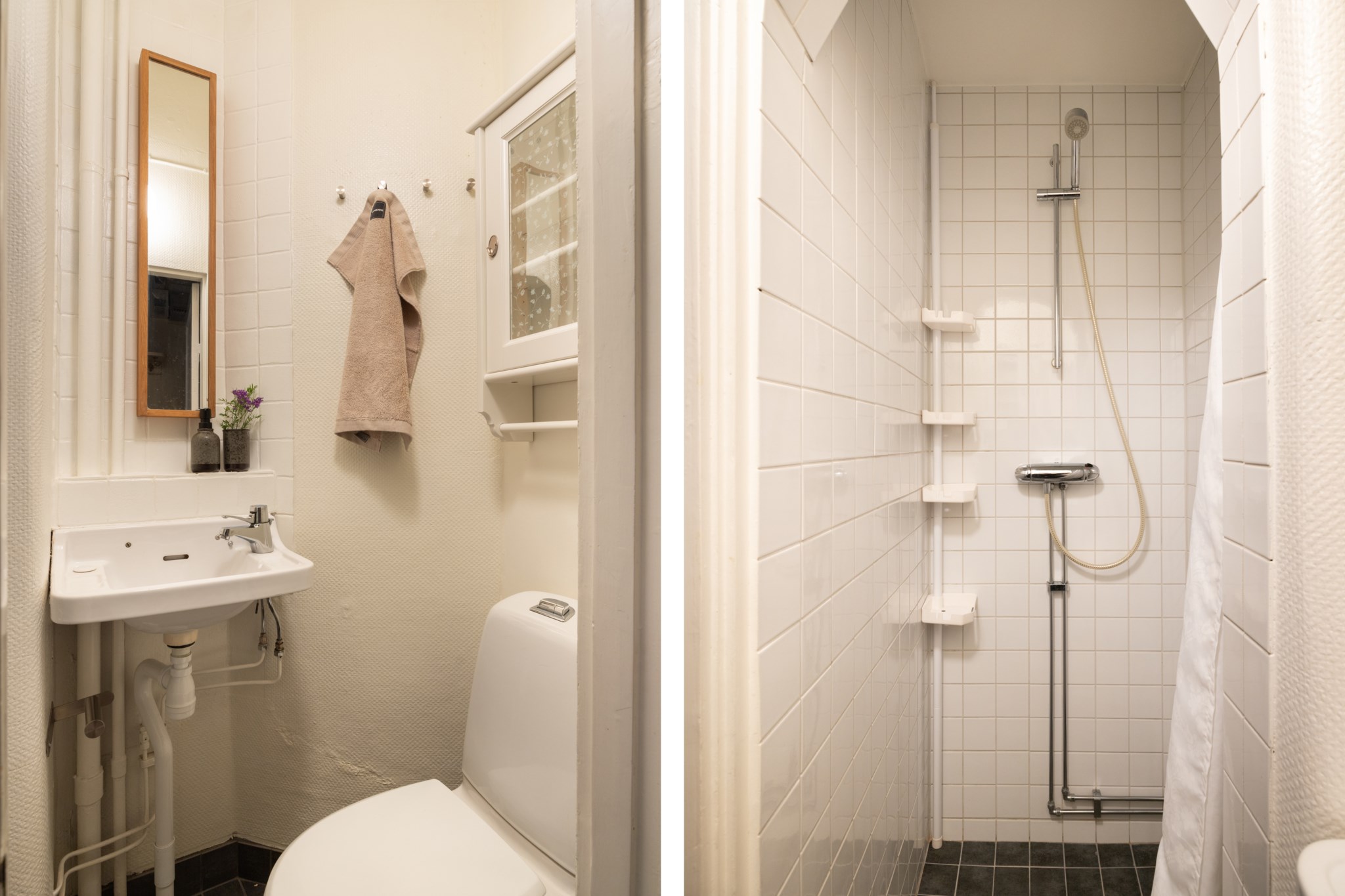 Välplanerat badrum med ljusa väggar (delvis kakel) samt mörkt klinker. Badrummet är utrustat med WC, spegel, vägghängt skåp, handfat samt dusch.
