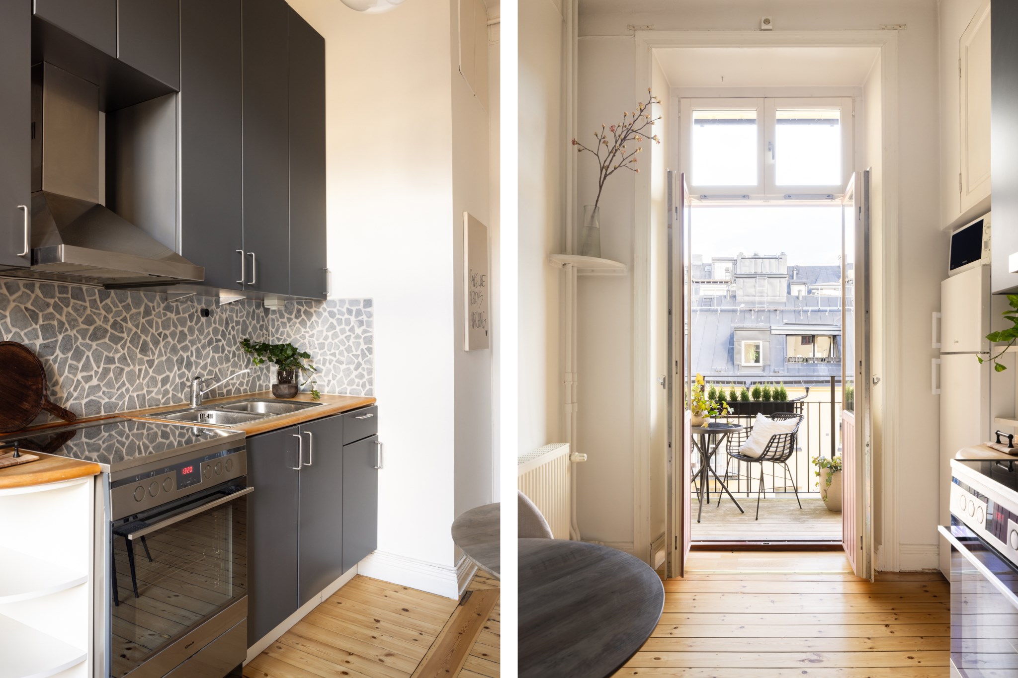 Stort kök med smakfulla materialval bestående av mörka köksluckor och arbetsyta ovan bänkskiva i trä. Tidlösa ytskikt i form av ljusa väggar och ljust trägolv. Köket inrymmer mindre matbord och annat möblemang efter önskemål. Den maskinella utrustningen består av diskho, spis, fläkt, ugn, micro samt kyl och frys. Från köket nås även den mysiga balkongen via dubbeldörrar.