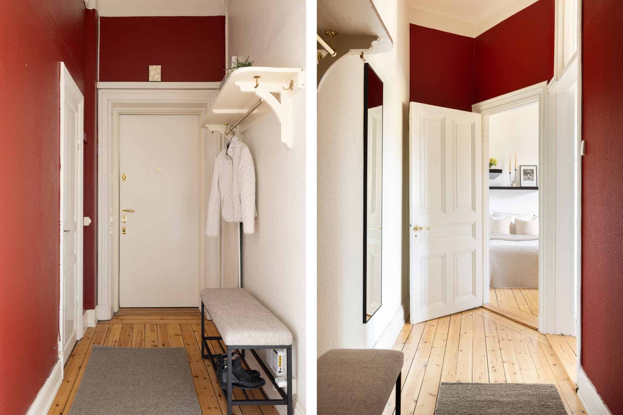 Rymlig och välkomnande hall med plats för avhängning och skoställ. Ytskikten består av väggar i en mörk nyans och ljust trägolv. Hallen erbjuder gott om förvaring via garderob.