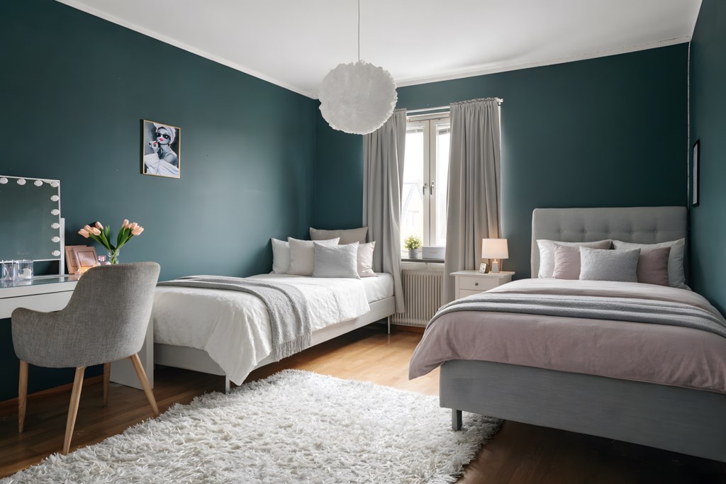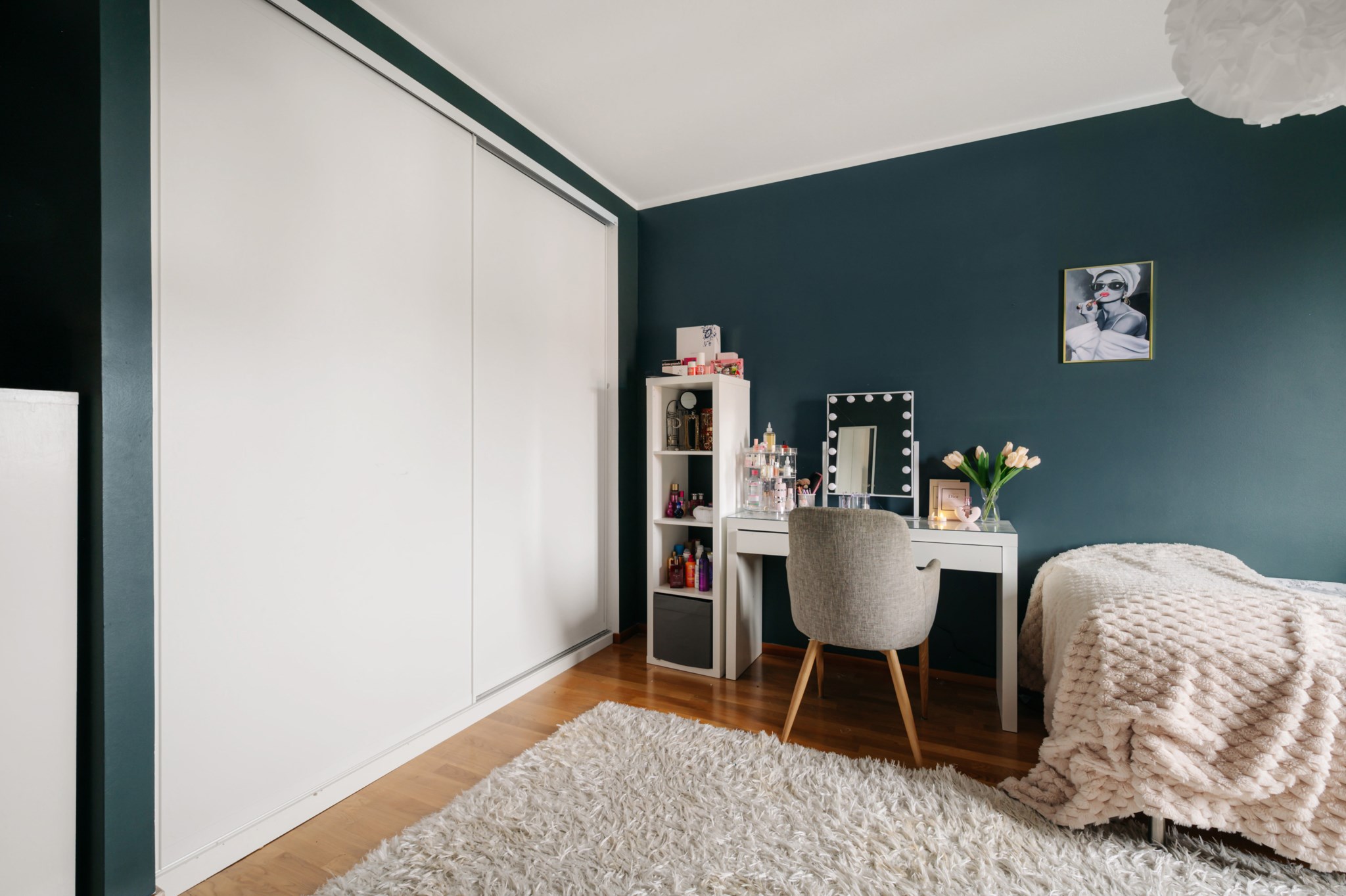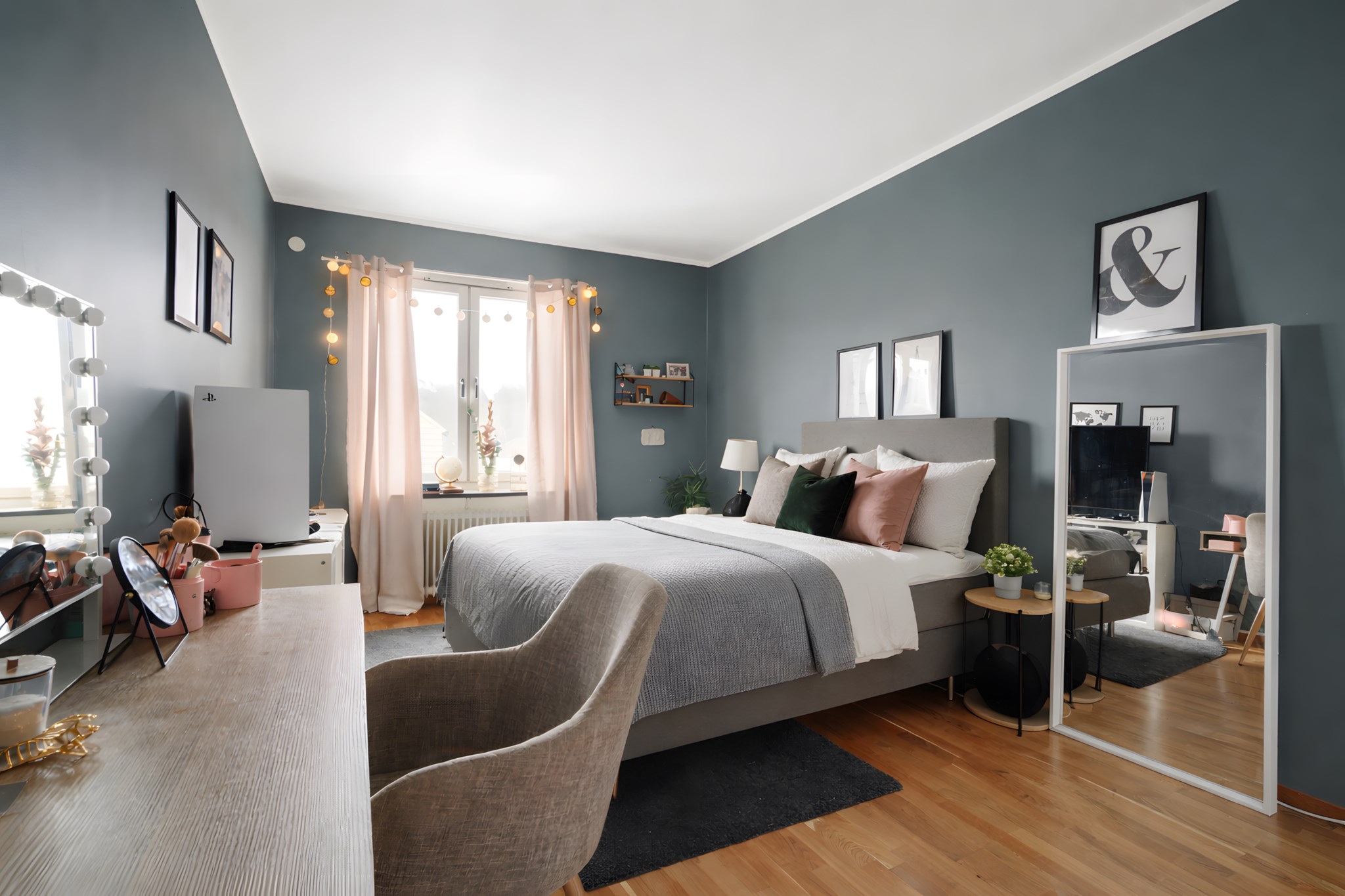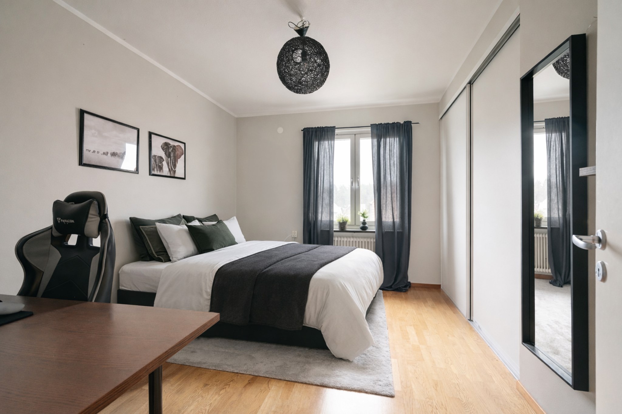 Rogivande sovrum med målade väggar, parkettgolv och plats för en bekväm säng och sängbord. Ljus från fönster utan insyn. Gott om förvaring i skjutdörrsgarderob.