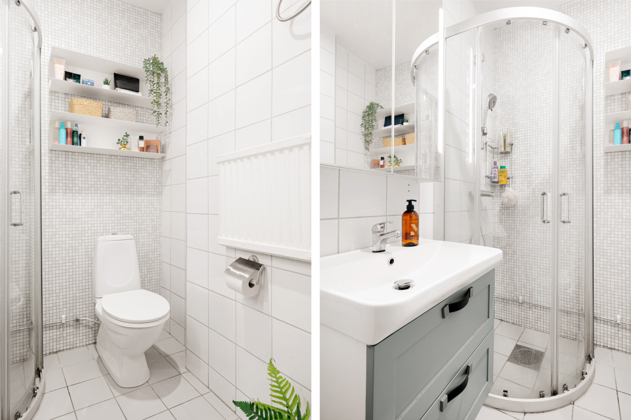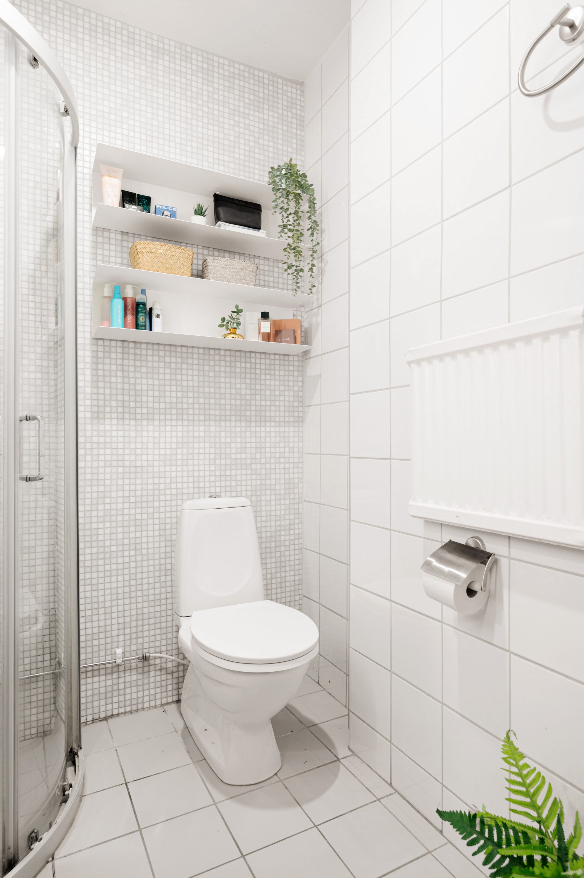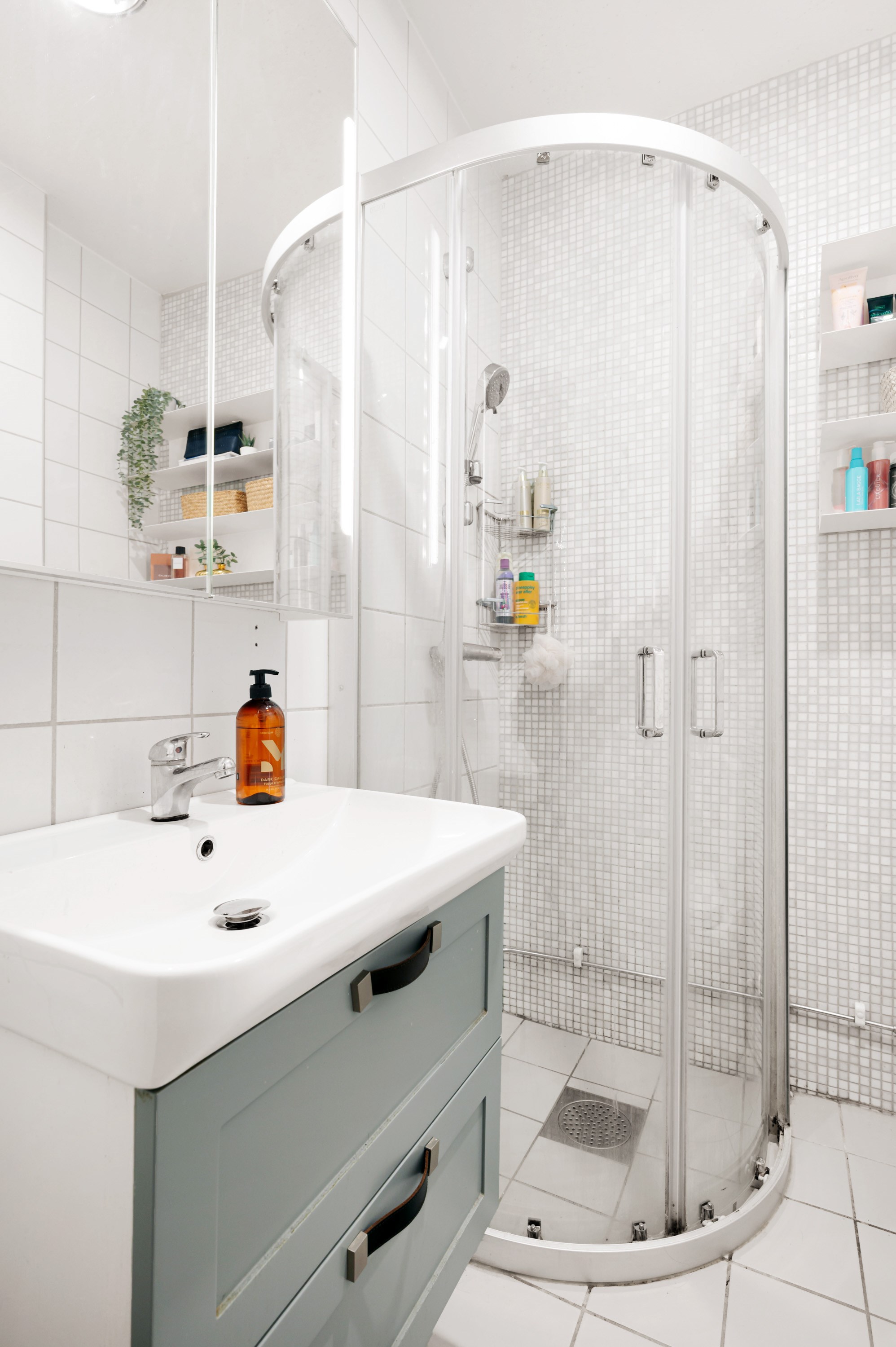 Helkaklat badrum med ljusa väggar och golv. Badrummet är utrustat med wc, kommod, badrumsskåp med spegelväggar, golvvärme, vattenburen handdukstork samt dusch med böjda skjutbara duschväggar i klarglas.