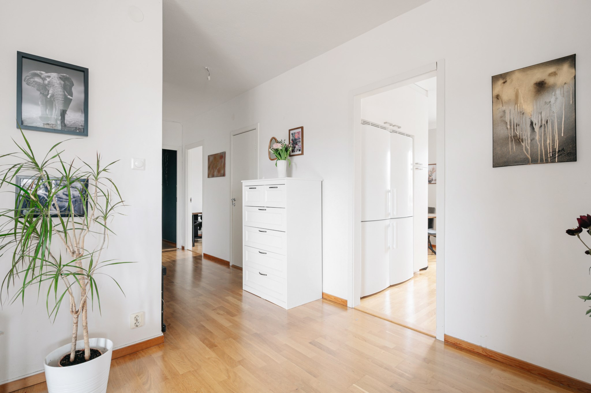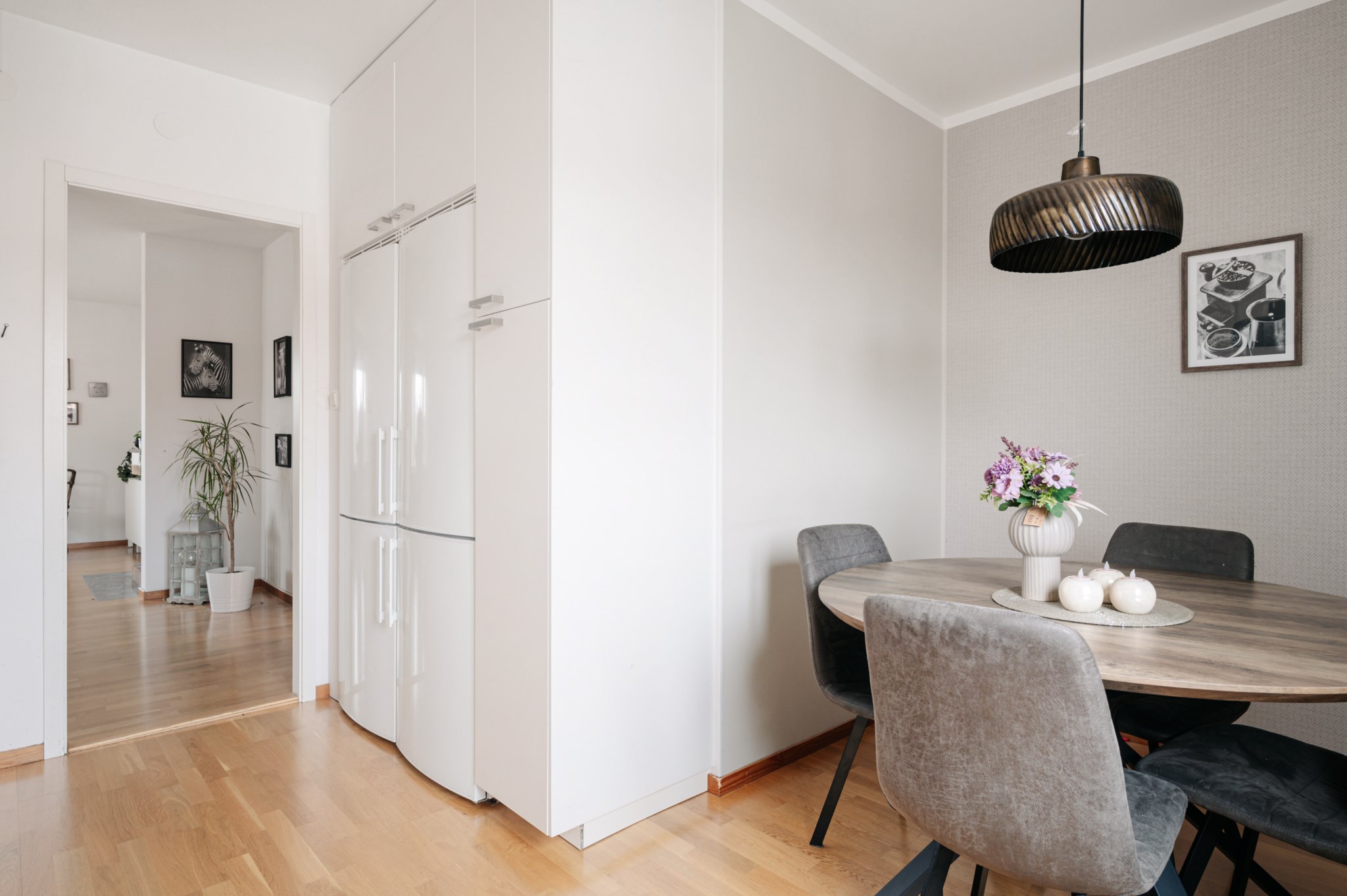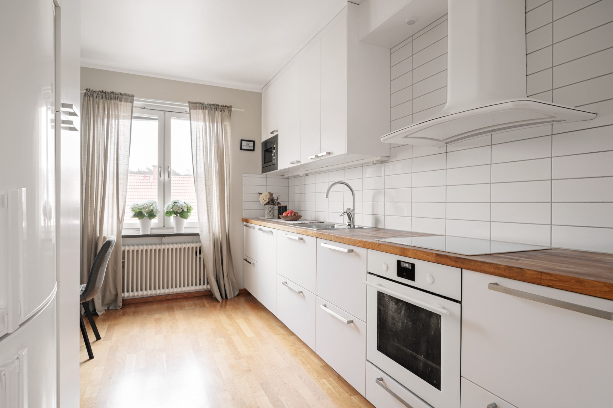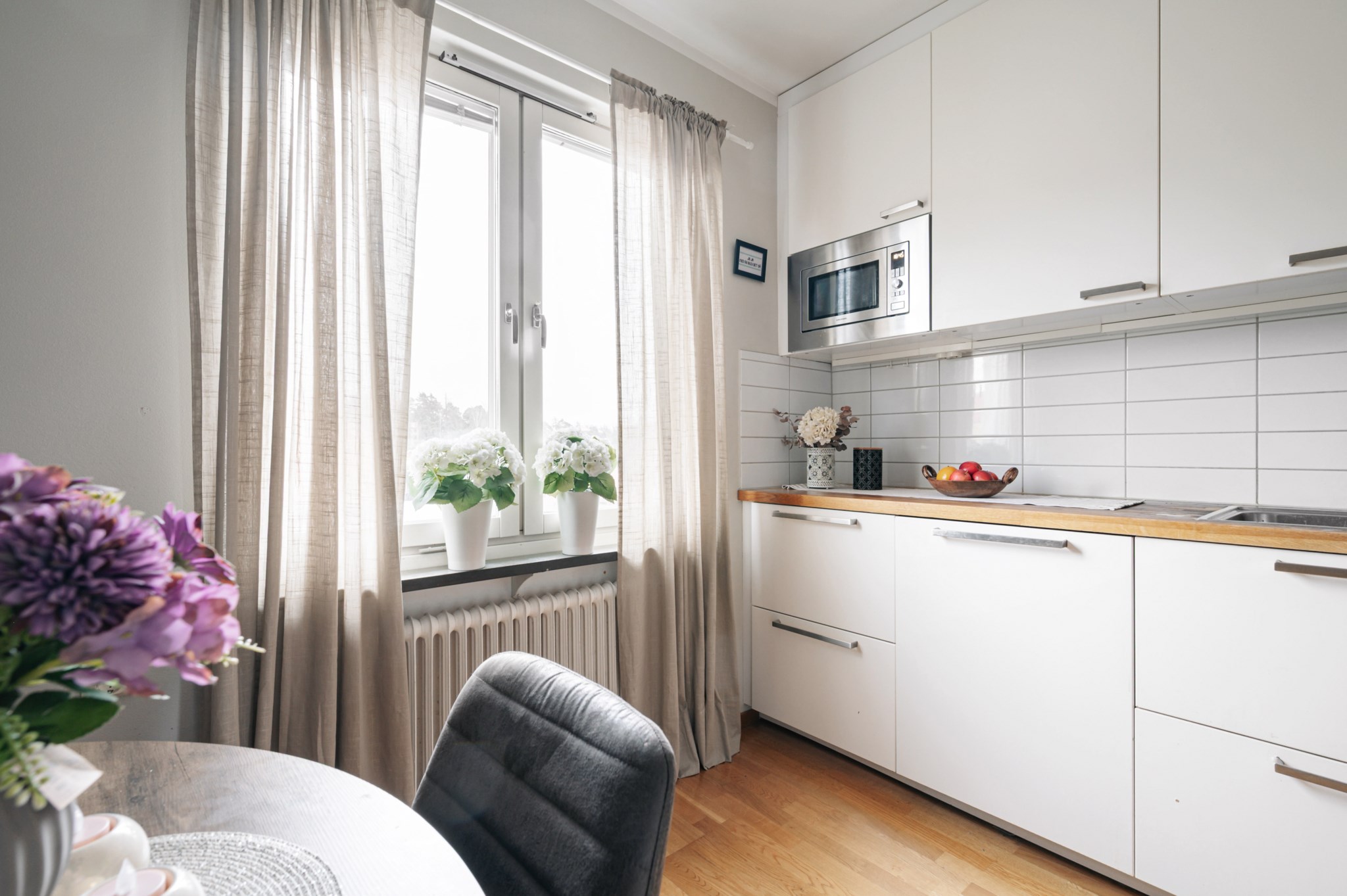 Modernt och lättarbetat kök med gott om förvaring. Köksskåpen har stilrena ljusa köksluckor som kombineras med en bänkskiva i Ek och vitt kakel som stänkskydd. Den maskinella utrustningen består av två stycken kyl/frys, ugn, micro, induktionshäll, fläkt och diskmaskin. Väggarna är ljust målade och golvet belagt med parkettgolv. Här finns plats till matbord.