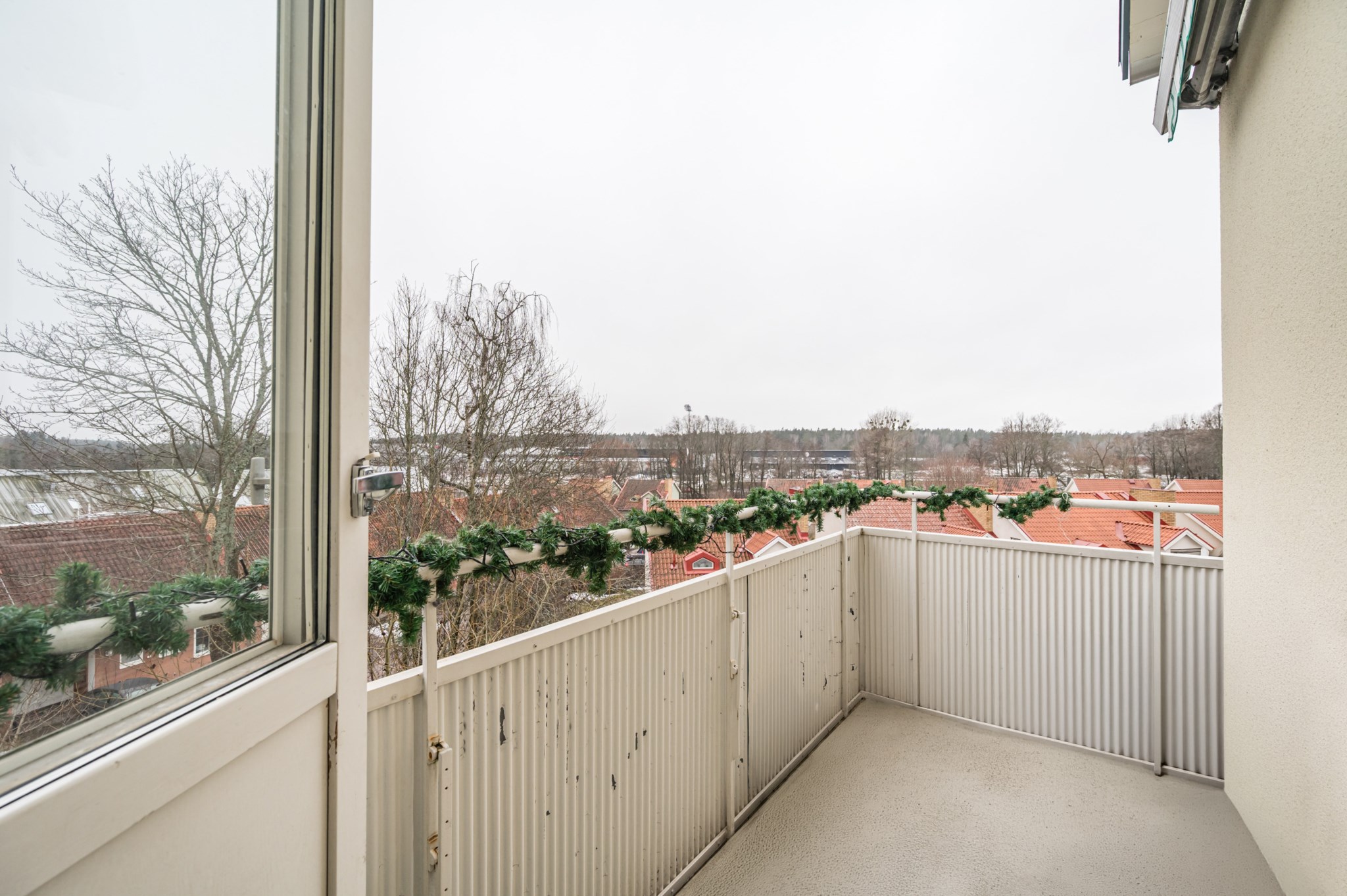 Till lägenheten hör en balkong. Den soliga balkongen har gott om utrymme för bekväma balkongmöbler och bjuder på fri utsikt.