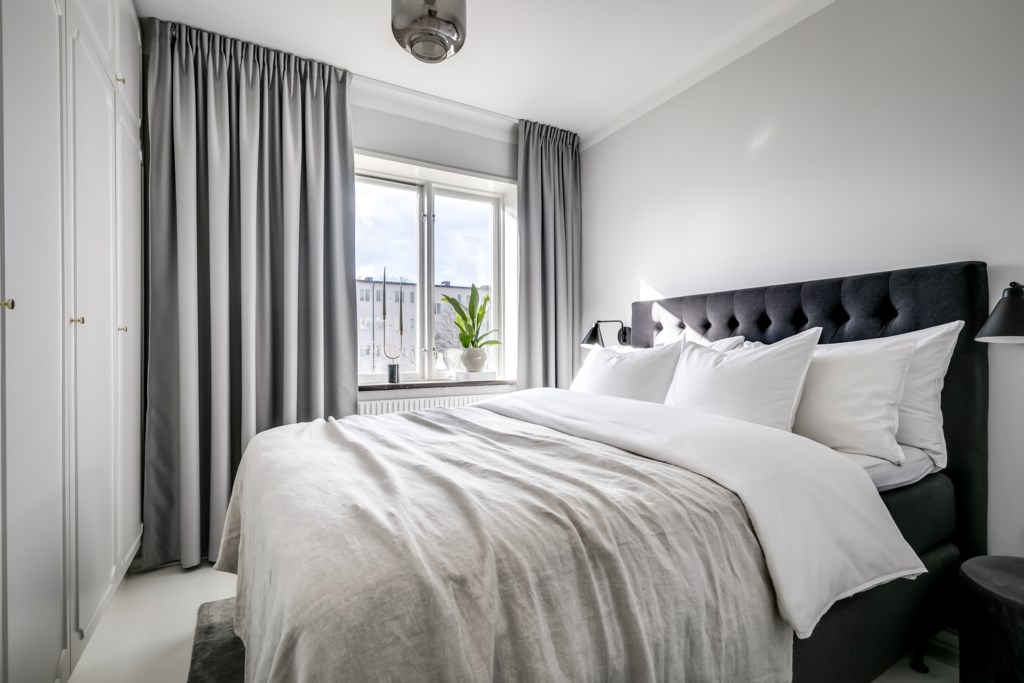 Mysigt sovrum med ljust golv och ljusa väggar. Rummet erbjuder plats för fullstor säng och nattduksbord samt god förvaring i flera garderober. Ett fönster ger fint ljusinsläpp och bidrar till en lugn och trivsam känsla.