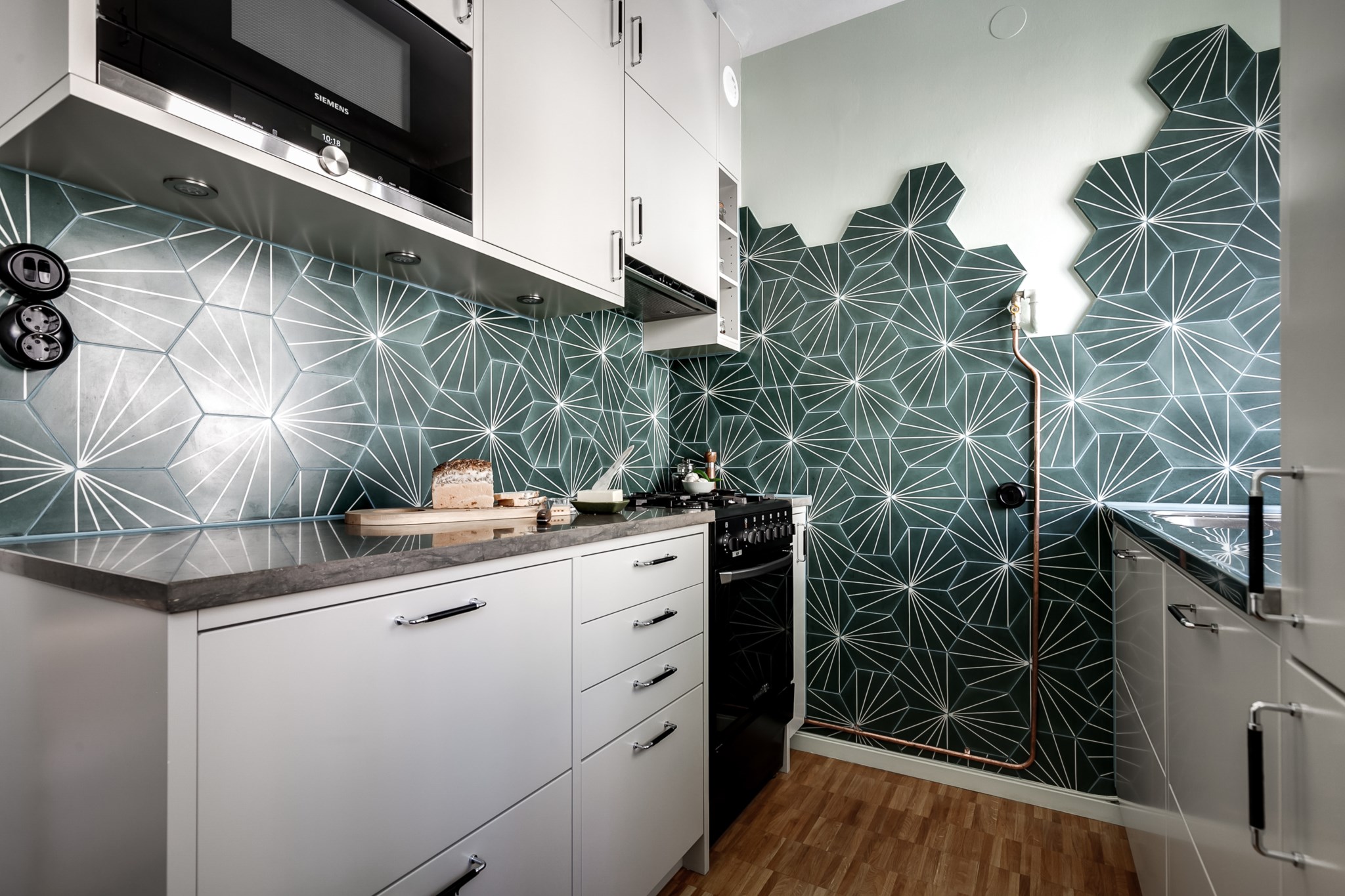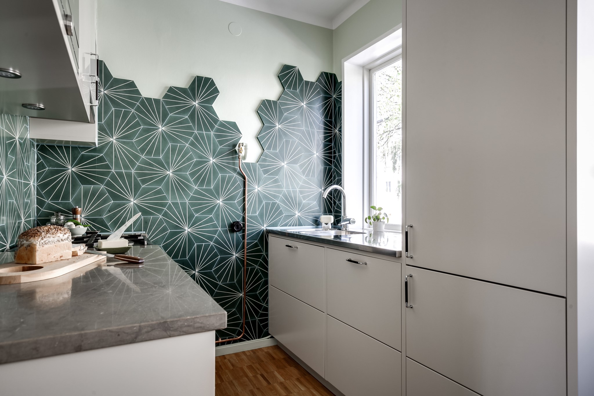 Modernt kök med industriparkett i ek och marockanskt designkakel samt målade väggar. Ljusa skåpluckor och fin bänkskiva i kalksten. Fullt utrustat med integrerad kyl/frys, integrerad diskmaskin, gasspis med varmluftsugn, fläkt och mikro. I anslutning till köket finns en välplanerad matplats. Två stora fönster för ljusinsläpp och en praktisk skjutdörr som skiljer vardagsrummet mot köket.