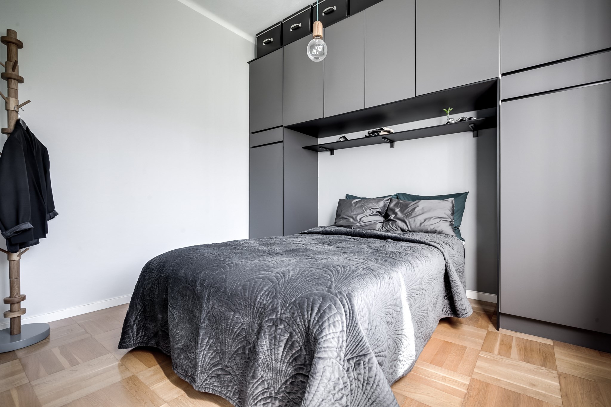 Mysigt sovrum med parkettgolv och målade väggar. Plats för dubbelsäng samt sängbord på vardera sida, mellan platsbyggda garderober. Fönster för fint ljusinsläpp.