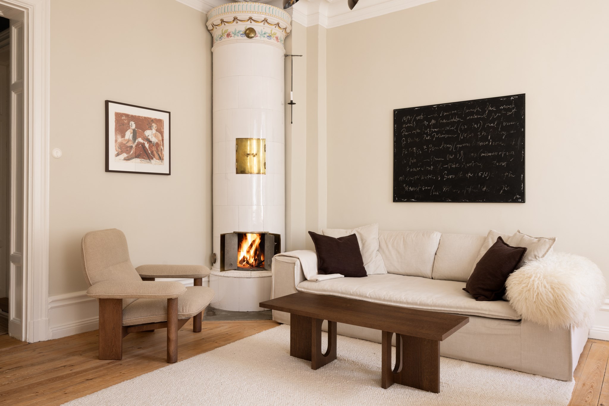 Vardagsrummet bjuder på vackra trägolv, en generös takhöjd om ca 3,15 meter i hela lägenheten, och en fungerande kakelugn som skapar både stämning och värme – perfekt för mysiga kvällar under årets kallare månader. De fyra stora fönstren i fil vetter mot Upplandsgatan och släpper in ett generöst ljusflöde under eftermiddag och kväll, vilket ytterligare förstärker rummets öppna och luftiga känsla.