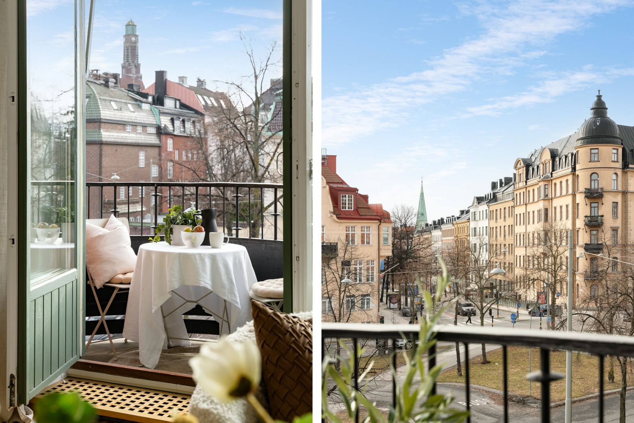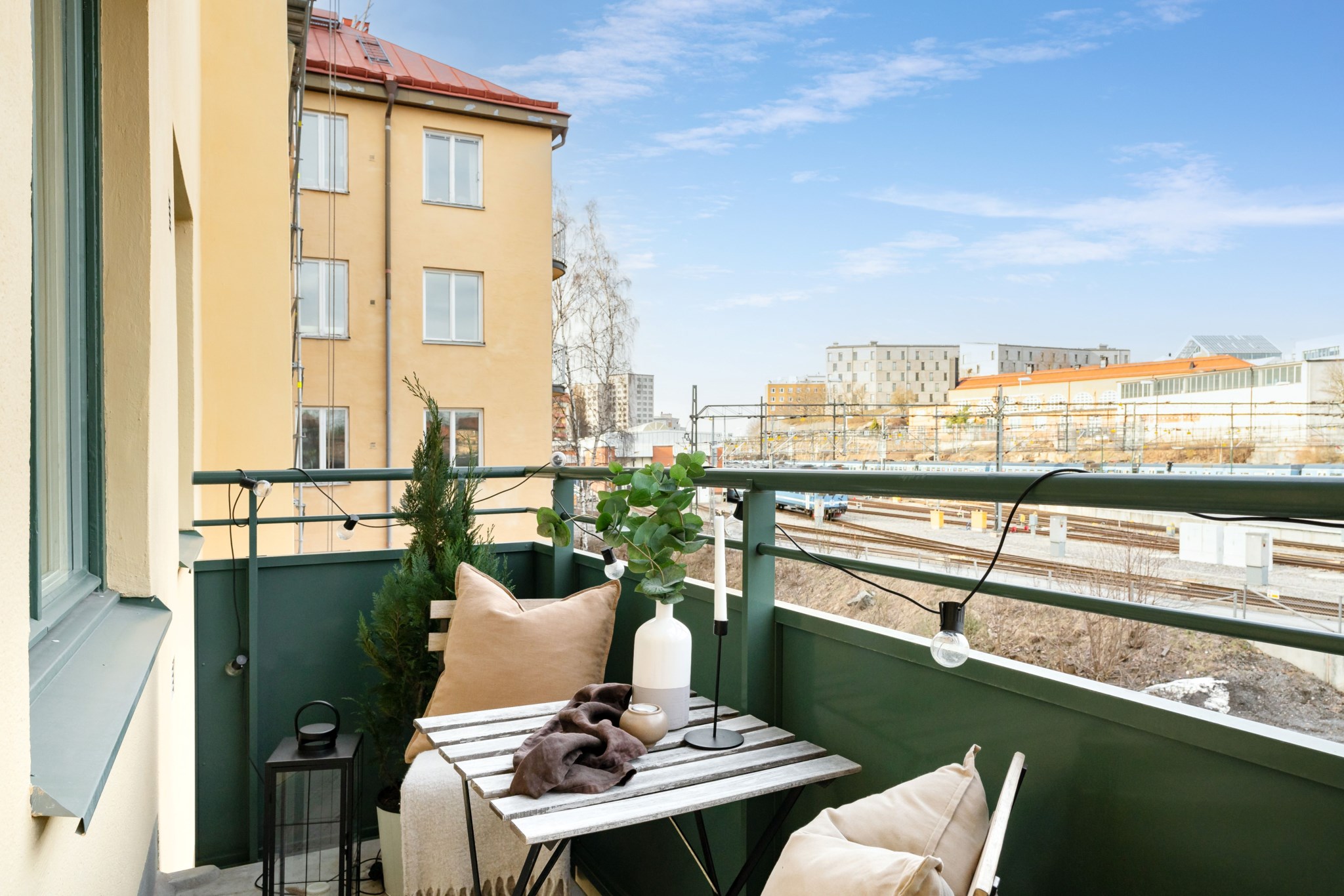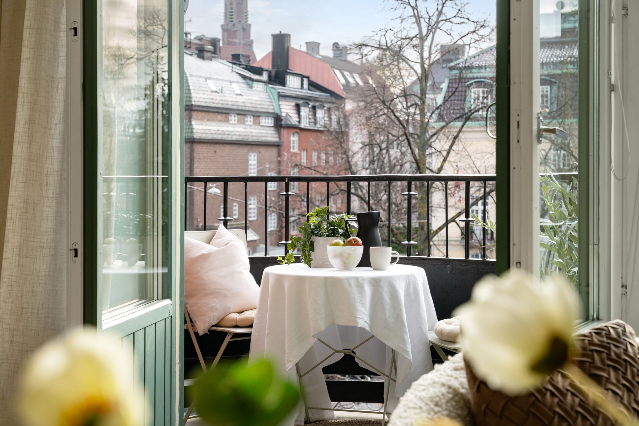 Till lägenheten hör en balkong att möblera med sittgrupp som nås via bostadens vardagsrum.