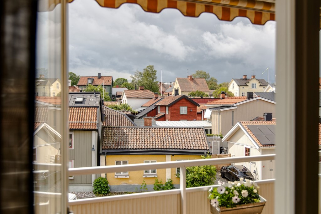 Till lägenheten hör en balkong. Den soliga balkongen i sydväst har gott om utrymme för bekväma balkongmöbler och bjuder på en fri vy mot lugn innergård och historiska Kyrkbacken. Balkongen har tak och markis.