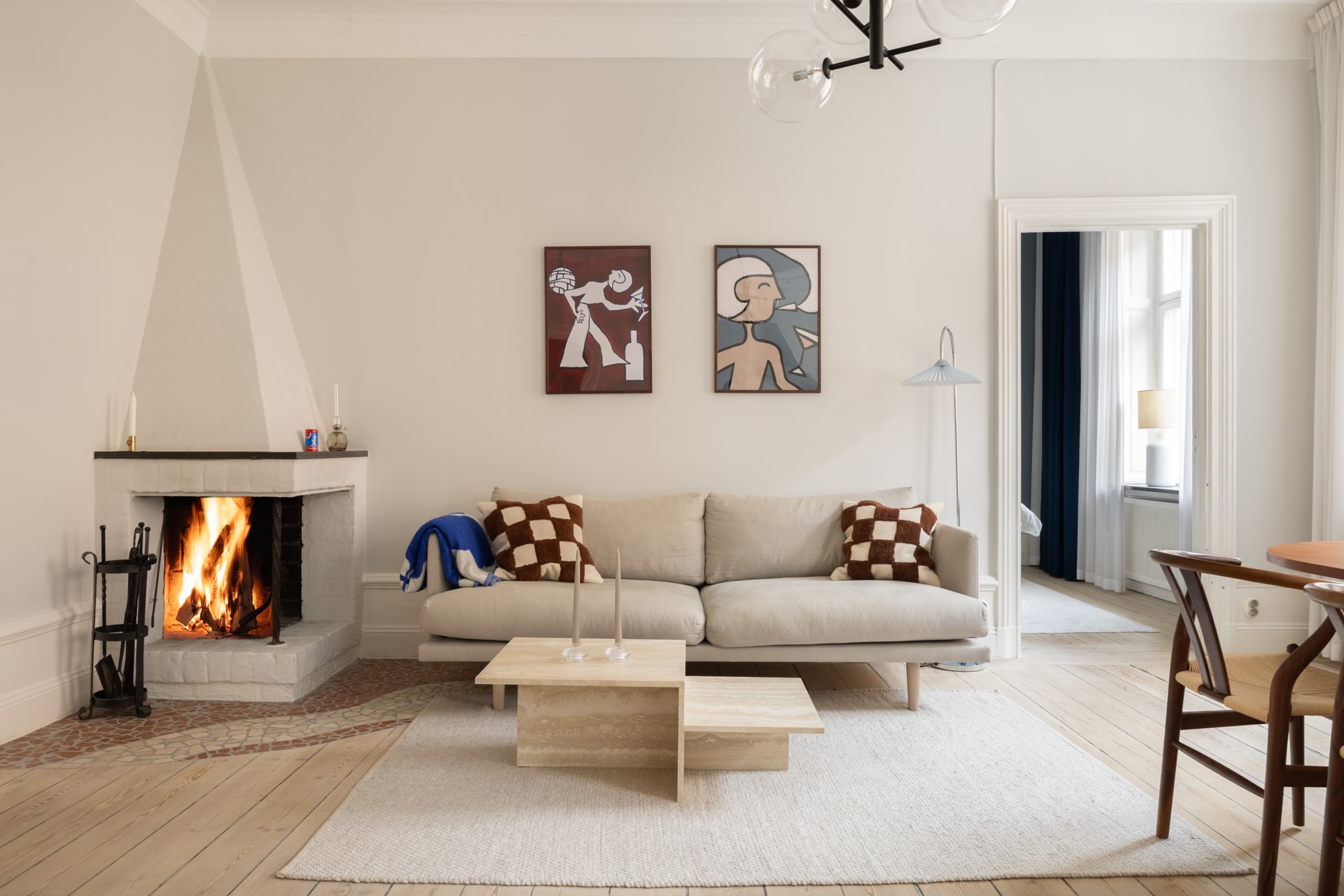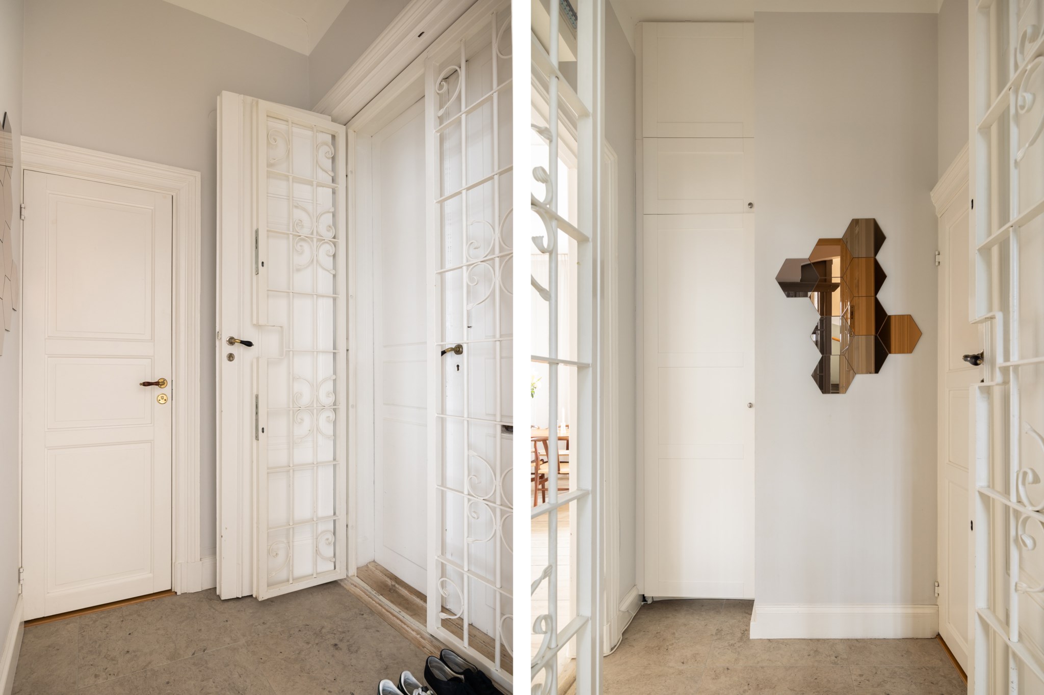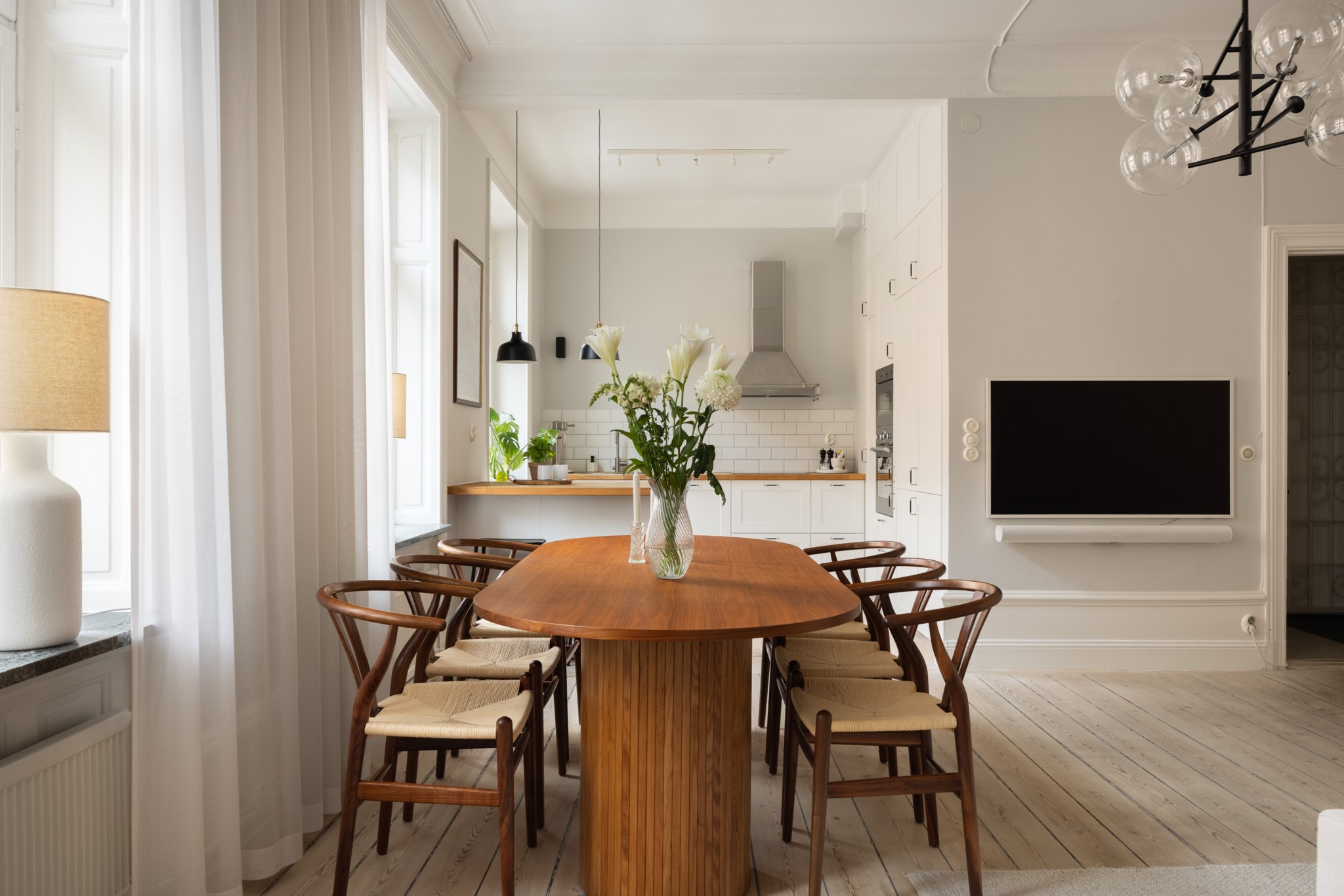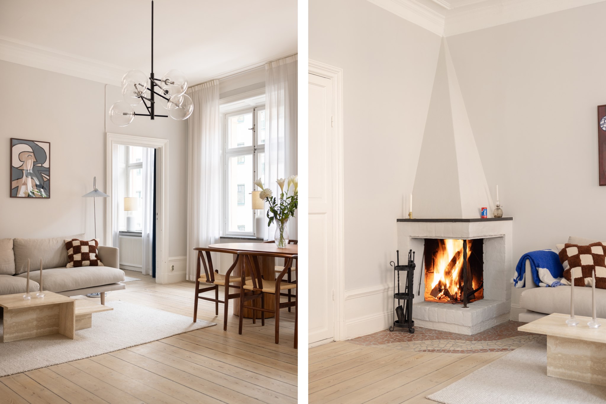 Redan i hallen möts du av en känsla av rymd och kvalitet. De klassiska originaldetaljerna finns bevarade i form av höga golvsocklar, djupa fönsternischer, speglade dörrar och dekorativa stuckaturer – och inte minst den stämningsfulla öppna spisen som ger vardagsrummet både karaktär och värme under årets mörkare månader.