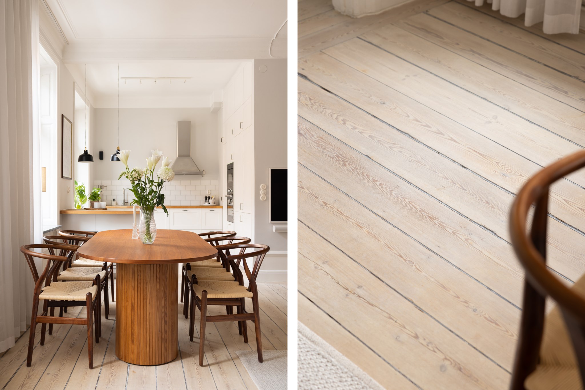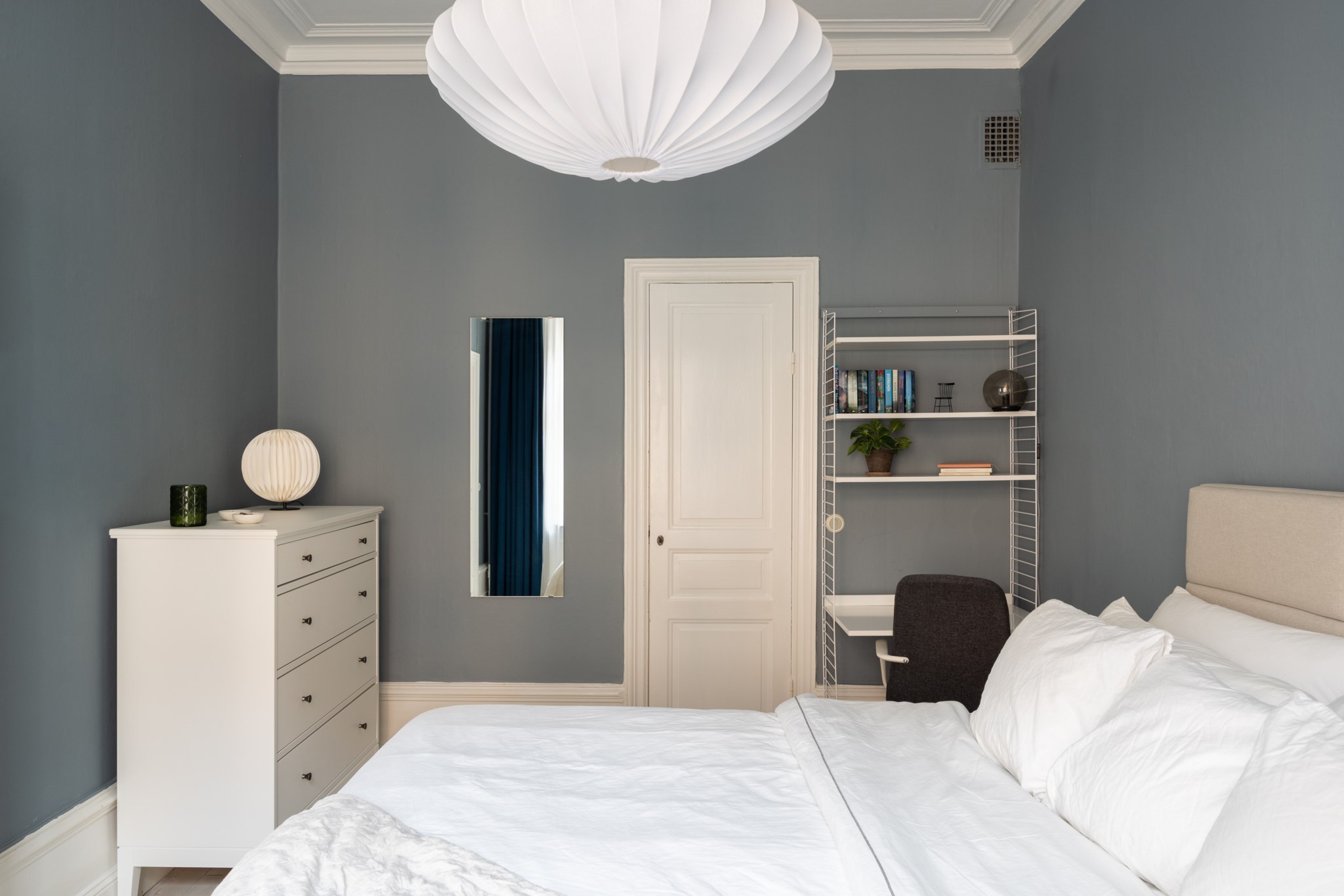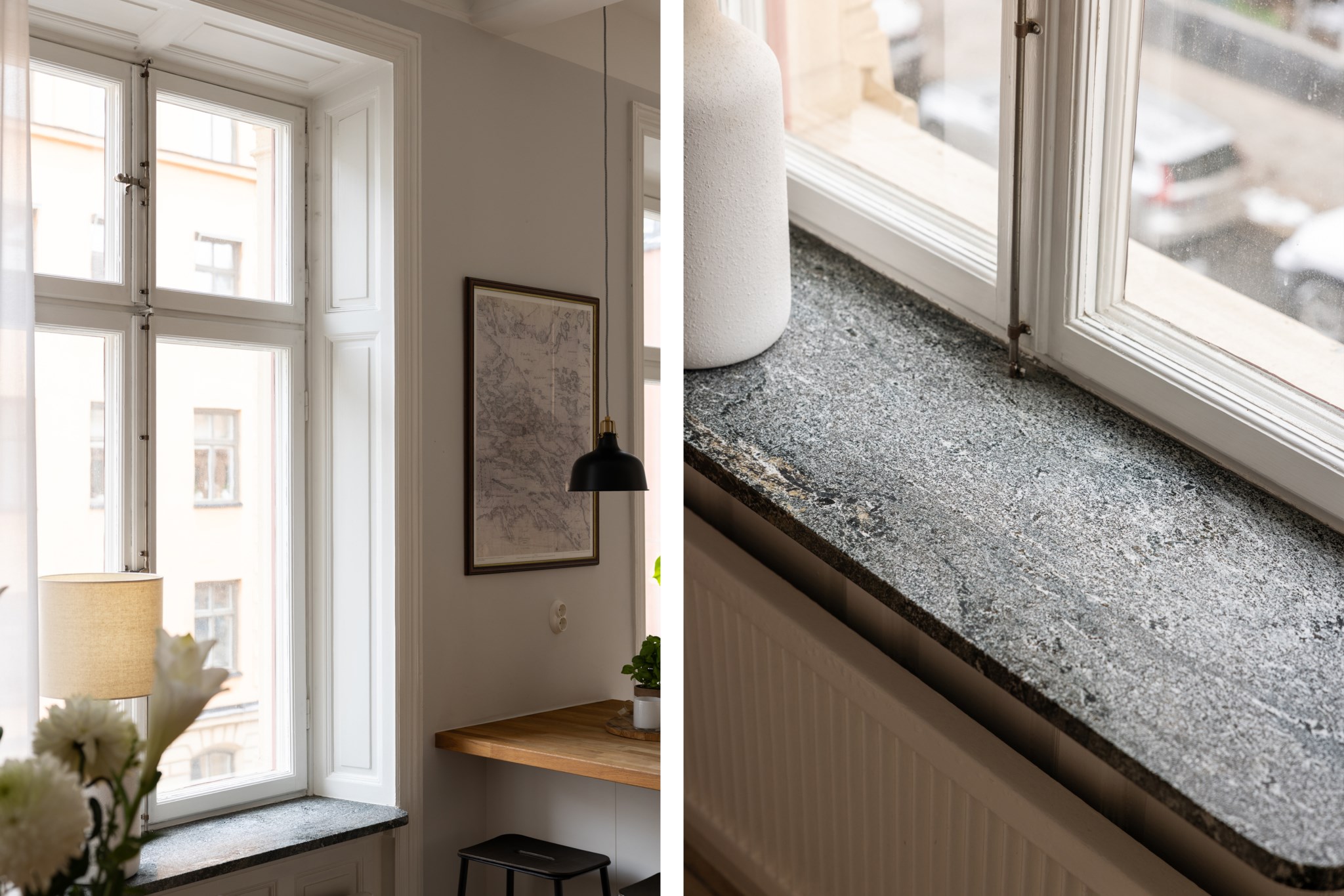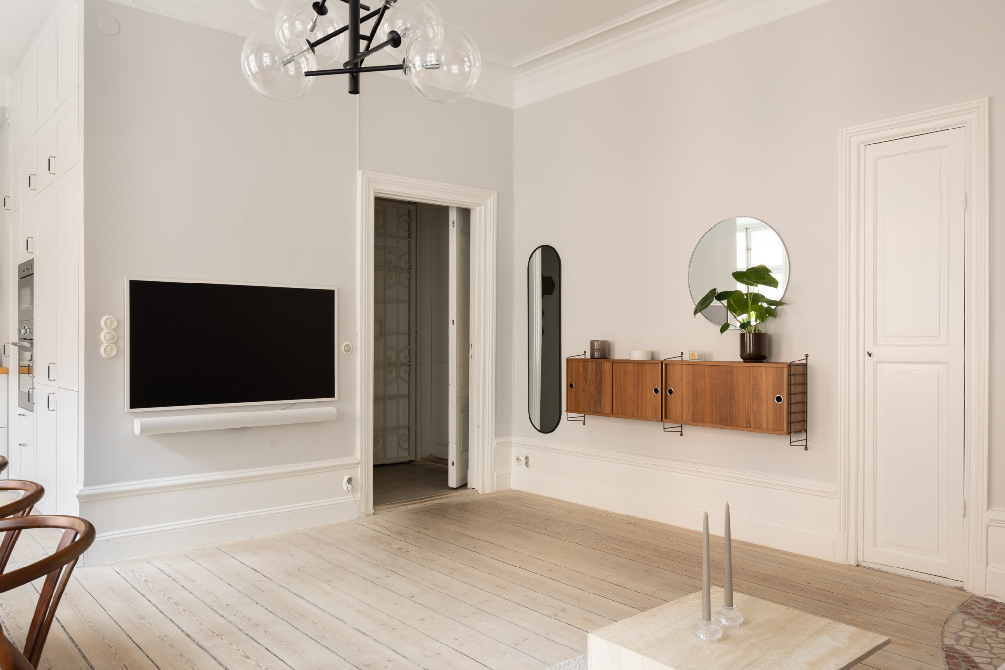 Redan i hallen möts du av en känsla av rymd och kvalitet. De klassiska originaldetaljerna finns bevarade i form av höga golvsocklar, djupa fönsternischer, speglade dörrar och dekorativa stuckaturer – och inte minst den stämningsfulla öppna spisen som ger vardagsrummet både karaktär och värme under årets mörkare månader.