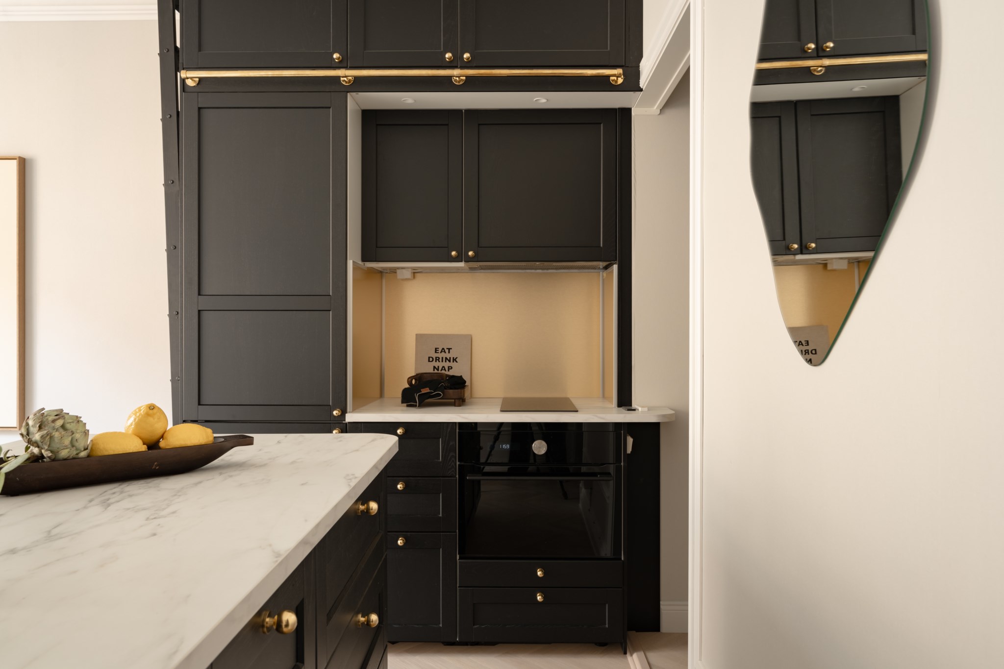 - Integrerad Kyl/frys, induktionshäll, kombinerad ugn/mikrovågsugn, kolfilterfläkt och diskmaskin.