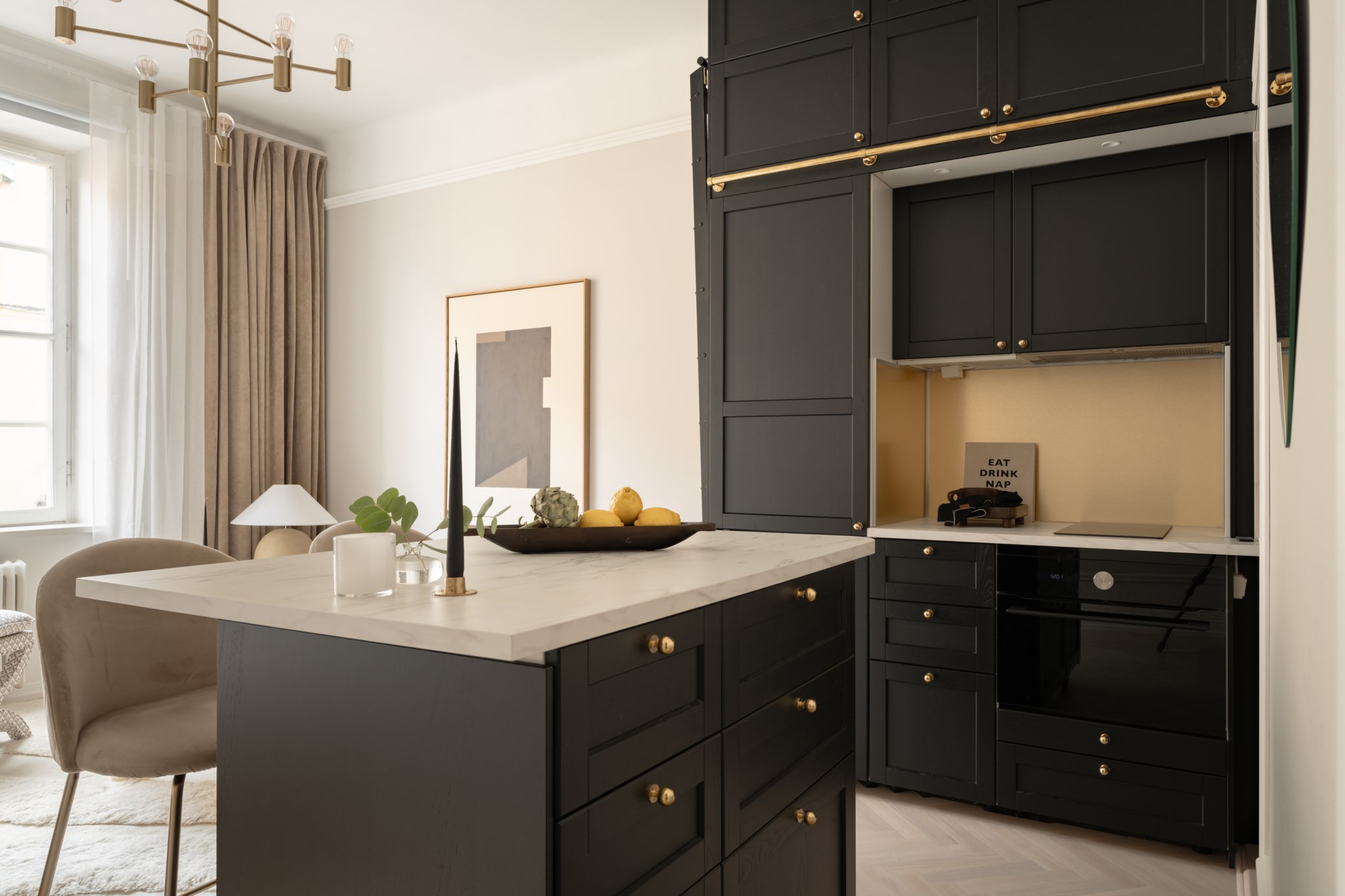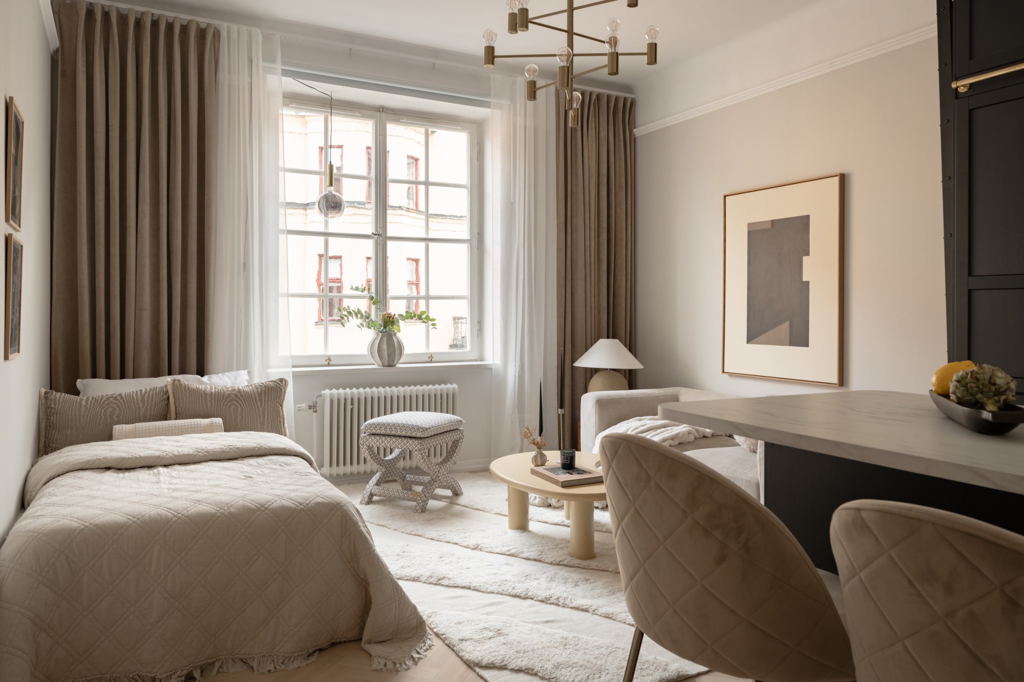 Hela bostaden är nyligen renoverad med nytt kök, nya golv och fräscha ytskikt – allt i stilrena materialval som håller hög standard. Det fullutrustade köket bjuder på integrerade vitvaror, diskmaskin, kombinerad ugn/mikro, induktionshäll och gott om förvaring. Vardagsrummet har en smart planlösning med plats för både säng, soffa och matbord, och tack vare den generösa takhöjden och de stora fönstren flödar ljuset in. Badrummet är modernt och fräscht med dusch, eluppvärmd handdukstork och stilren inredning.