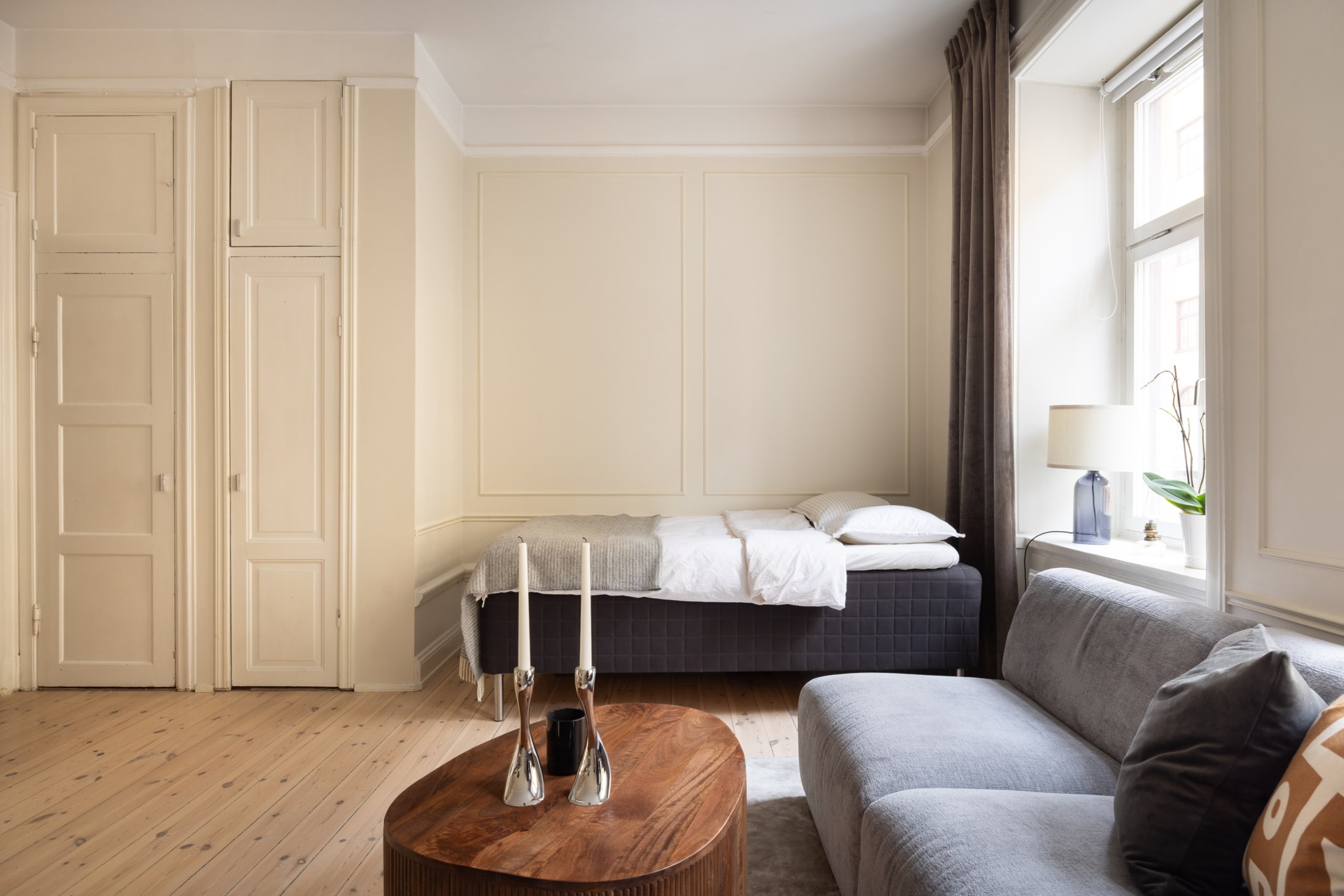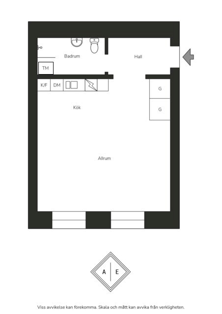 Luftigt allrum med generös takhöjd och fantastiskt ljusinsläpp via två fönster i fil. Smakfulla ytskikt bestående av väggar i beige nyans, ljust trägolv samt detaljer i form av vägglister, höga golvsocklar och takrosett. I allrummet inryms soffa, soffbord, matgrupp, säng och annat möblemang efter smak och behov. Generöst med förvaring via platsbyggd garderob.