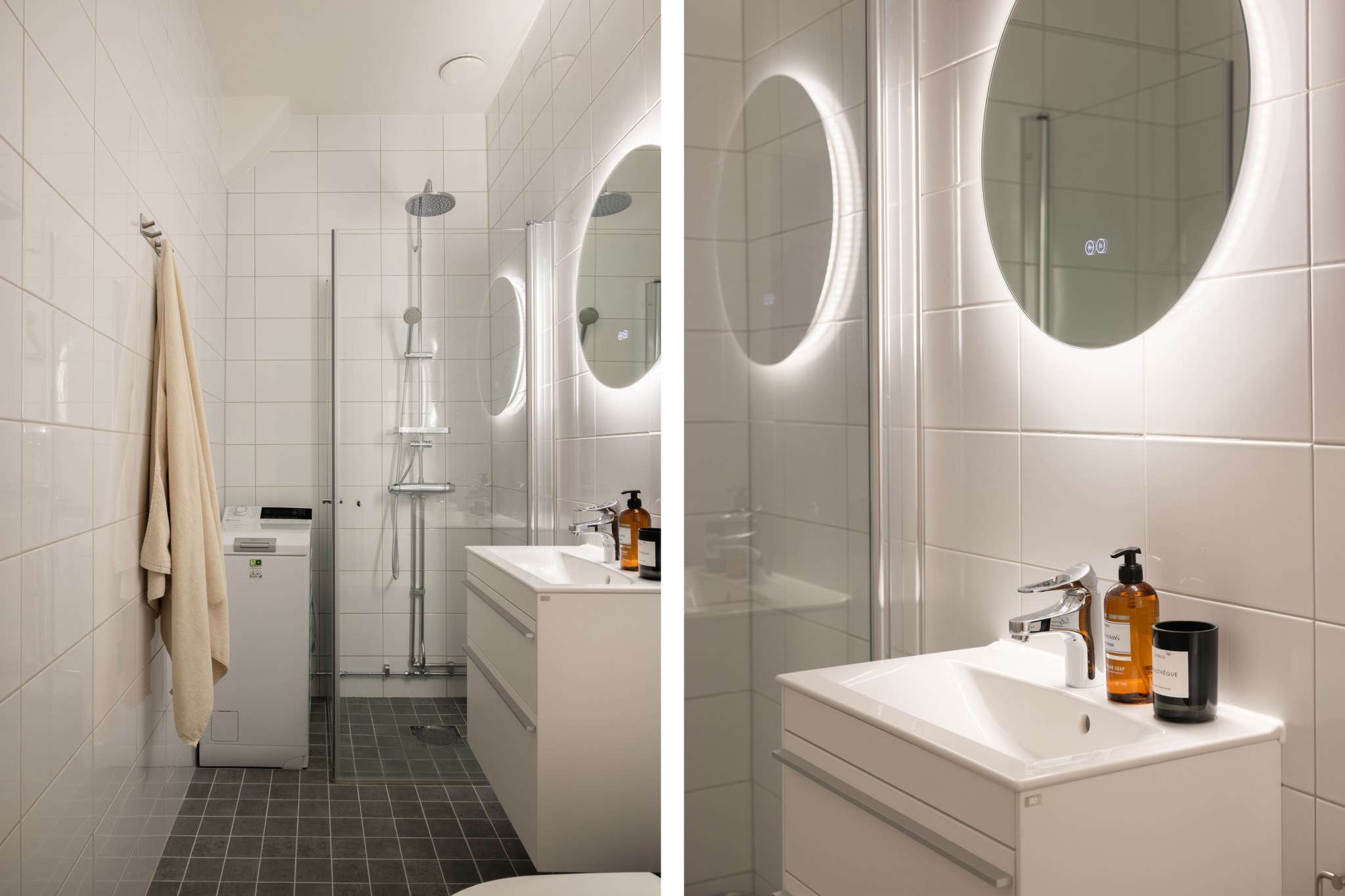 Nyrenoverat badrum (från stambyte november 2025). Tidlösa och smakfulla ytskikt bestående av vitt kakel och mörkt klinker. Badrummet är utrustat med WC, handfat med kommod, spegel med justerbar belysning, takdusch med glasväggar, tvättmaskin samt golvvärme.