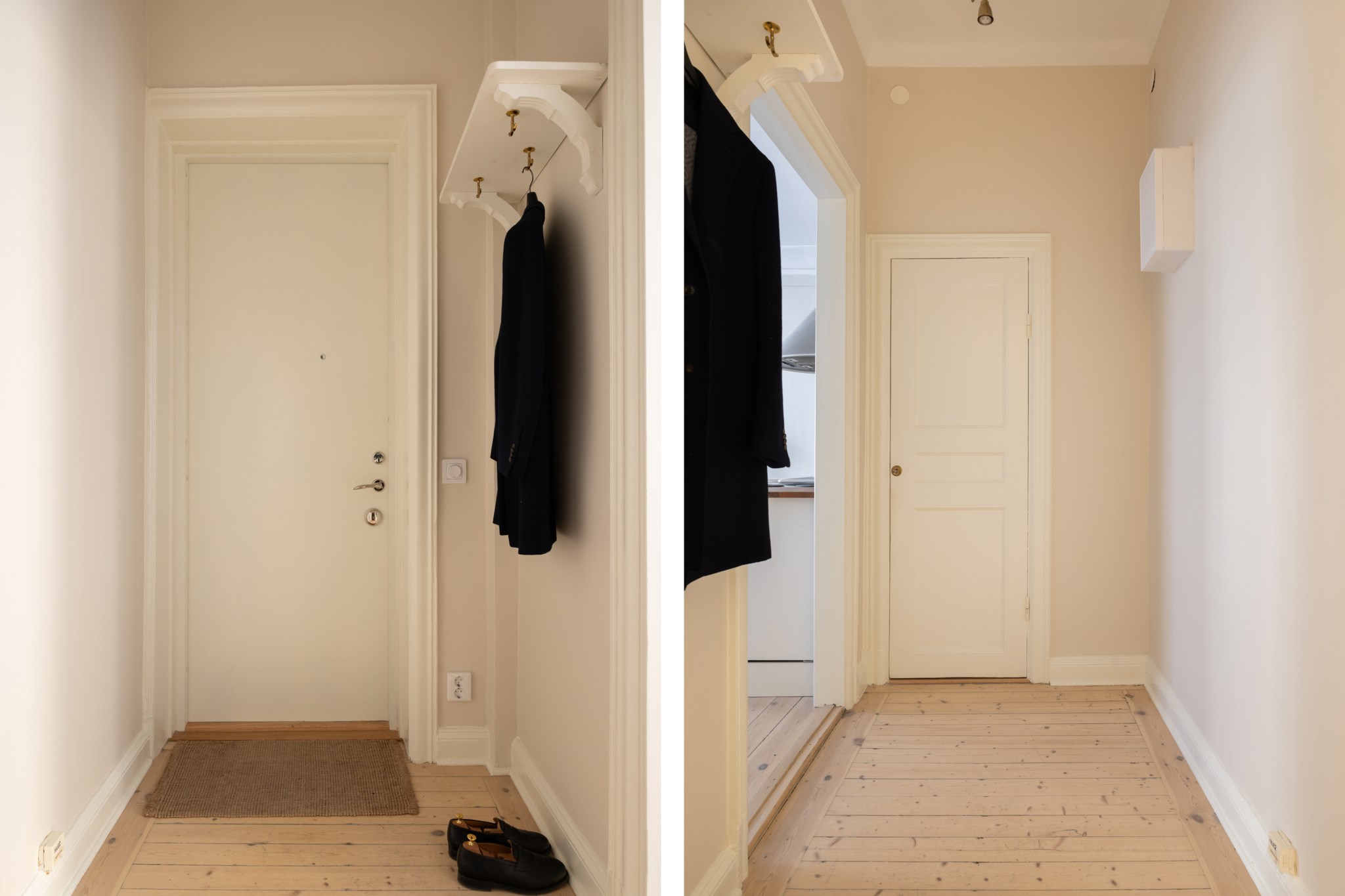 Välkomnande hall med gott om plats för avhängning, skoställ och mindre avlastningsmöblemang efter önskemål. Smakfulla ytskikt bestående av väggar i beige nyans samt ljust trägolv.
