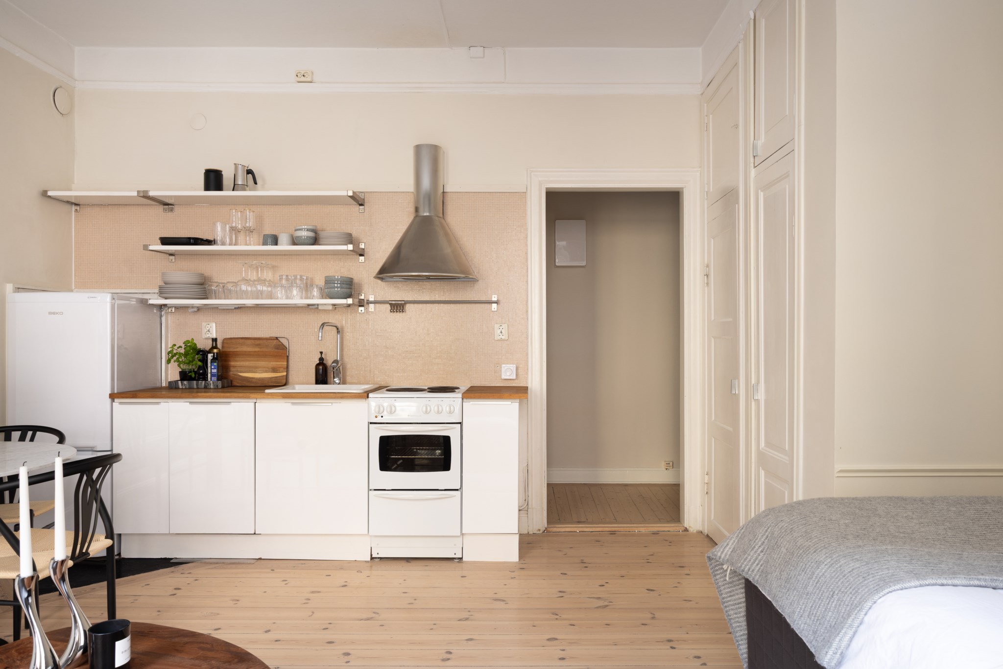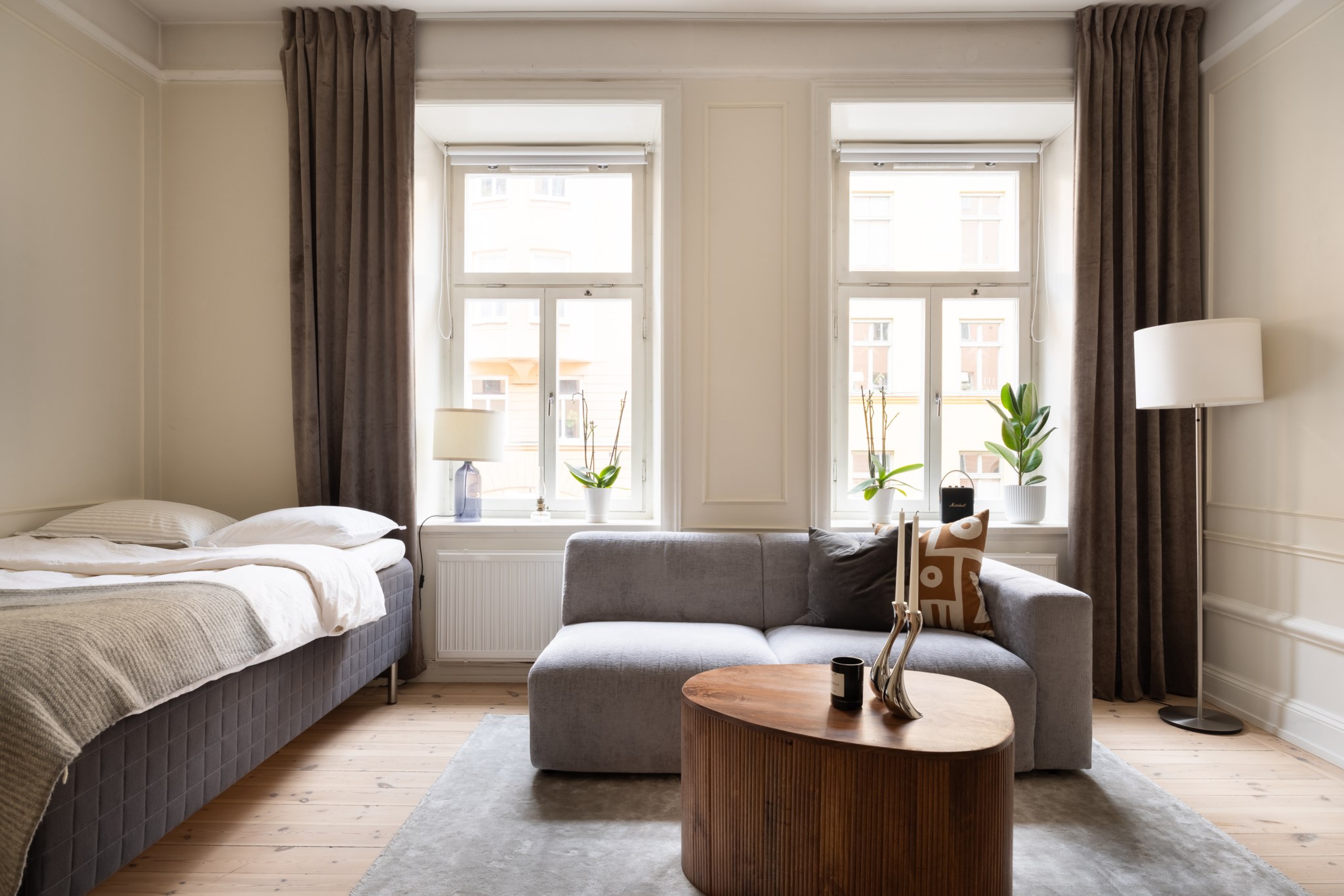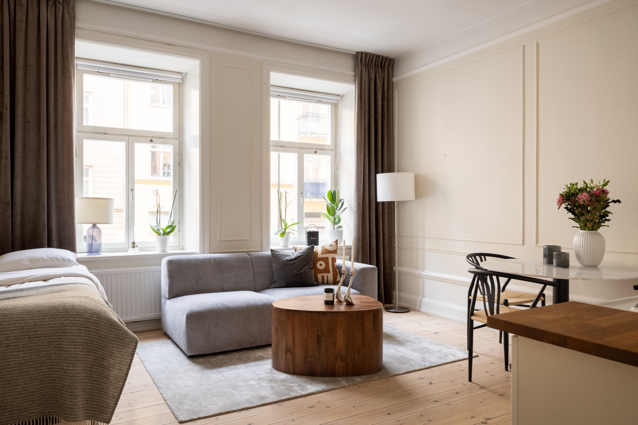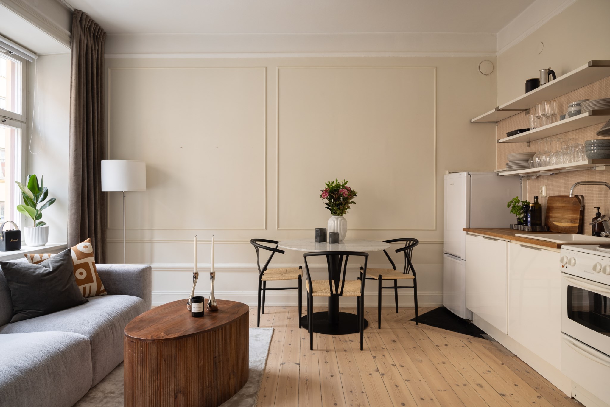 Här bor du i en ljus och charmig bostad där smakfulla materialval möter tidstypiska detaljer. Bostaden karaktäriseras av generös takhöjd, vackert originalgolv i trä, dekorativa vägglister och genomgående ljusbeige kulör. I allrummet möts du av ett härligt ljusinsläpp via två fönster i fil. Den öppna planlösningen ger gott om utrymme för både soffa, matplats, säng och annat möblemang efter önskemål. Köket är välplacerat i öppen planlösning med allrummet och är fullt utrustat, perfekt för både vardag och sociala tillfällen. Badrummet är nyrenoverat (november 2025) i samband med stambyte och håller högsta standard, med stilrena ytskikt samt golvvärme och tvättmaskin för bästa komfort.