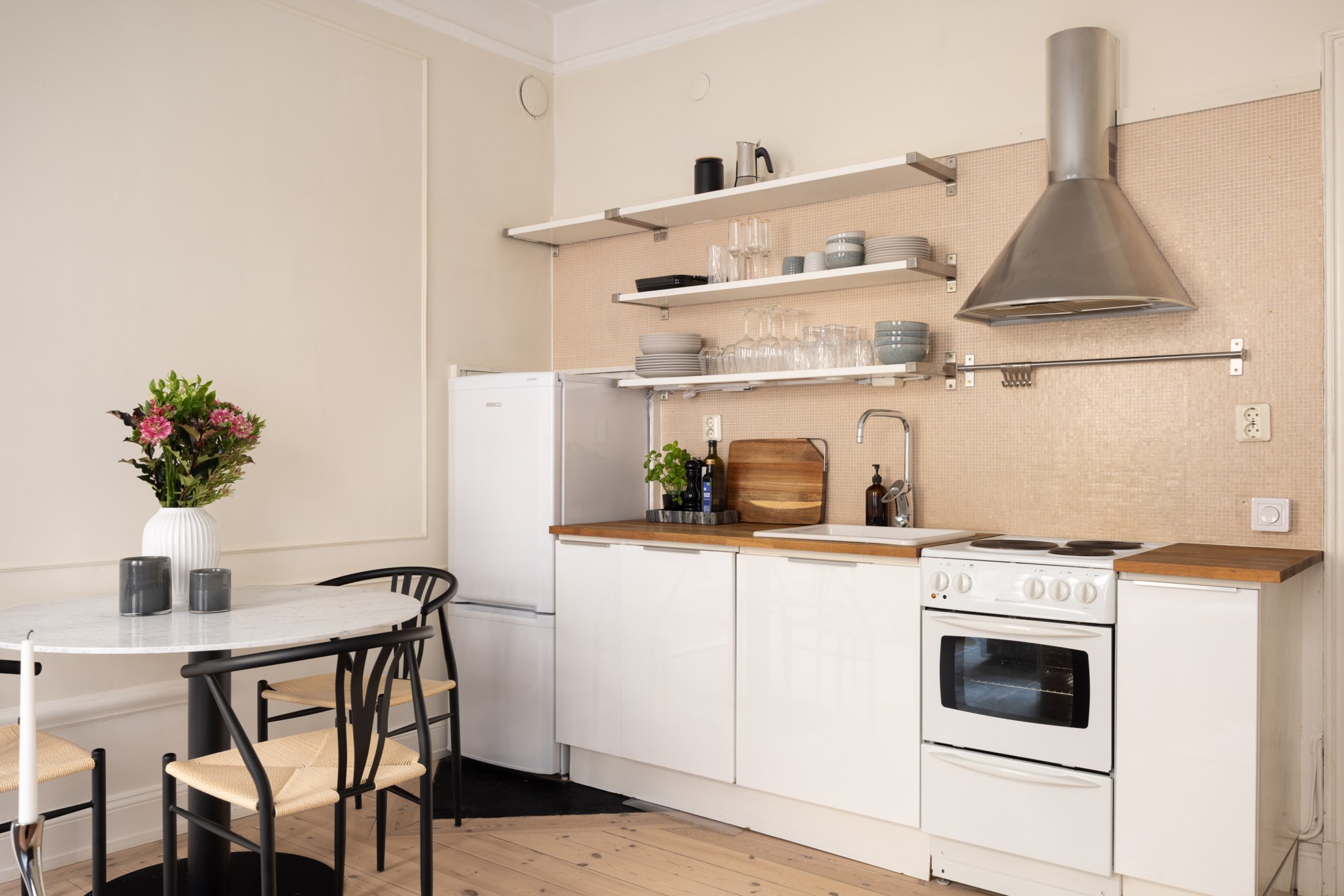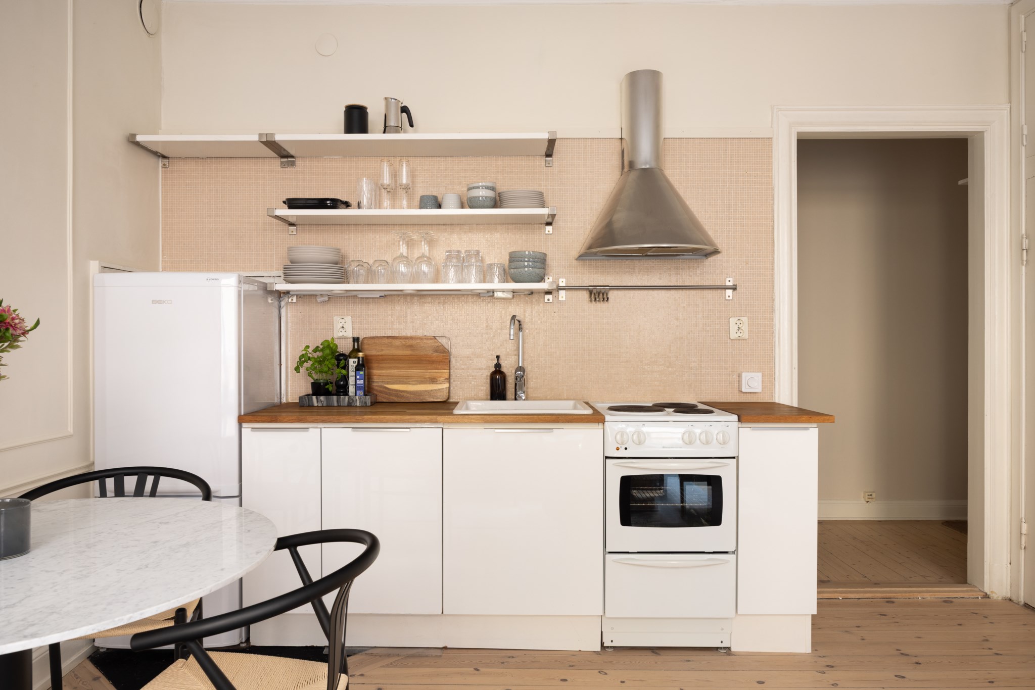 Tidlöst kök i öppen och social planlösning mot allrummet. Genomgående vita skåpsluckor och bänkskiva i trä. Köket är utrustat med diskho, spis, köksfläkt, ugn, diskmaskin samt kyl- och frys.