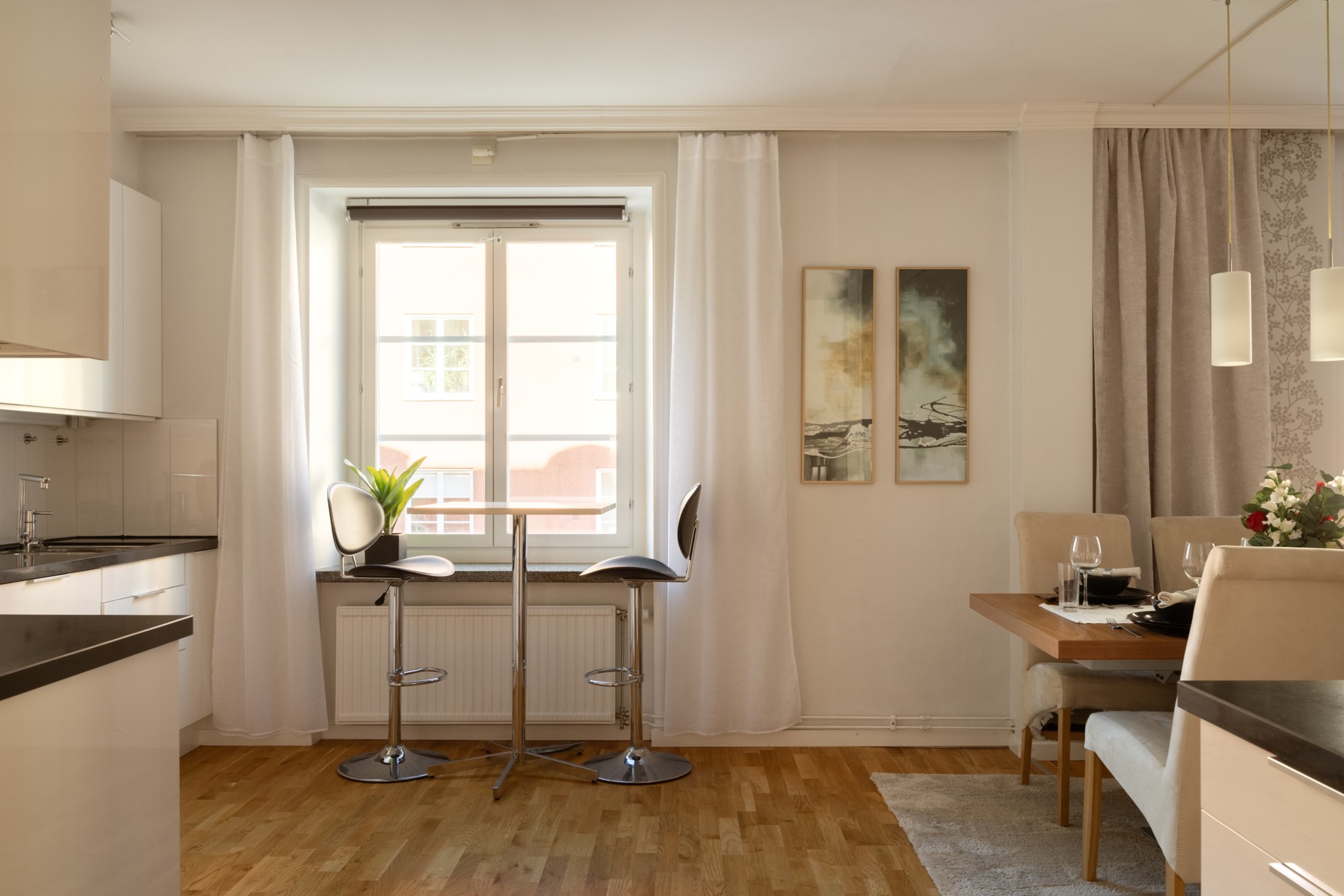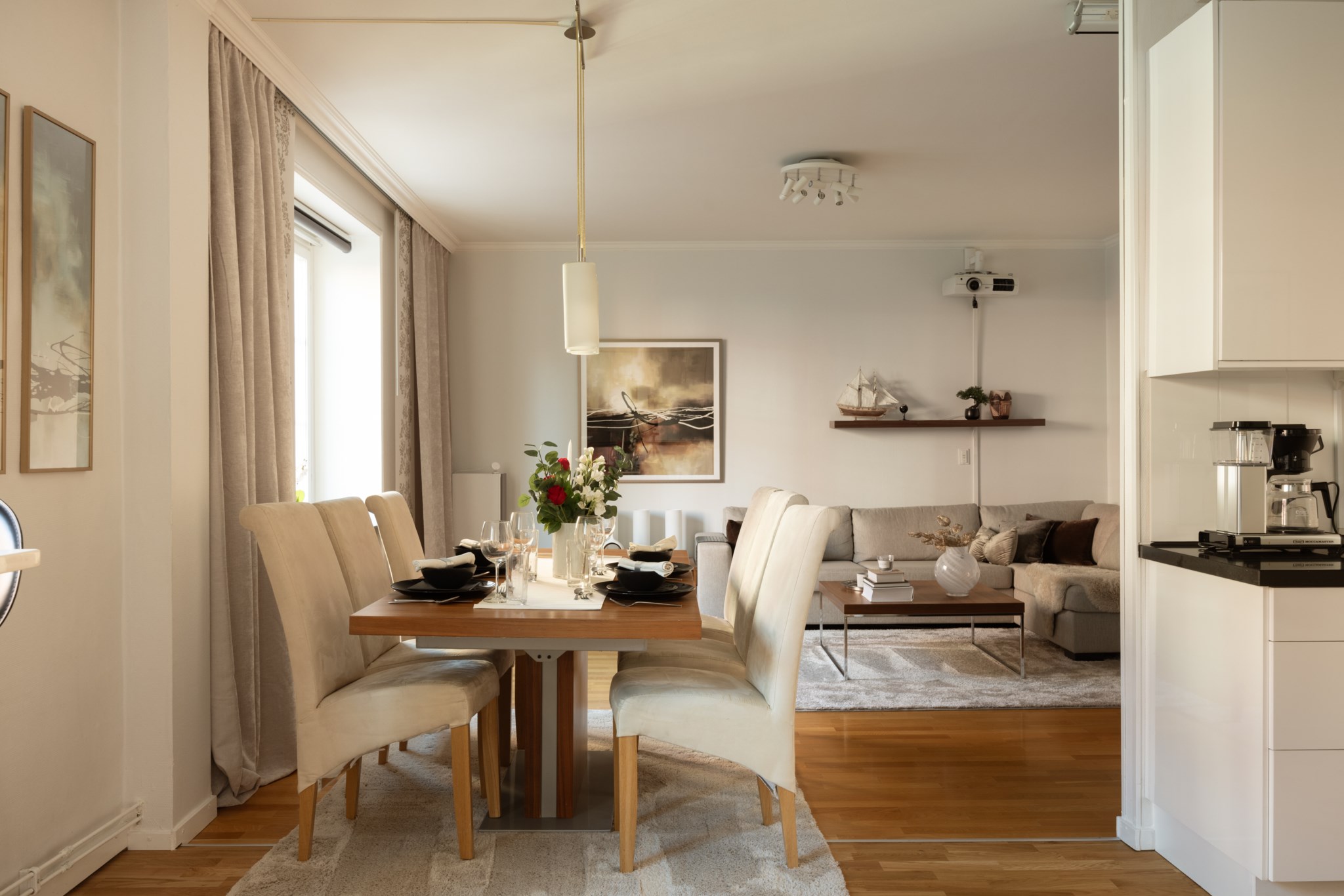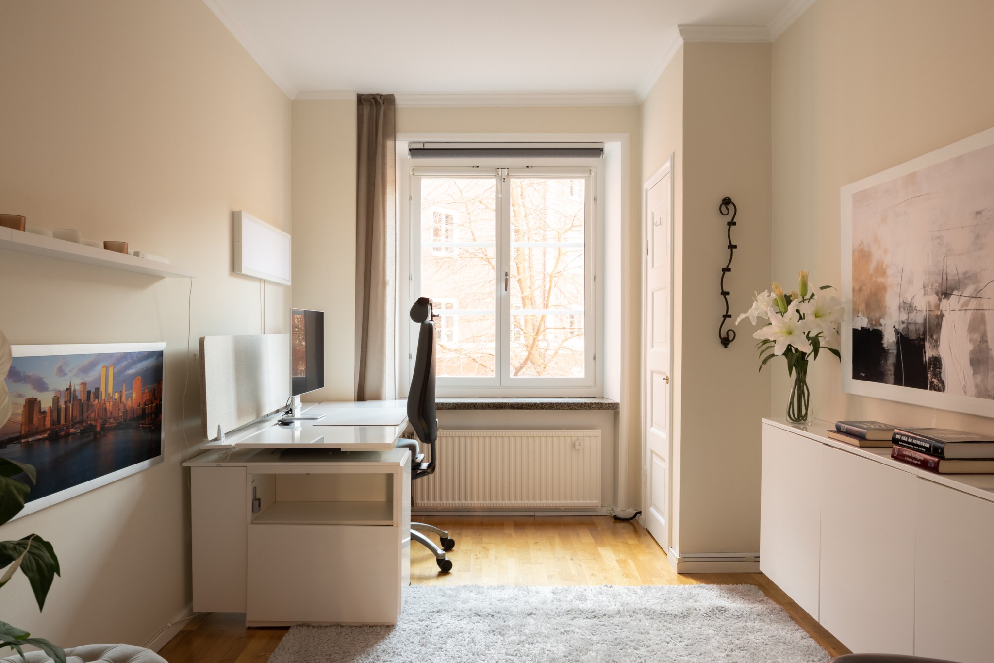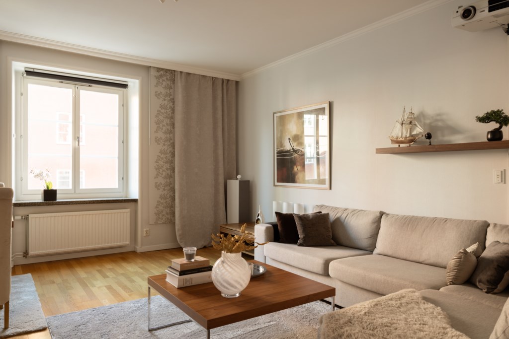Hjärtat i detta vackra hem är den öppna planlösningen mellan det stilrena köket och det rymliga vardagsrummet, med gott om plats för stor soffgrupp och tilltagen matplats - perfekt för middagar med familj och vänner. Lägenheten rymmer två stora insynsskyddade sovrum med fri utsikt över innergården. Bostaden är i mycket fint skick: golven i köket byttes 2021, samtliga vitvaror i kök och badrum är utbytta mellan 2021-2025, och ytskikt, lister samt fönster har målats om kontinuerligt. Genomgående för hela lägenheten är den platsbyggda och smarta förvaringen. Bostaden präglas av vackra tidstypiska detaljer, exempelvis djupa fönsternischer i sten, som ger karaktär åt varje rum.