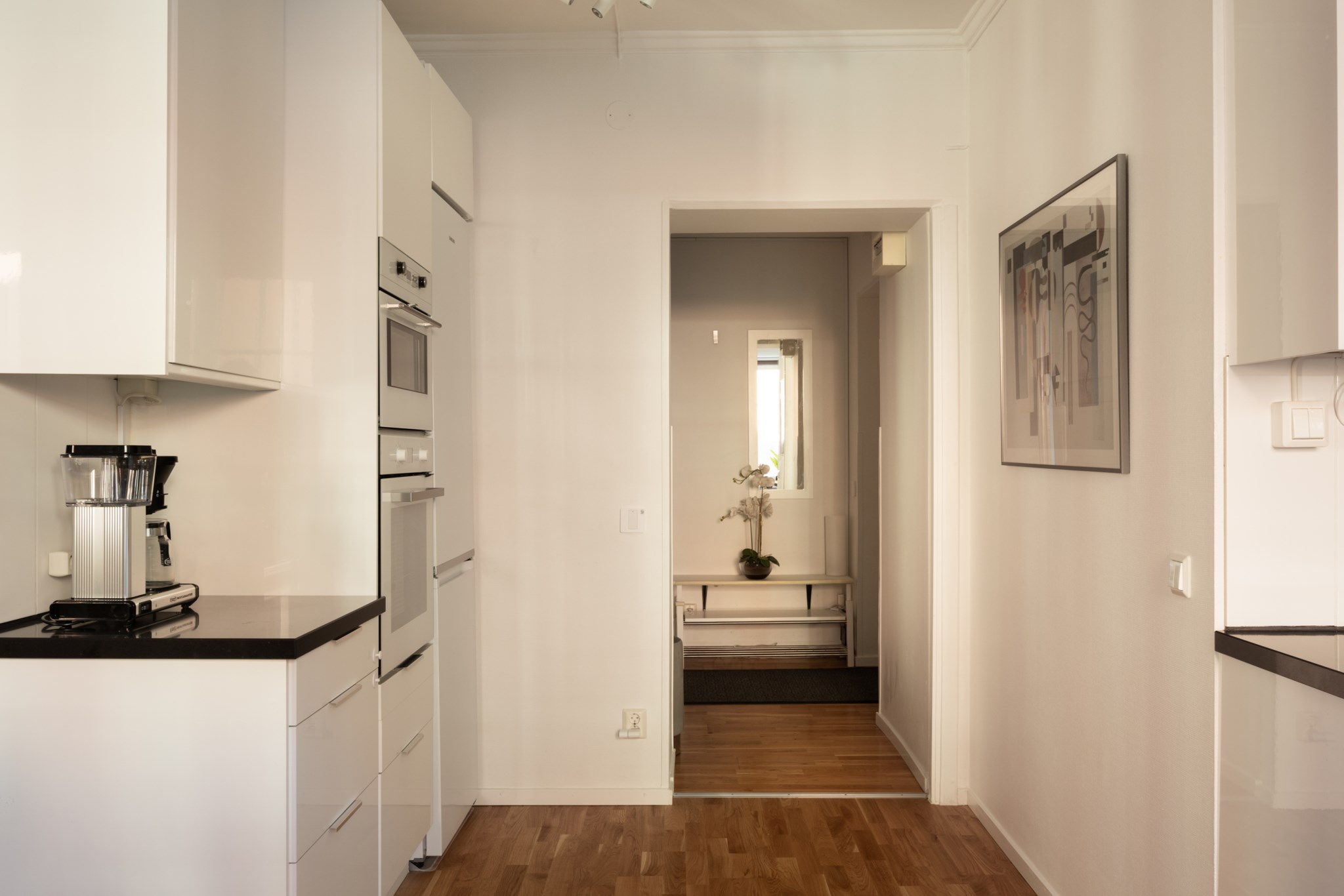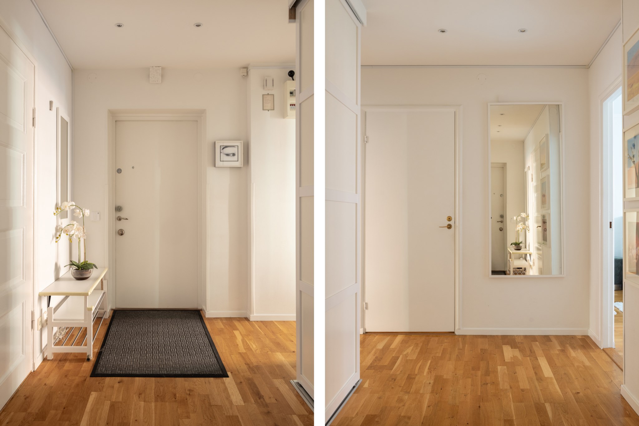 Välkomnande och luftig hall med utmärkt förvaring i rymliga garderober. Nymålad säkerhetsdörr (2026) mot det nyrenoverade trapphuset (2026). Hallen är centralt placerad och binder samman bostadens samtliga rum på ett naturligt sätt.