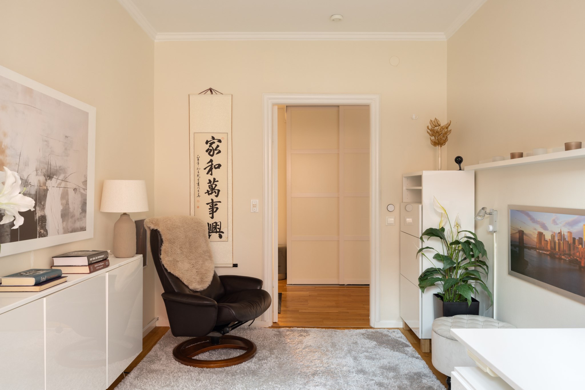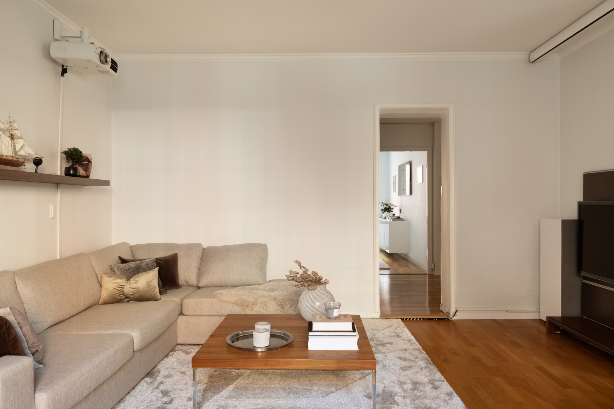 Ljust och inbjudande med bevarad originalparkett. Generös takhöjd och vackra fönsterpartier (renoverade invändigt och utvändigt) med breda marmorskivor. Gott om yta för stor soffgrupp och rejäl matplats utan att den luftiga känslan går förlorad.