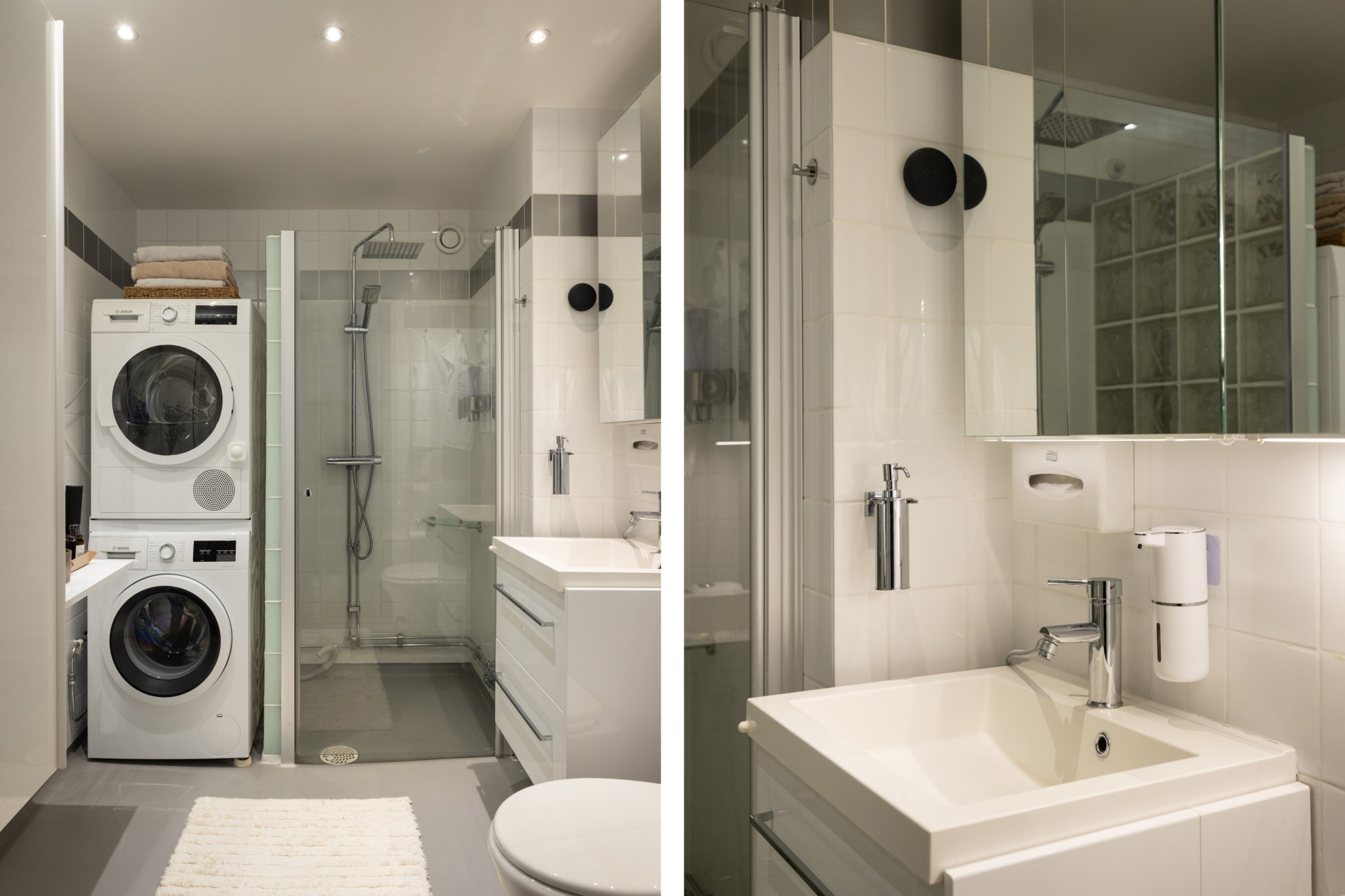 Kaklat och fräscht badrum med tidlösa materialval. Utrustat med ny tvättmaskin och torktumlare (2023), takdusch (2021), kommod, dubbla spegelskåp samt badrumsskåp. Plats finns för att återinstallera badkar om så önskas.