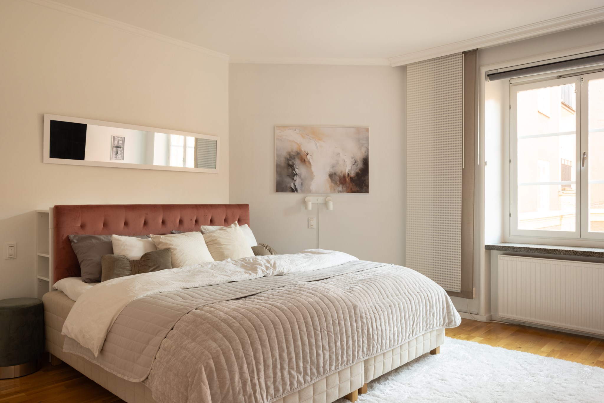 Väl tilltaget sovrum i insynsskyddat och rogivande läge mot innergård. Rummet rymmer med lätthet en kingsize-säng, tillhörande nattduksbord och upphängda byråer. Här erbjuds även utmärkt förvaring med platsbyggda garderober.