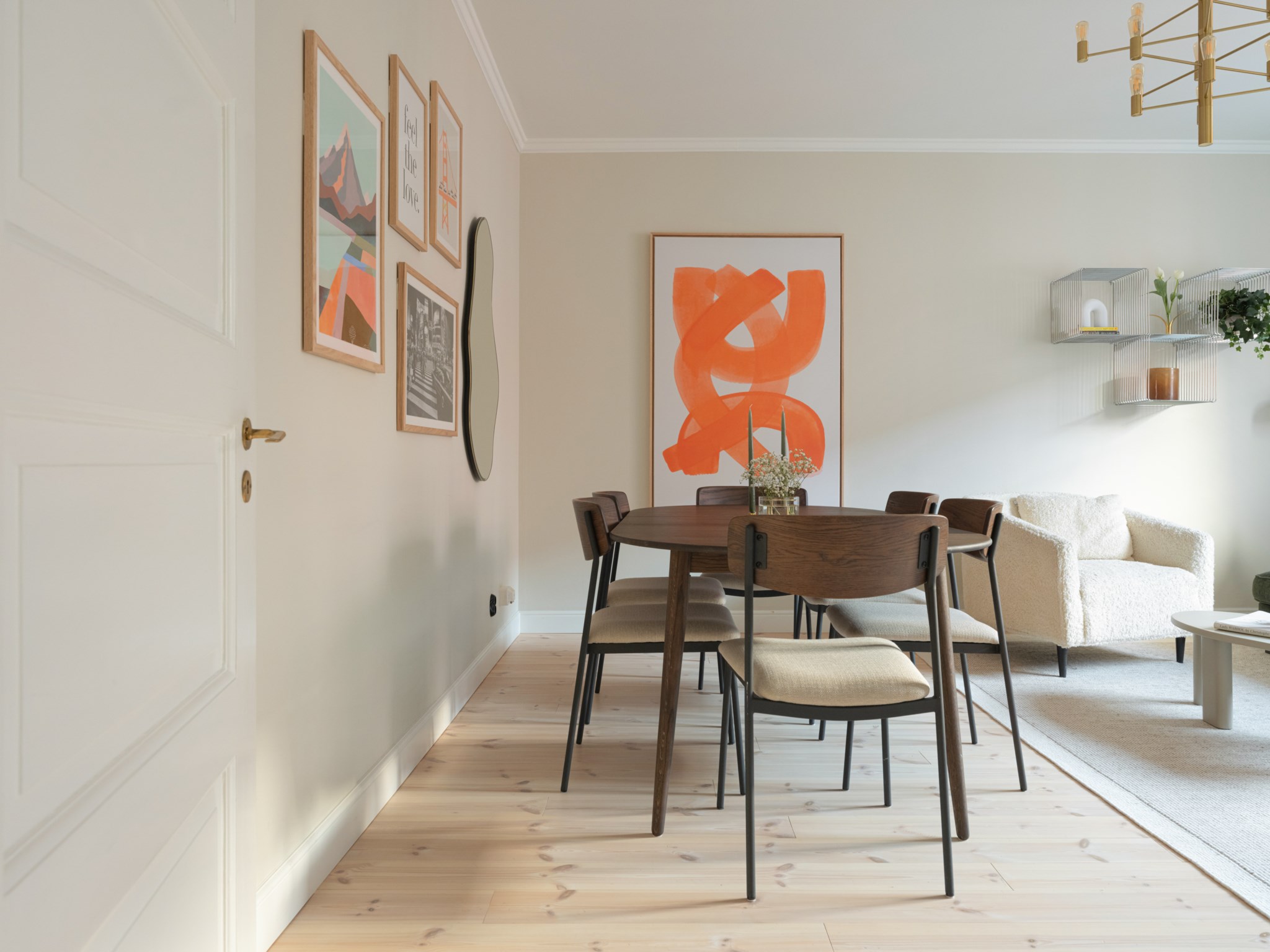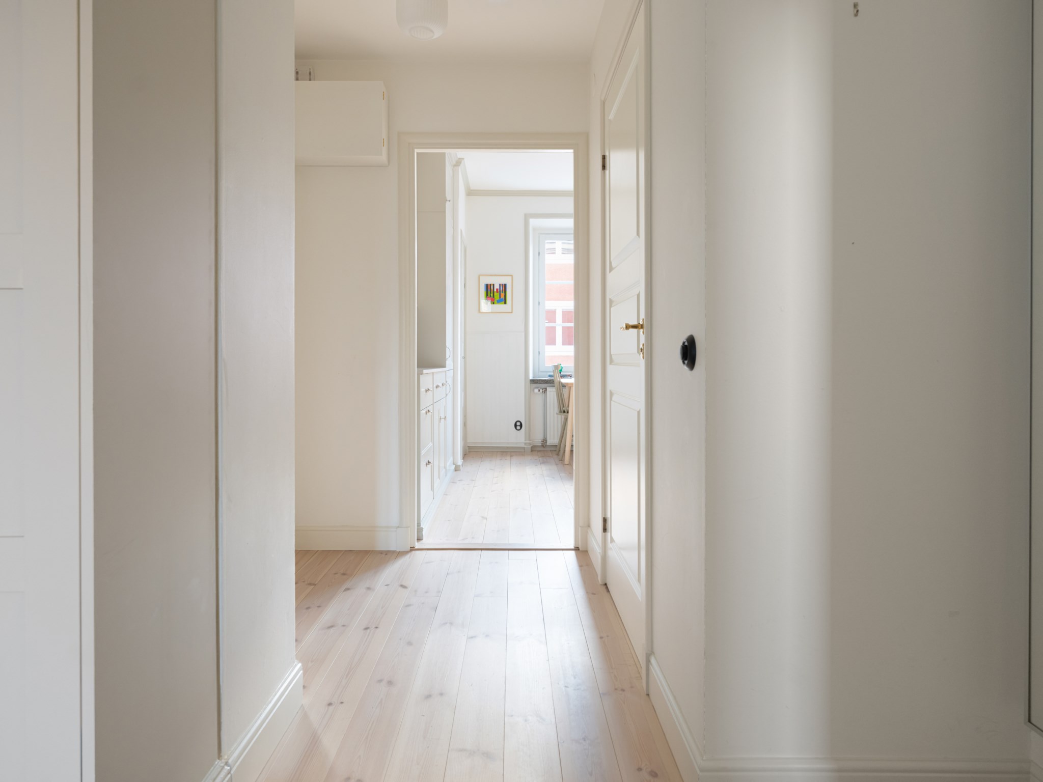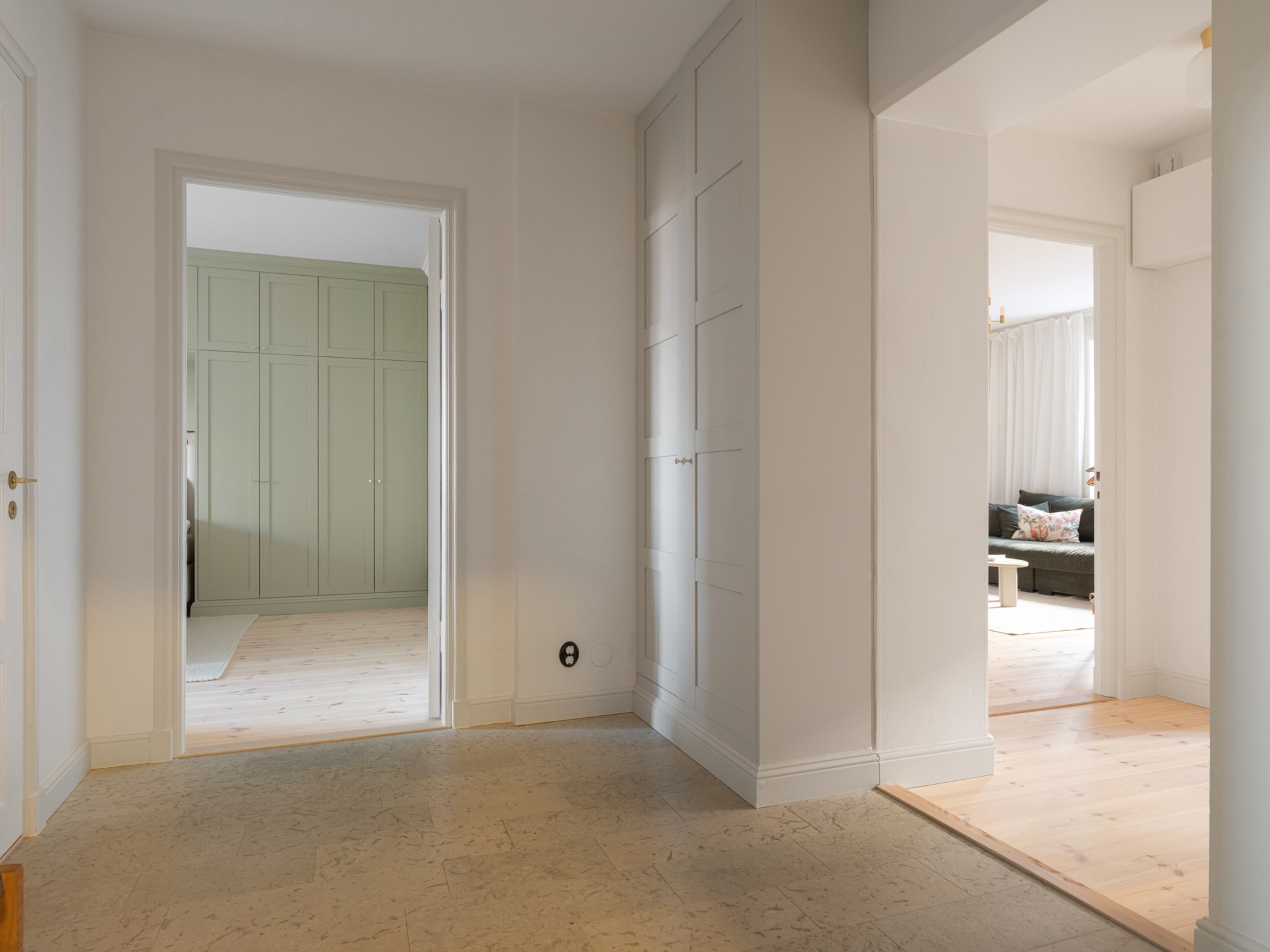 Välkomnande hall med plats för eget möblemang om så önskas. Redan vid entrén möts du av lägenhetens charm med harmoniska färgval och ljusa ytskikt. Hallen utgör en central del av hemmet och leder vidare till samtliga rum. Platsbyggd garderob för bra förvaring.