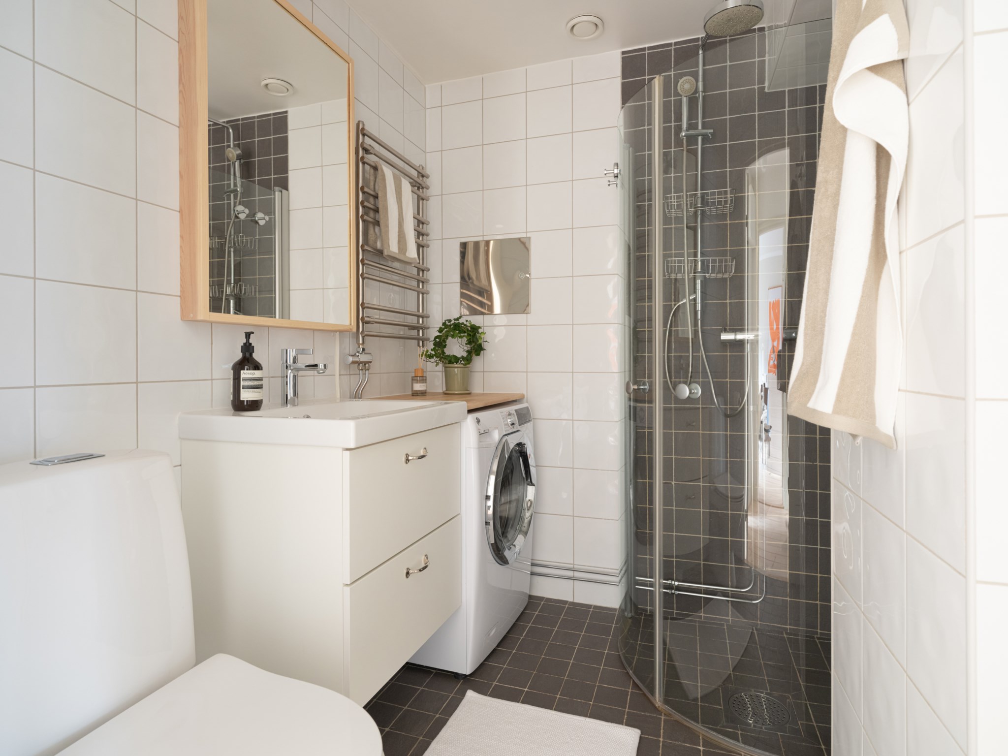 Modernt helkaklat badrum med ljusa väggar och mörkt golv. Badrummet är stilfullt inrett med WC, handfat med kommod, spegel samt tvättmaskin. Här finns även handdukstork. Duschhörnan är utrustad med takdusch och vikbara duschdörrar som ger en lyxig och praktisk känsla.