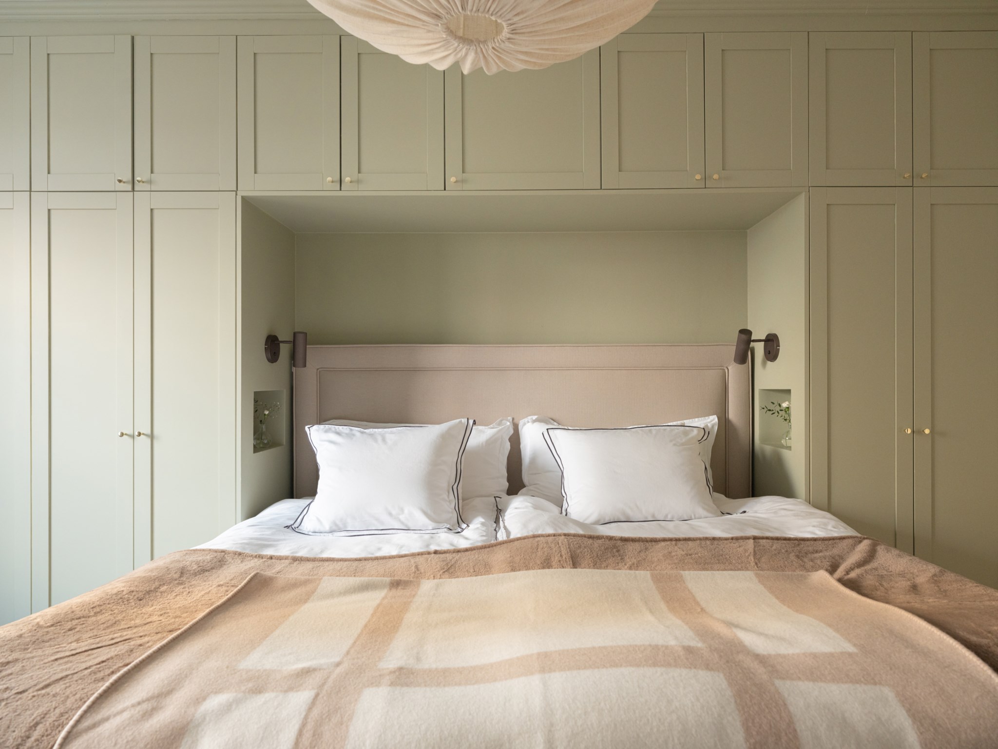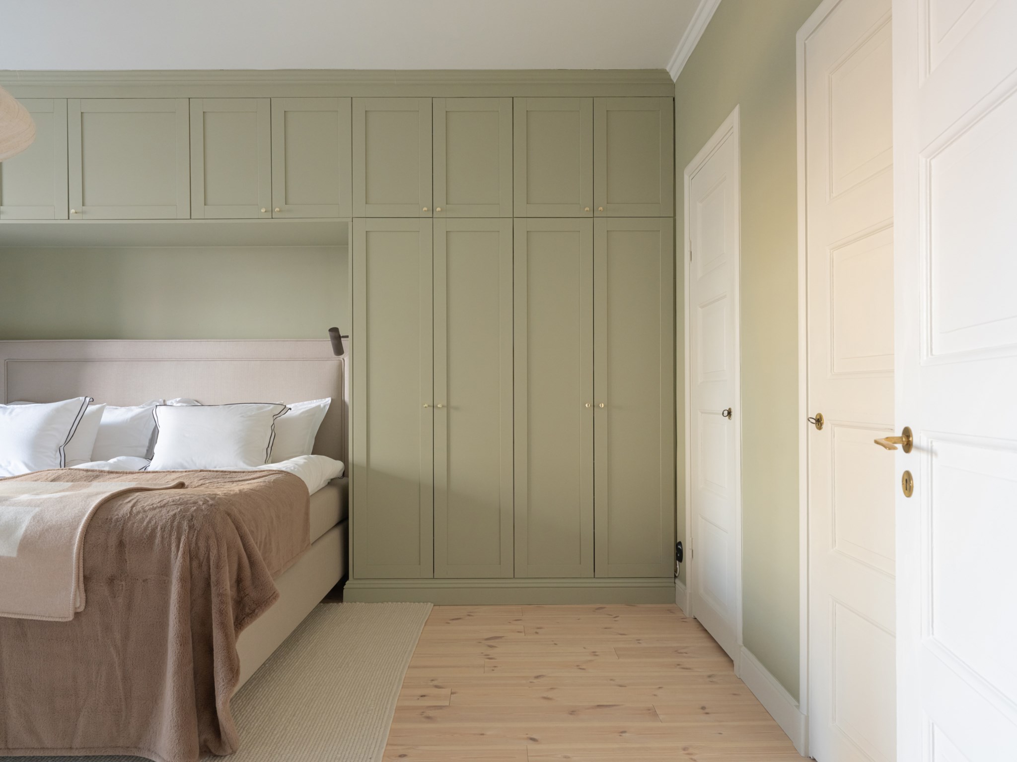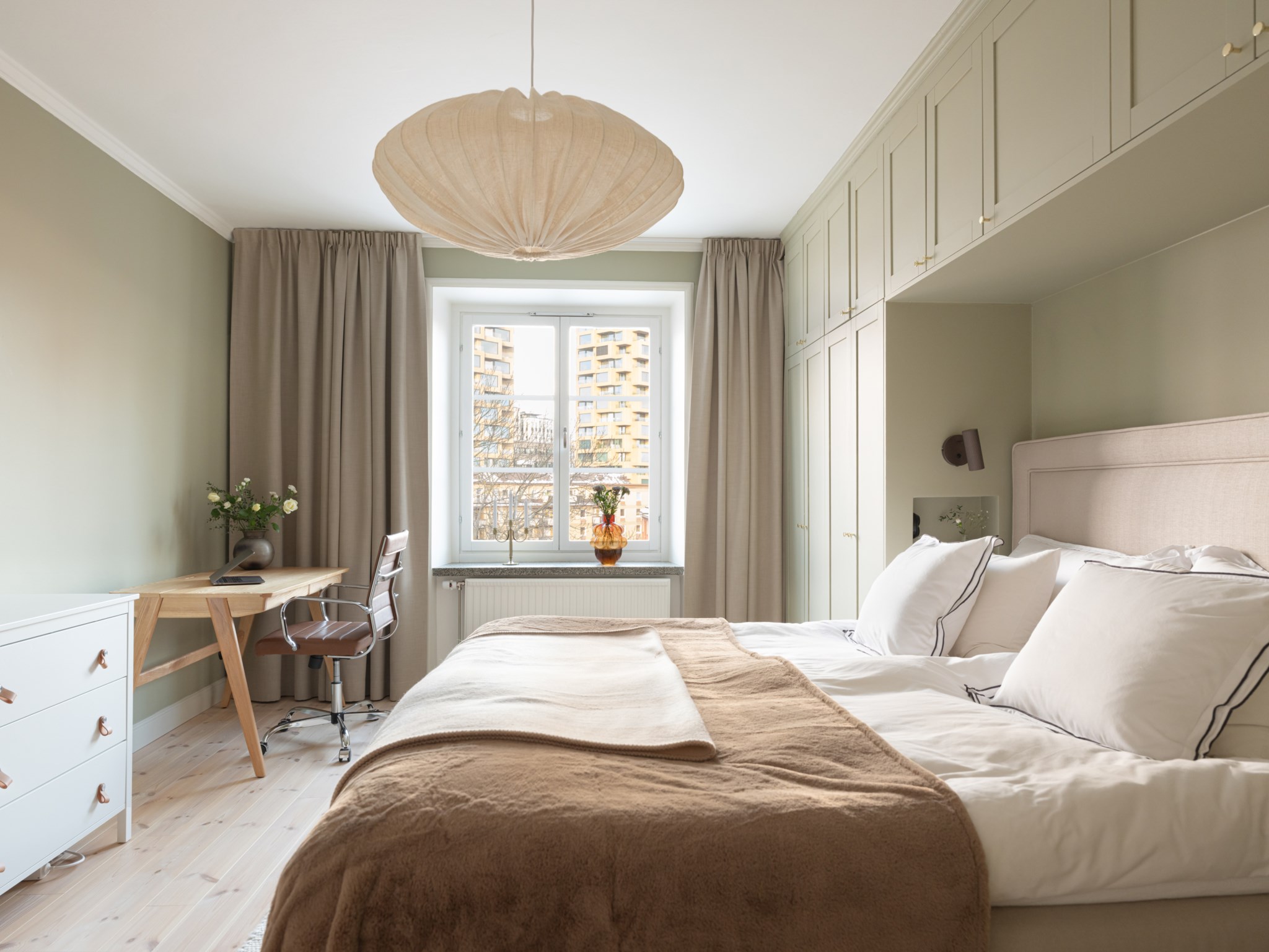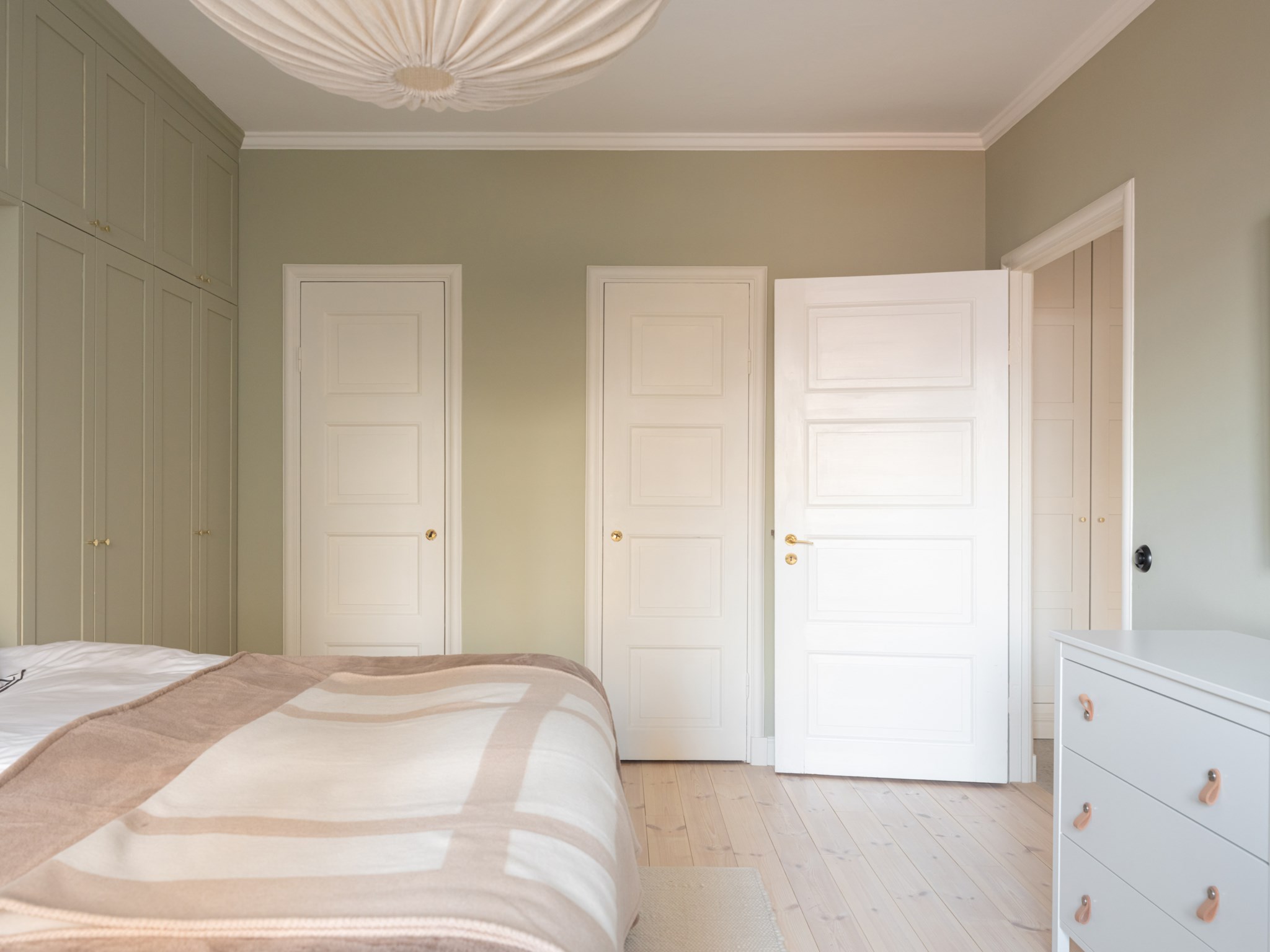 Rogivande sovrum med fint ljusinsläpp från fönstret. Harmoniska färgval och ljust golv skapar en lugn och trivsam atmosfär. Goda förvaringsmöjligheter erbjuds genom inbyggda garderober längs ena väggen samt ytterligare två inbyggda garderober placerade på en annan vägg. Rummet ger plats för en större säng samt önskad inredning.