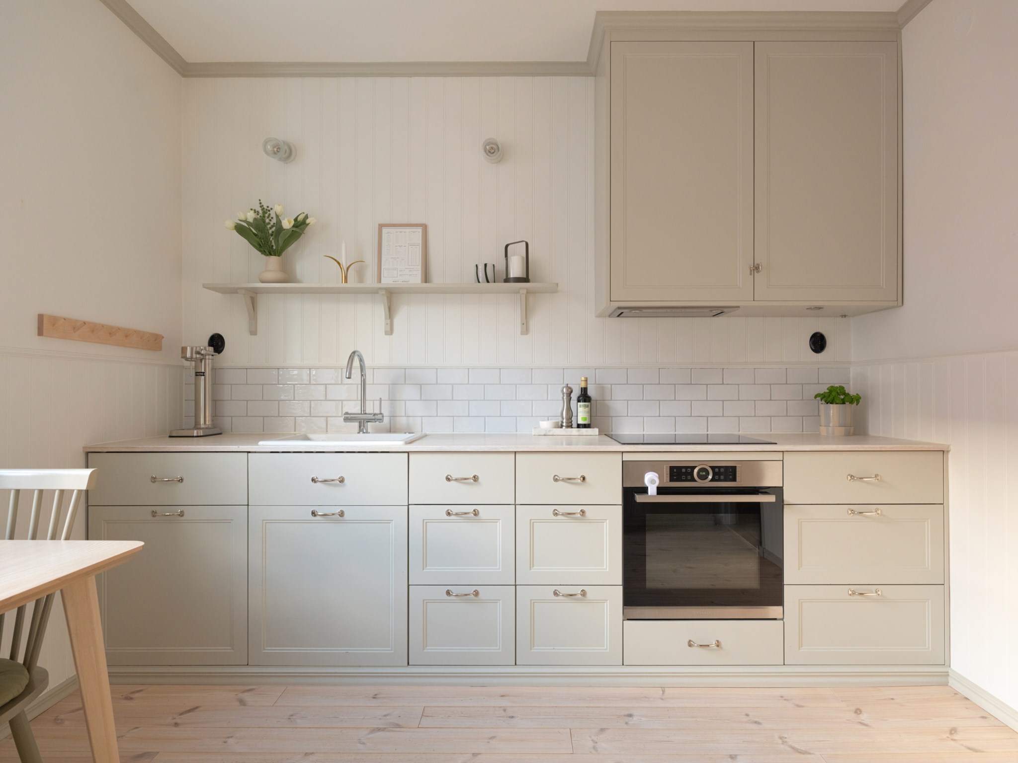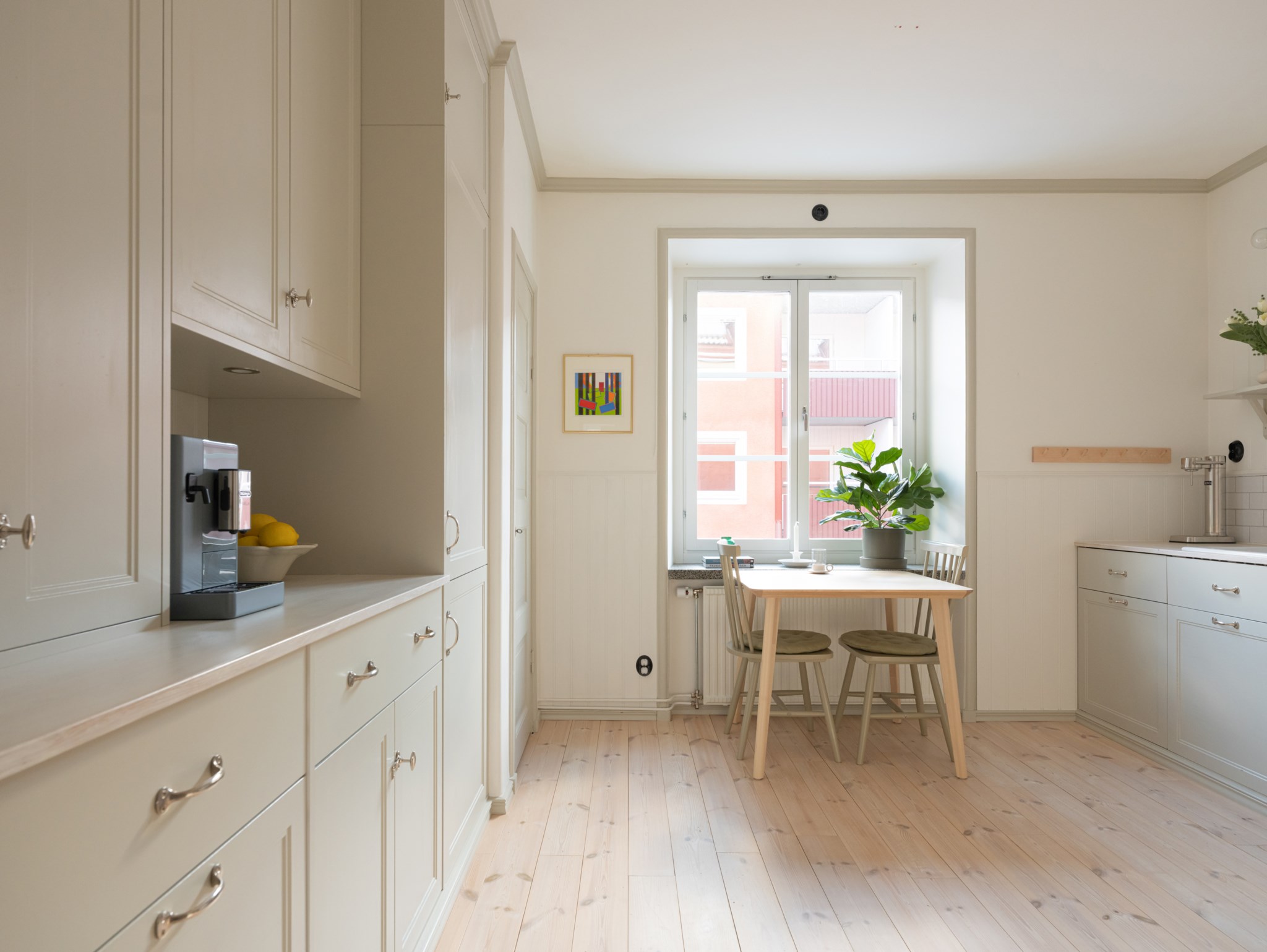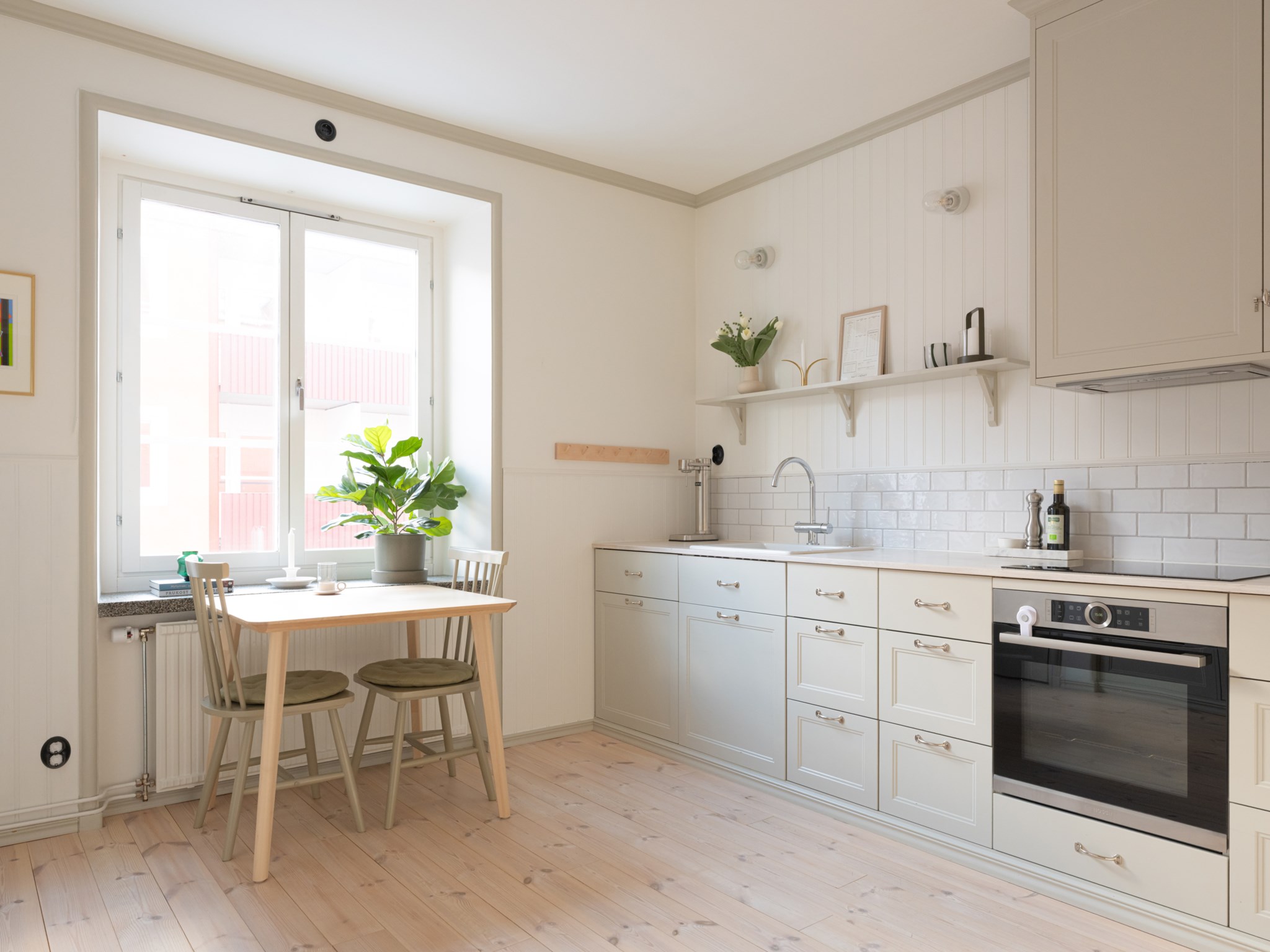 Stilrent och modernt kök med generös förvaring och goda arbetsytor. Ljusa köksluckor i harmonisk kulör kombineras med vacker bänkskiva och ljust kakel som stänkskydd. Här finns en naturlig plats för matbord, och fönstret ger ett fint ljusinsläpp. Köket är välutrustat med diskmaskin, spis, ugn samt kyl/frys. Vackert gammalt torrskafferi finns bevarat.