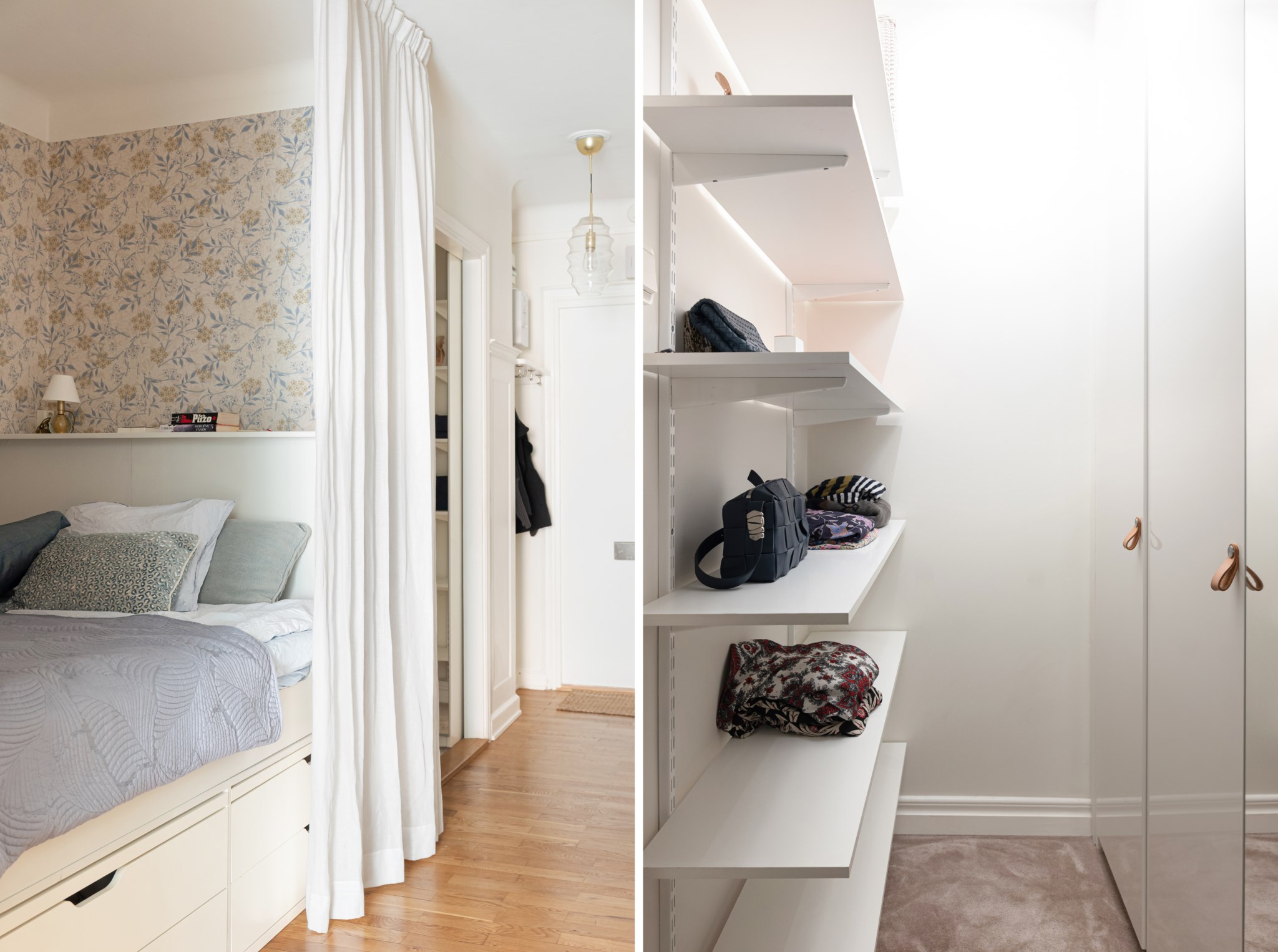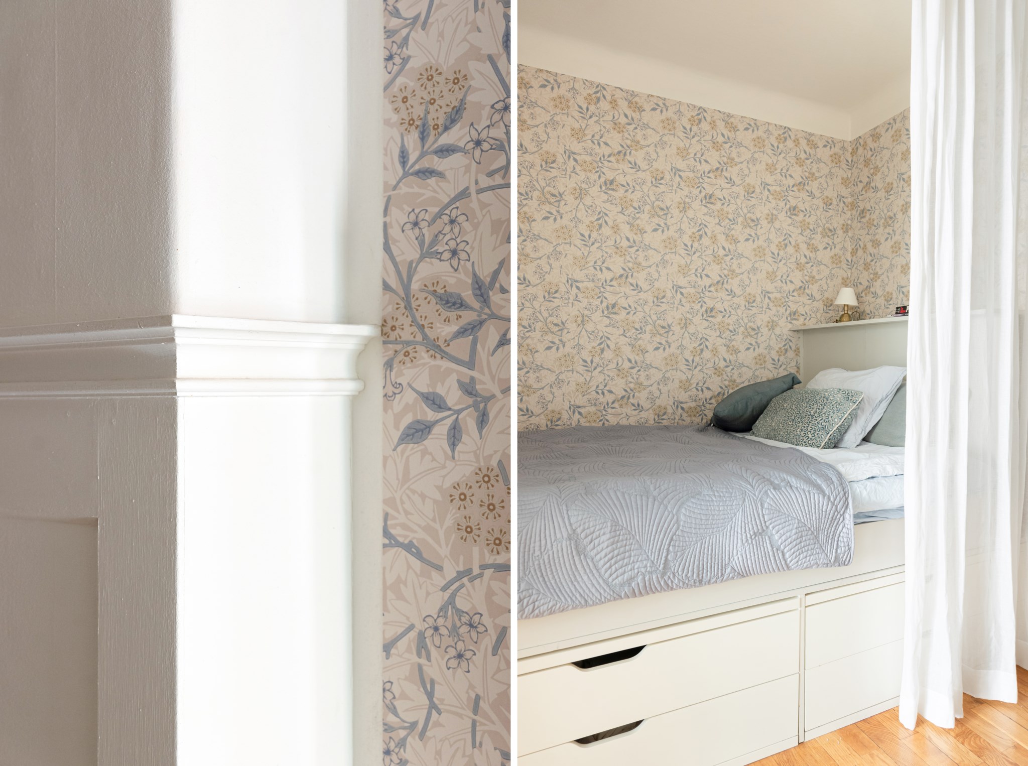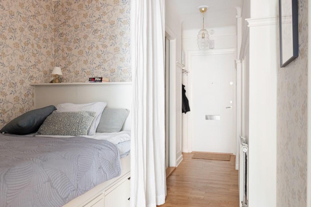 I anslutning till hallen finns en optimalt planerad sovalkov. Ytskikten består av väggar i en blommiga tapet och ljust golv.