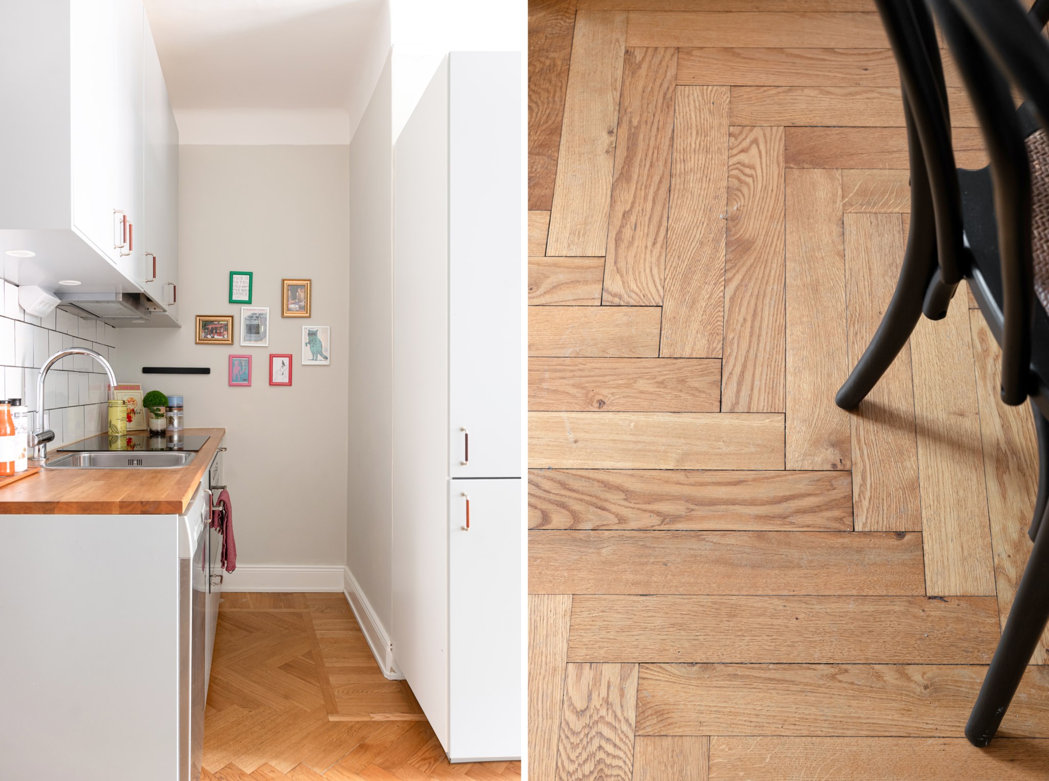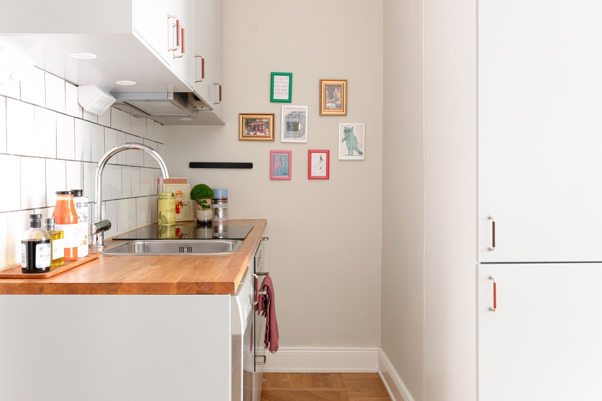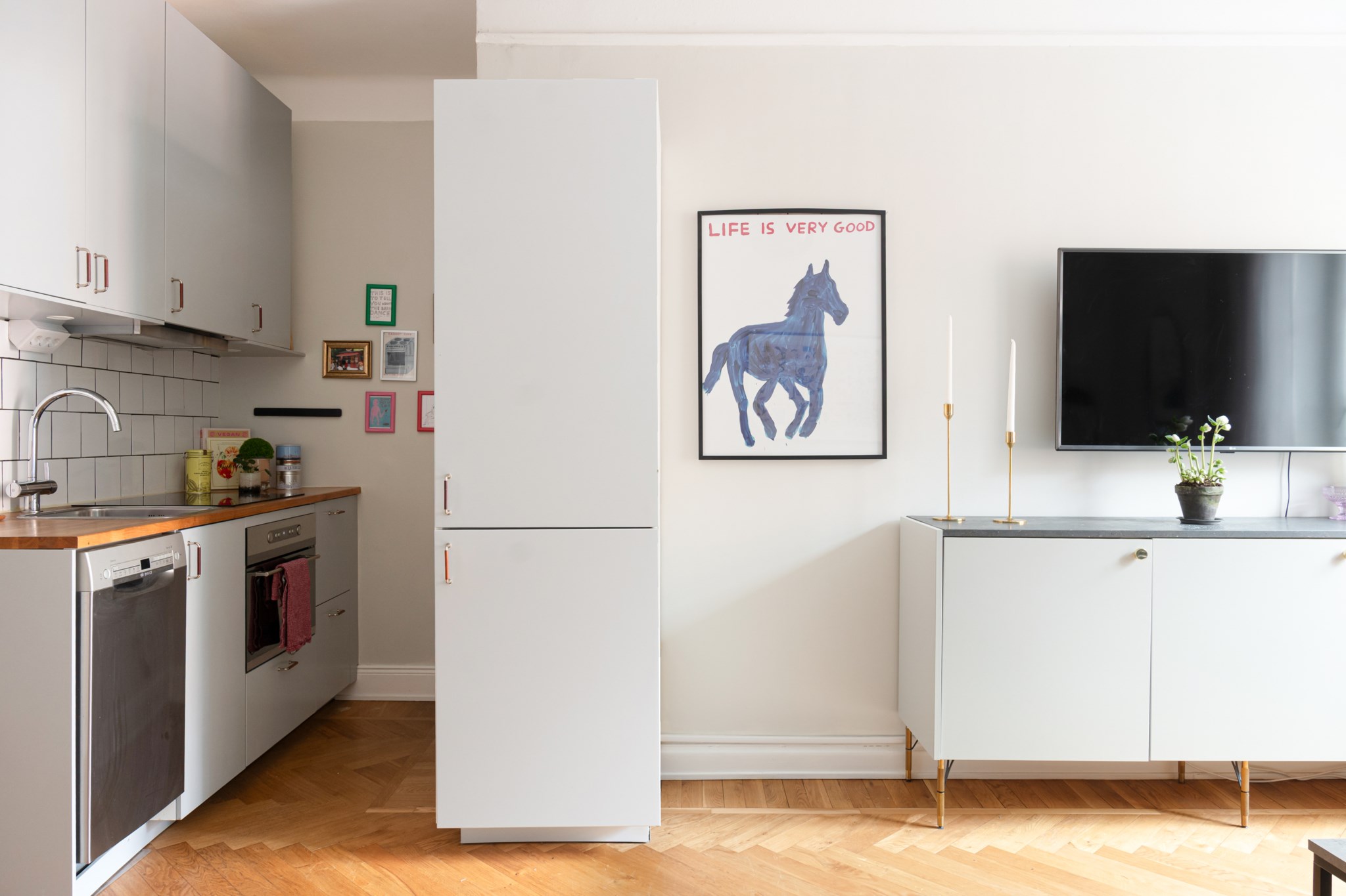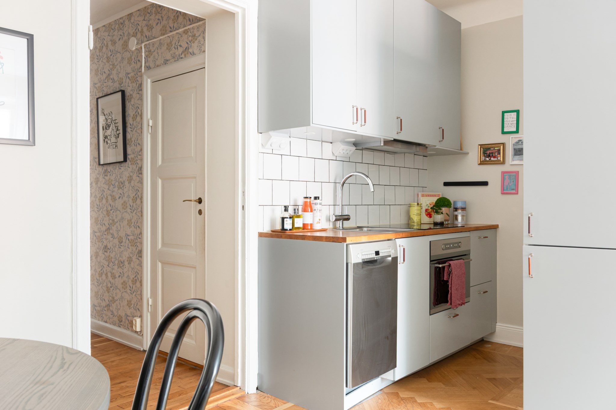 Modernt kök med väl utvalda material val i form av köksluckor i vitt och arbetsyta ovan i ljus träskiva. Köket ligger i social anslutning till vardagsrummet. Utrustat med diskho, spis, fläkt, ugn, diskmaskin samt kyl och frys. Ytskikten består av ljusa väggar i grå nyans och ljus fiskbensparkett.