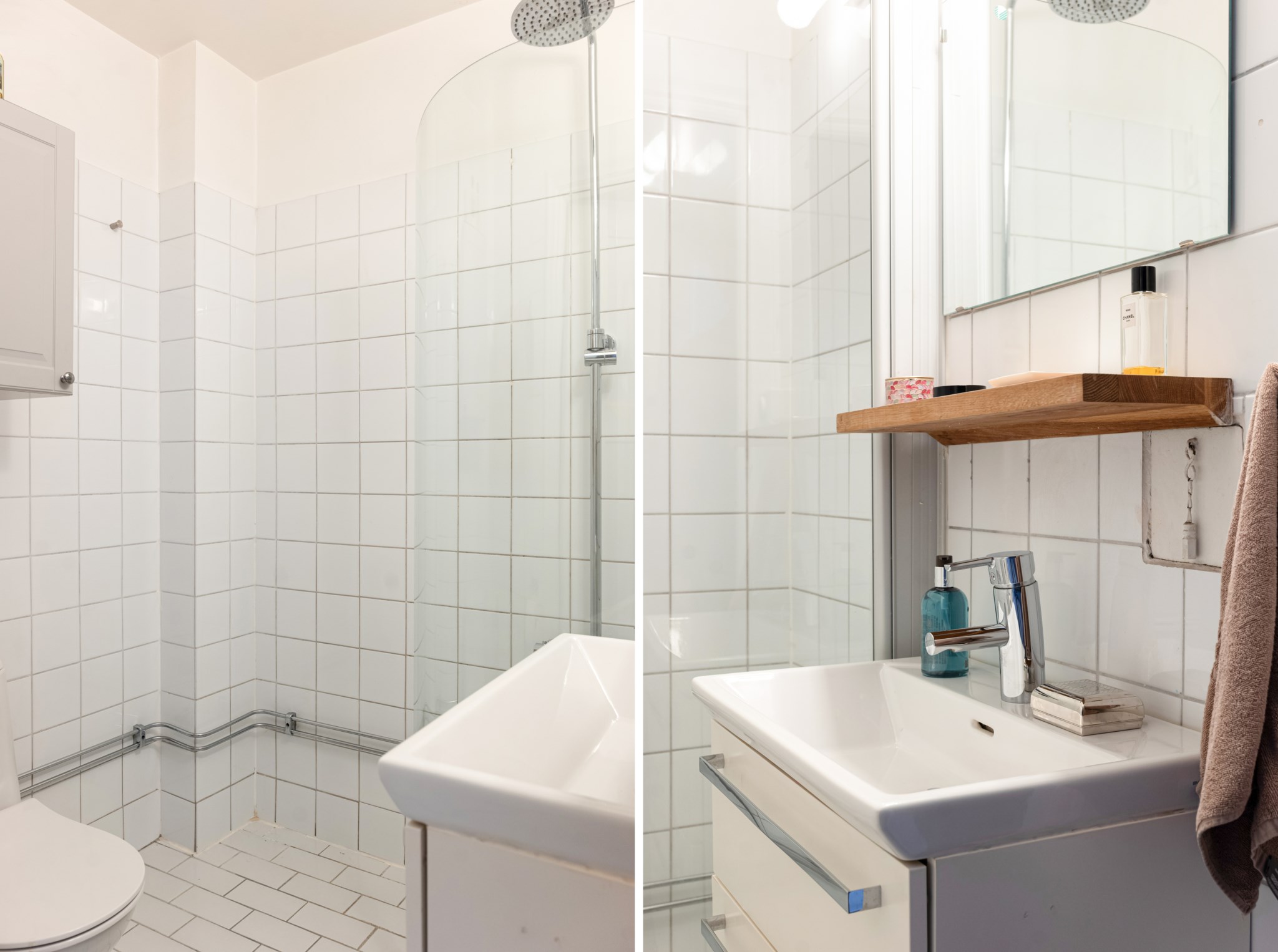 Kaklat badrum med vitt kakel och vitt klinker. Badrummet är utrustat med WC, handfat ovan kommod, väggskåp samt dusch med glasväggar.