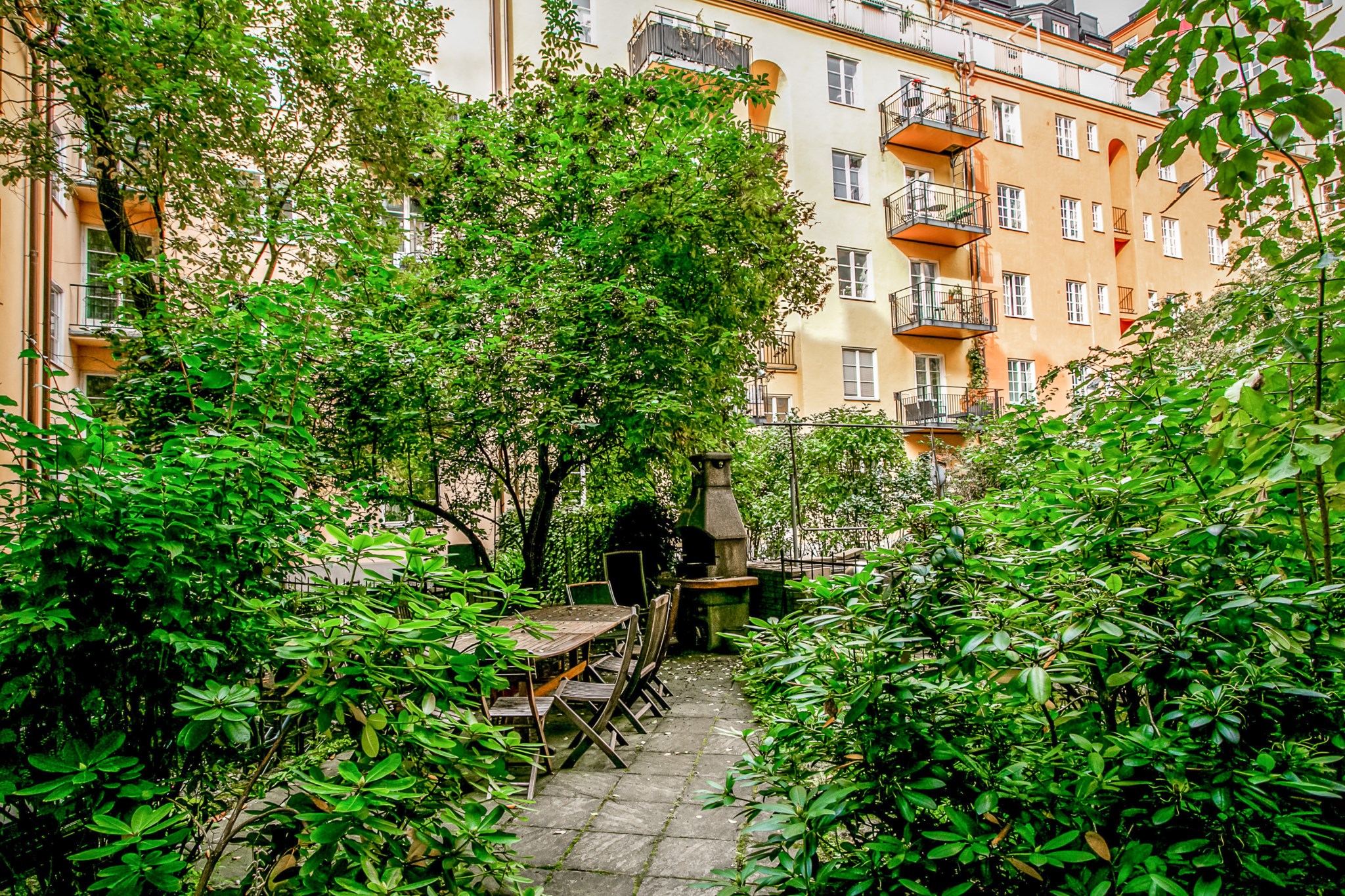 - Uteplats på innergården. Här finns bord, stolar och grill.