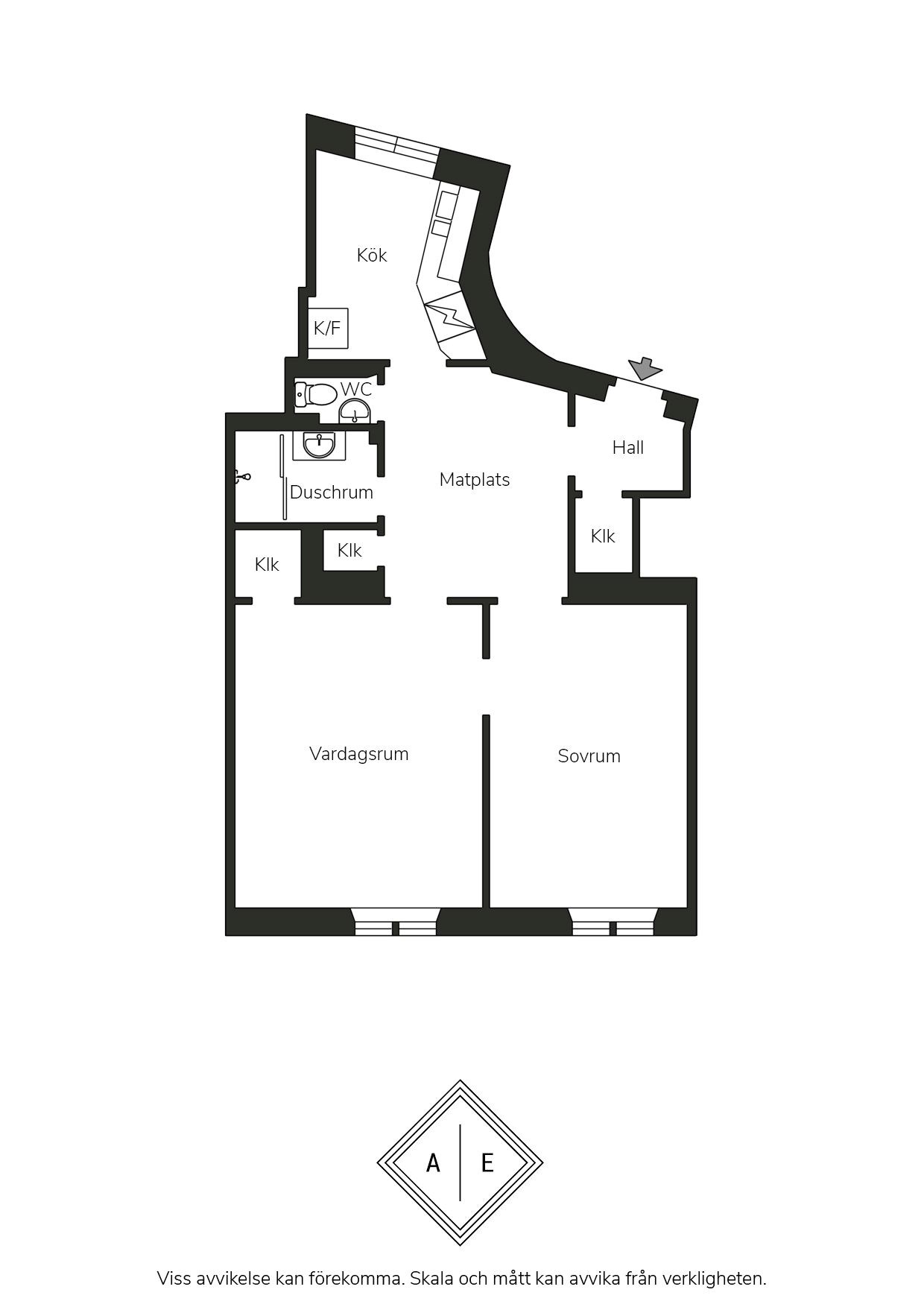I öppen planlösning mellan kök och vardagsrum återfinns en inre hall som med fördel kan nyttjas som matsal. Ytskikt bestående av ljusa väggar och ljus fiskbensparkett.